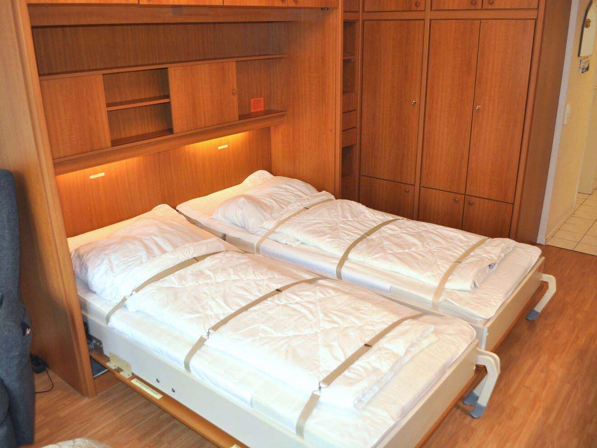 Für die Nacht lässt sich ganz einfach das Bett (2 Betten 90x200) ausklappen und am Tag klappen Sie es wieder zu, um den kompletten Raum zu nutzen.