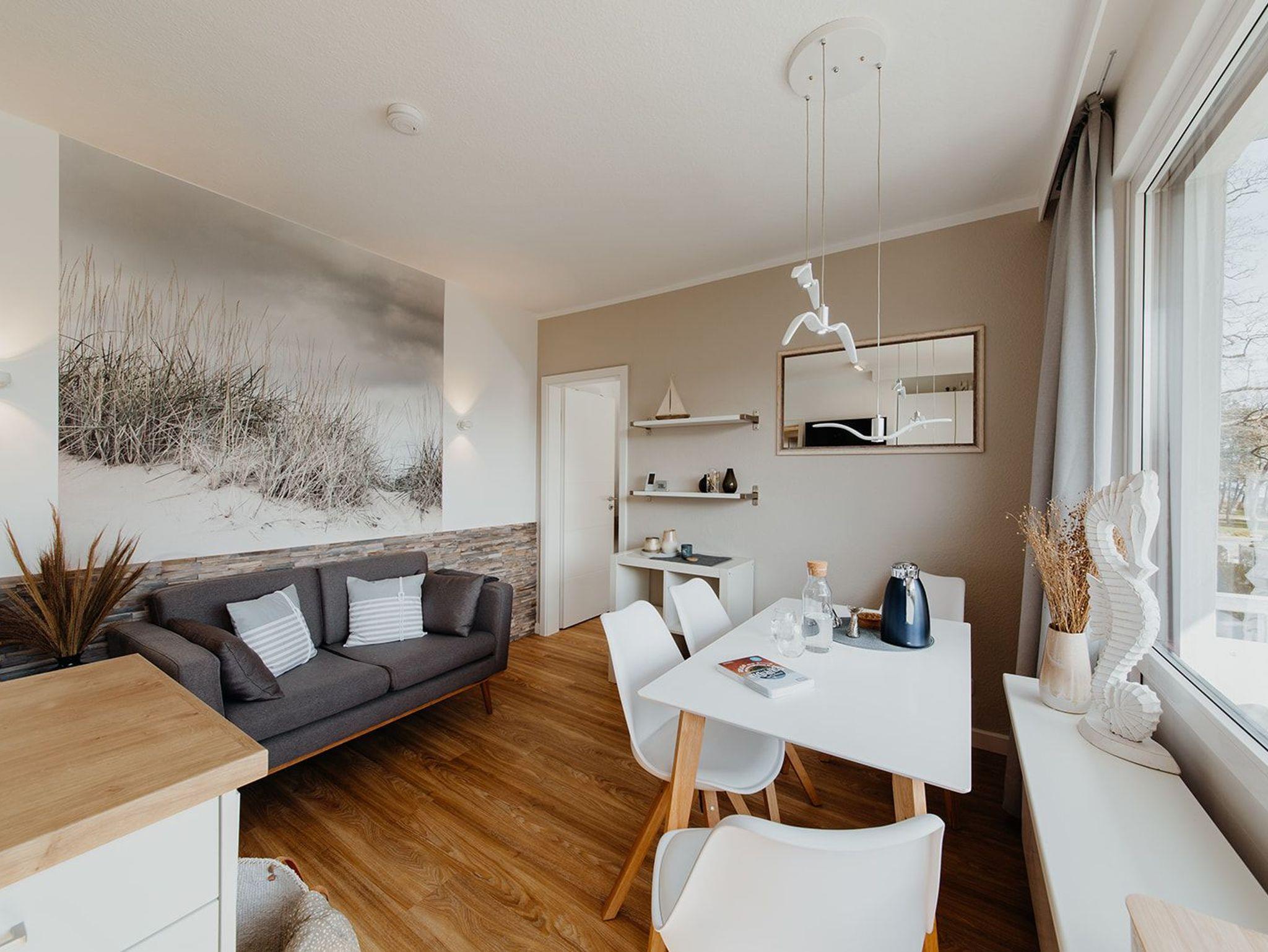 Klein aber fein, hell und freundlich und gespickt mit vielen liebevollen Details präsentiert sich die Ferienwohnung No. 188. Jeder qm ist optimal genutzt und mit ausreichend Ablageflächen, Stauraum und Haken versehen. Es gibt zwei separate Schlafzimmer, ausgestattet mit Doppelbett (180x200), Einzelbett mit Auszug (160x200), Verdunkelungsvorhängen und TV. Strandflair pur ist im Wohnbereich zu finden, der mit einem Sofa und einem Essbereich für 4 Personen ausgestattet ist. Die integrierte kleine Einbauküche fügt sich wunderbar ein und ist bestens ausgestattet. Vom vorgelagerten Sonnenbalkon mit elektrischer Markise und Gartenmöbeln kann man die Ostsee nicht nur hören sondern auch blitzen sehen.