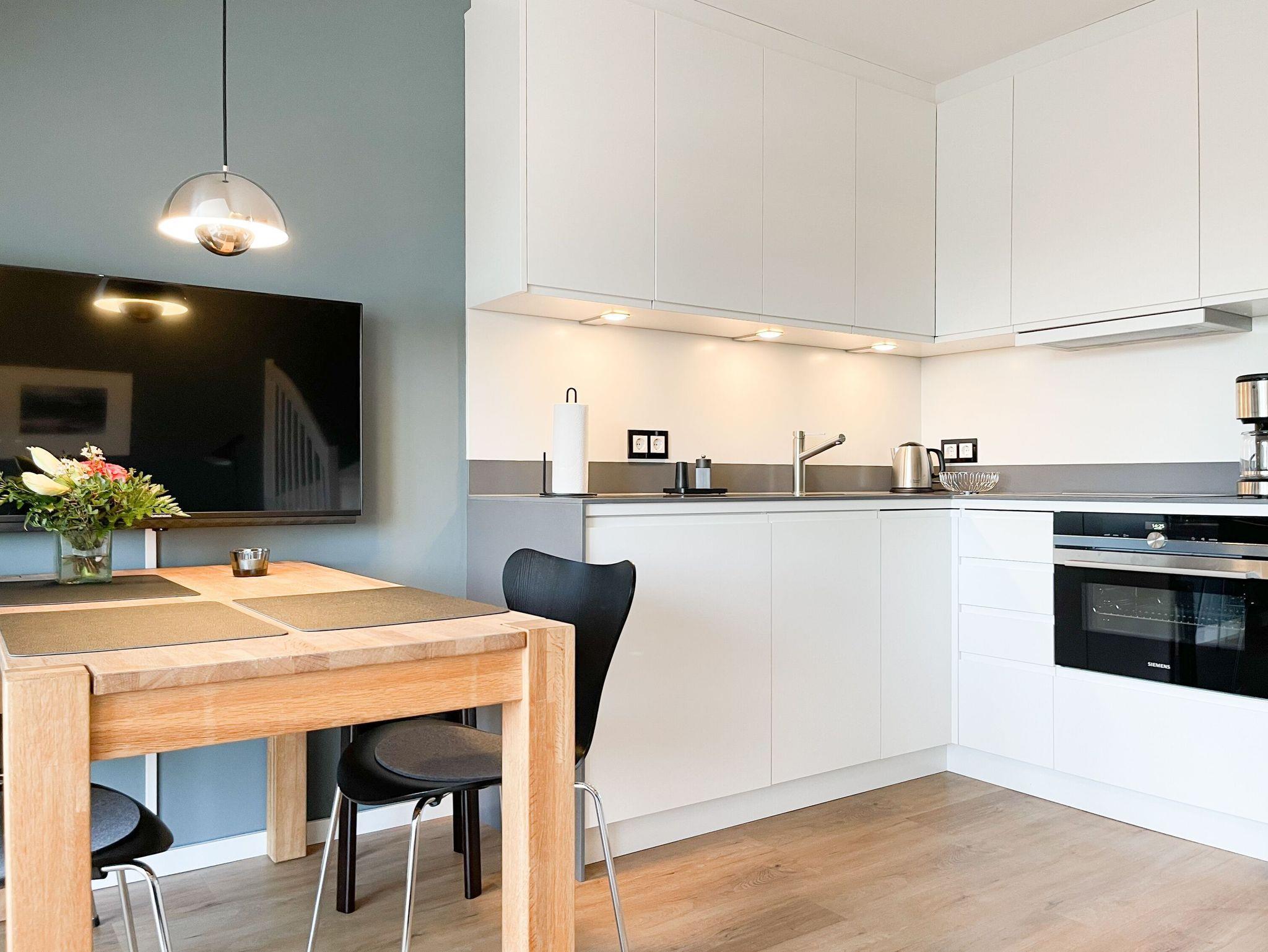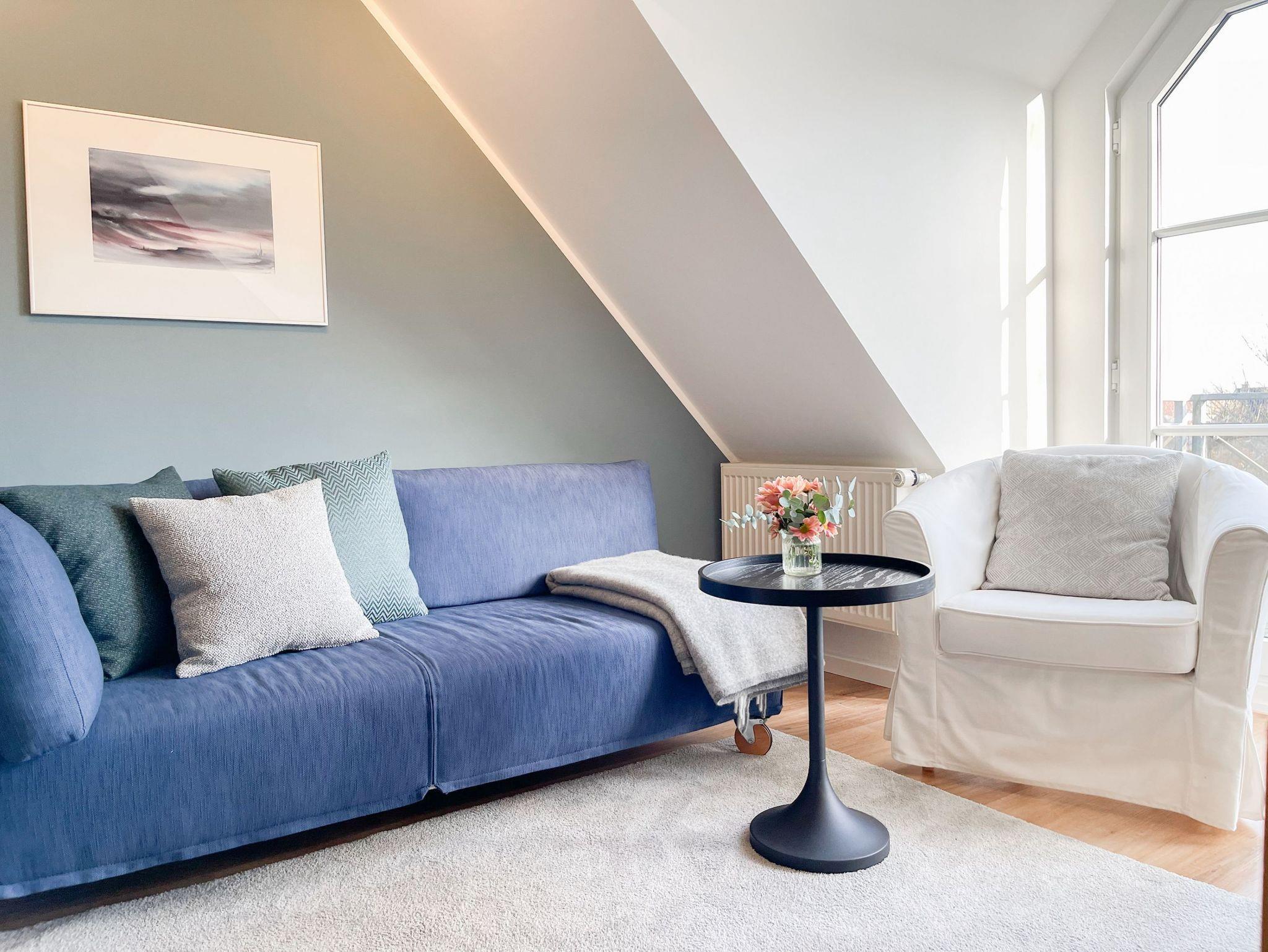 Die lichtdurchflutete Maisonette liegt im 2. Obergeschoss und erstreckt sich über zwei Ebenen zur sonnigen Süd-Ost-Seite. Die stilvolle, skandinavische Einrichtung mit liebevollen Details schafft ein behagliches Ambiente für zwei Personen. Der hochwertig eingerichtete Wohn- und Essbereich bietet neben einem TV und einem Bluetoothradio selbstverständlich auch kostenloses WLAN. Die vom Tischler angefertigte, voll ausgestattete Küche lässt keine Wünsche offen. Das separate Schlafzimmer, ebenfalls passgenau vom Tischler, verfügt über ein Doppelbett (160cm x 200cm, getrennte Matratzen 80x200 mit Toppern) und einen Kleiderschrank. Verdunkelungsvorhänge sorgen für einen erholsamen Schlaf. Das neue, hochwertige Bad ist mit einer Dusche, WC, Waschtisch und Fenster ausgestattet.Die obere Wohnebene, erreichbar über eine Treppe vom Wohnbereich ausgehend, bietet einen weiteren gemütlichen Rückzugsort. Hier finden Sie eine Kommode/Schreibtisch, eine gemütliche Leseecke und ein Bett, das sowohl als Daybed als auch für die Nacht genutzt werden kann.