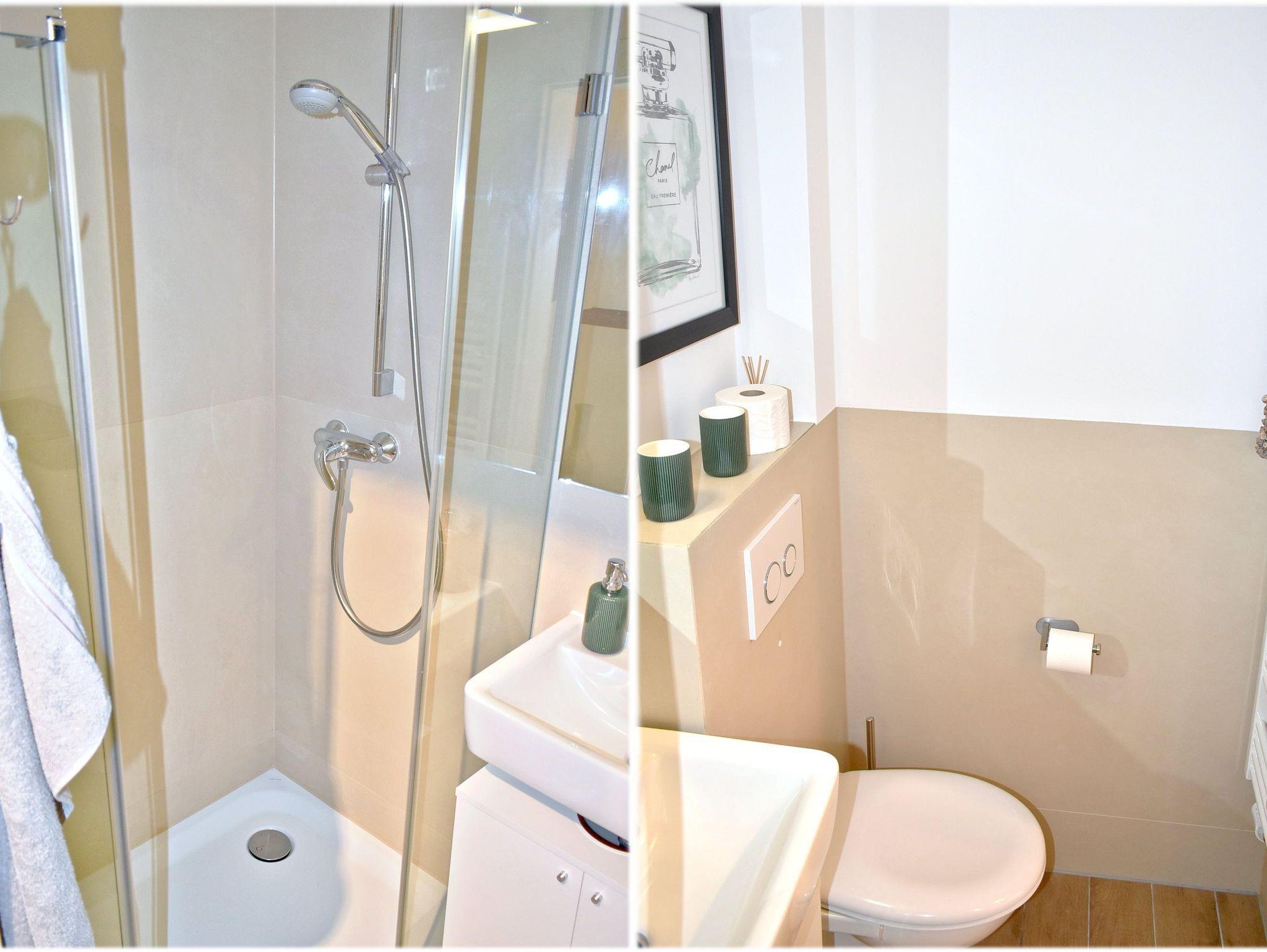 Bad 1: Dusche, Duschkabine, Spiegel, Unterschrank, Waschbecken, WC