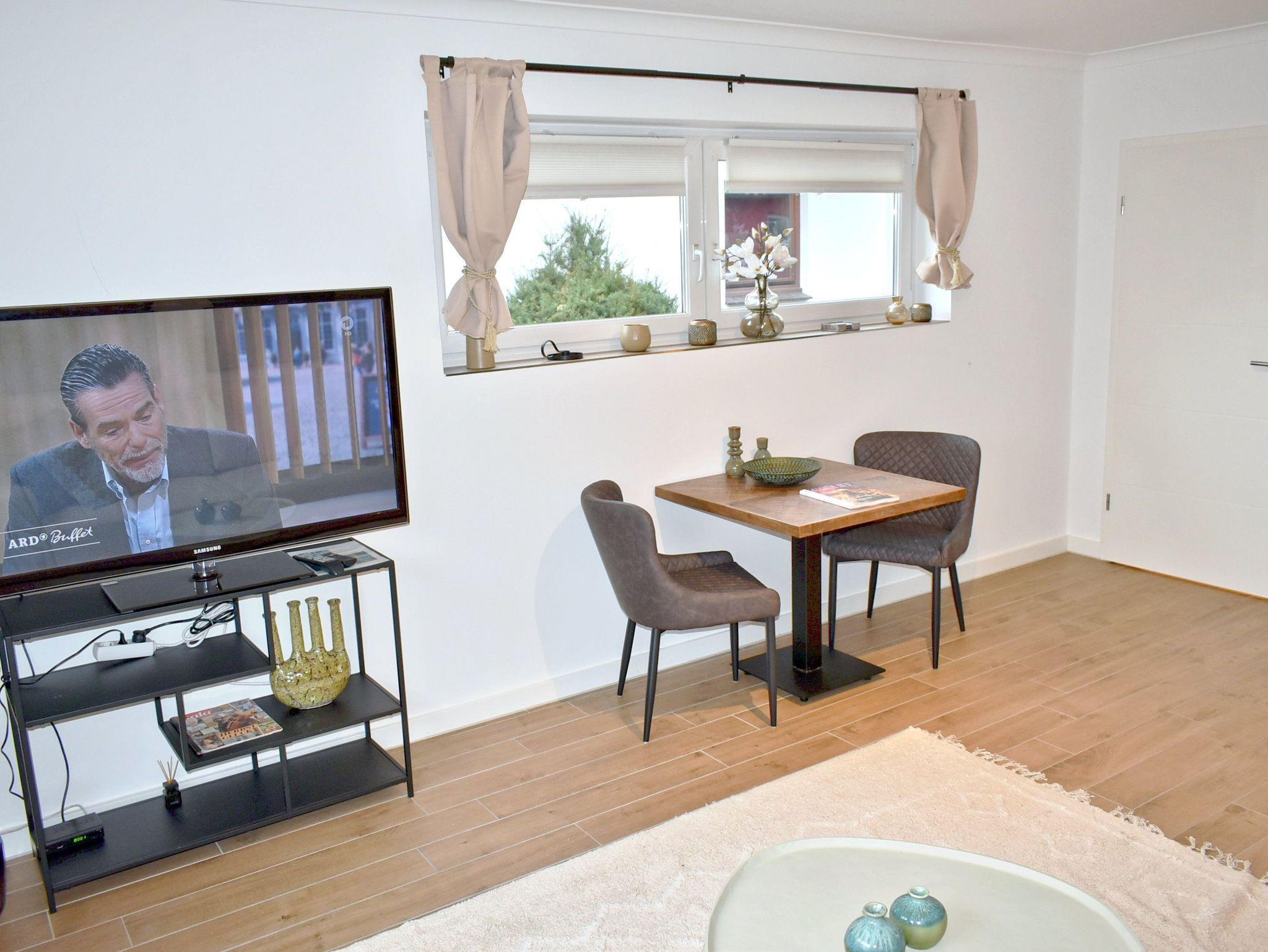 Wohnzimmer: 2 Stühle, Bodenlampe, Couchtisch, Esstisch, Flachbildschirm, Kleiderschrank, Sat-TV, Schlafcouch 2,00 x 1,50 m, Stehlampe, TV-Regal