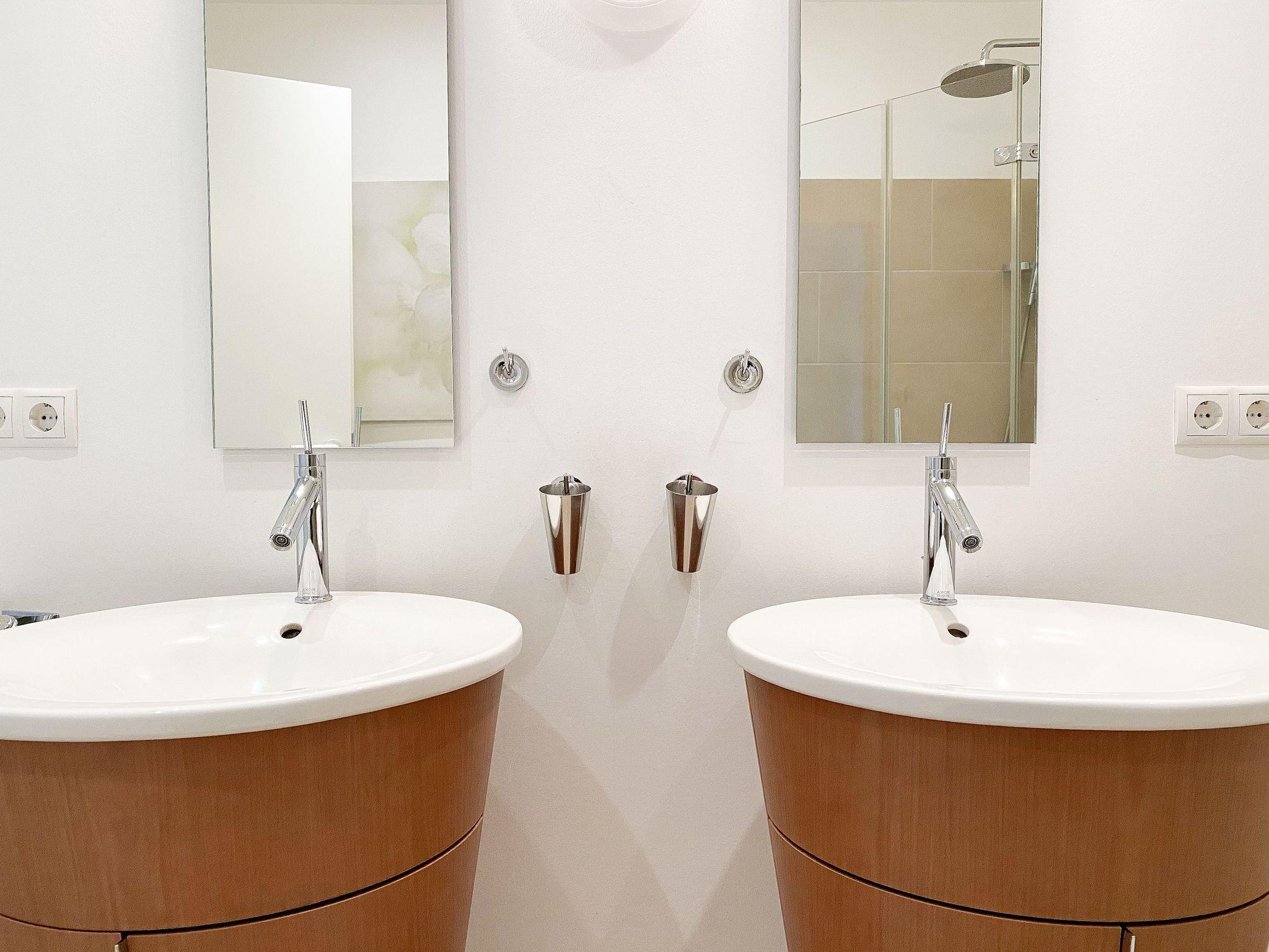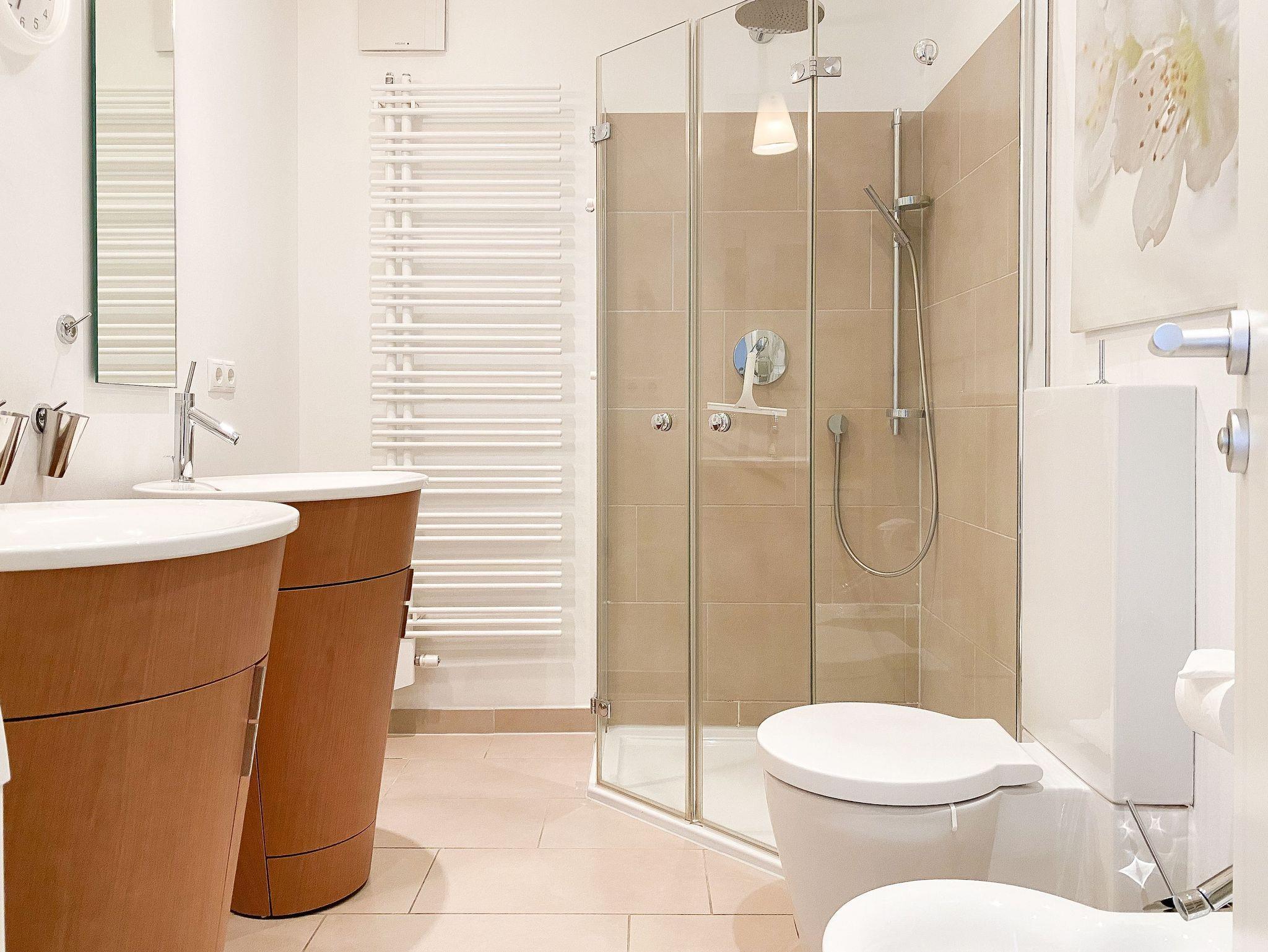 Es gibt insgesamt 2 separate Schlafzimmer mit Zugang zur Dachterrasse - eines mit Doppelbett (Boxspring 180x200) und Einbauschrank - ein weiteres mit Einzelbett und Auszug (160x200). [nbsp]Das exklusive Designbad verfügt über eine Dusche, WC, Bidet, Fön, Handtuchwärmer und eine Waschmaschine. Es steht ein geschmackvoller, großzügiger Wohnbereich (TV, Radio, CD-Player und kostenloser Internetzugang über WLAN) mit angrenzendem Essbereich zur Verfügung. Die offene, moderne Einbauküche genügt höchsten Ansprüchen und verfügt über alle technischen Geräte inklusive Dampfgarer.