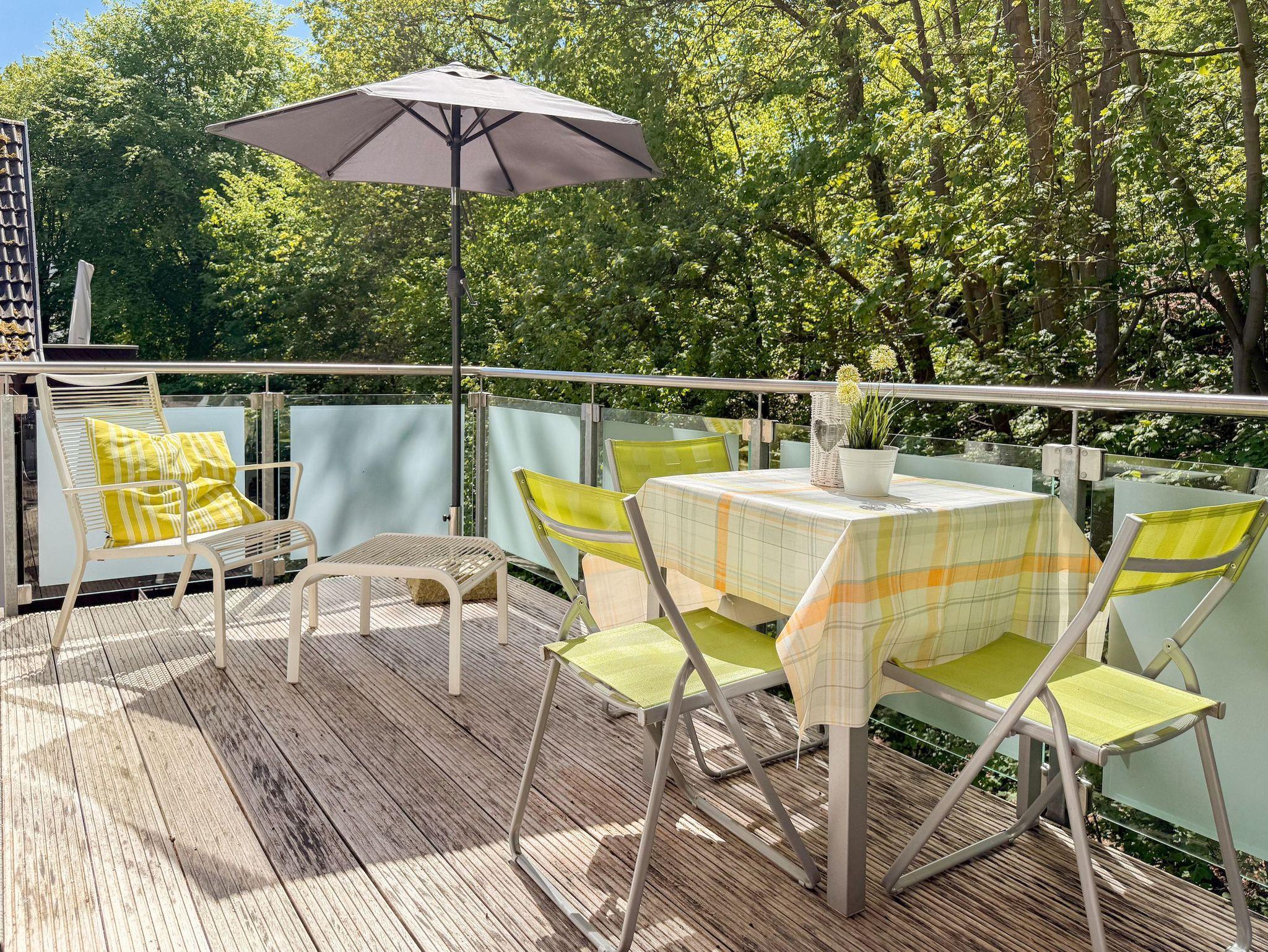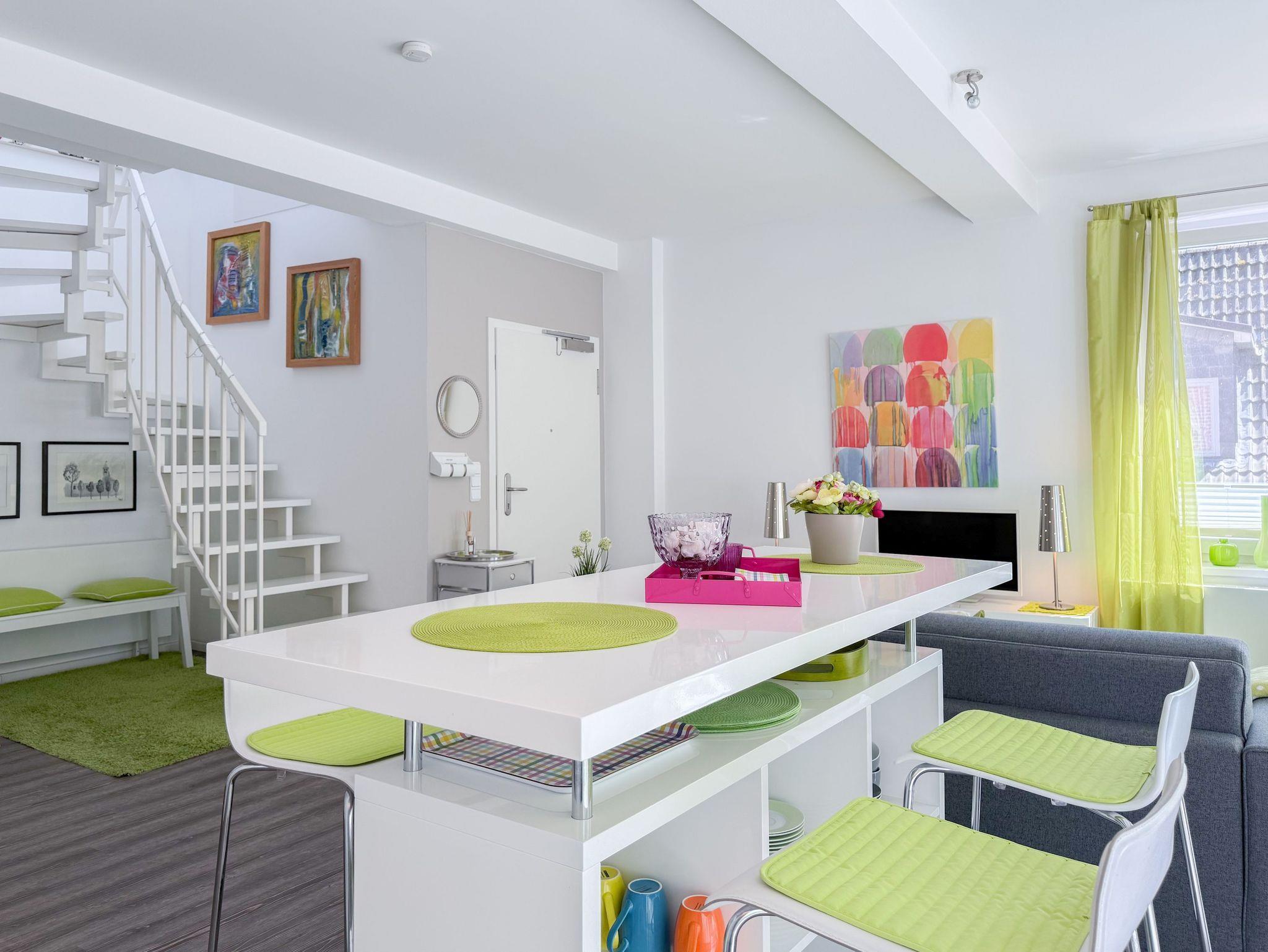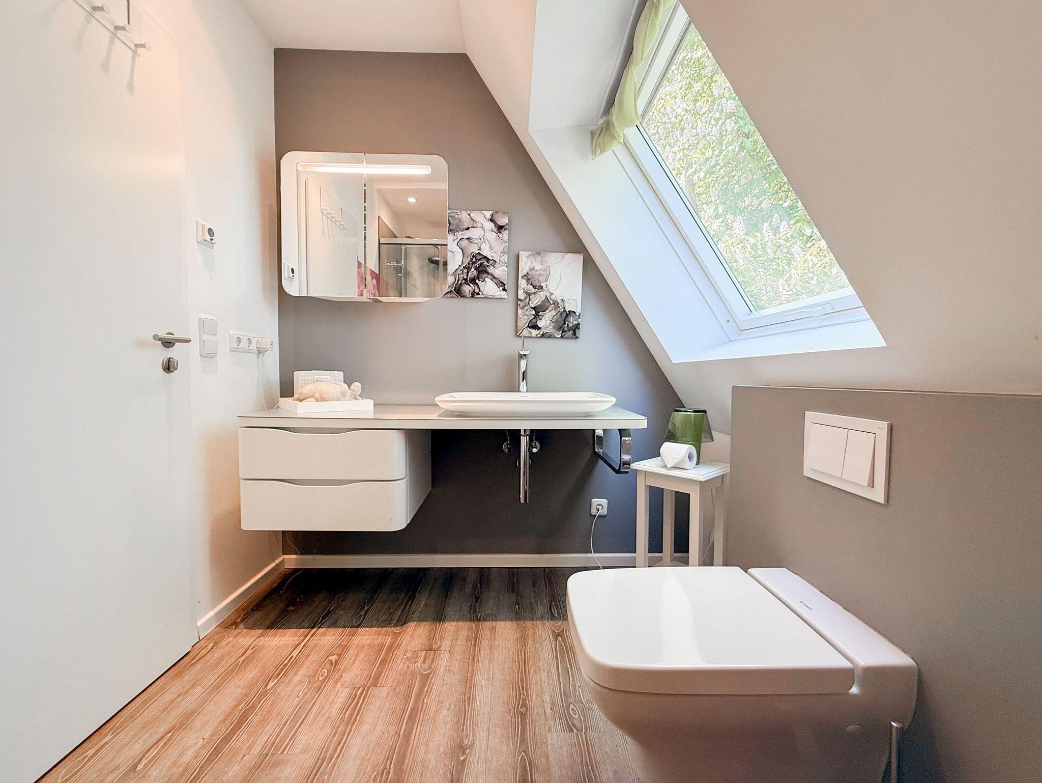 Diese Wohnung erstreckt sich über zwei Ebenen. Im unteren Bereich finden Sie einen gemütlichen Wohnbereich mit einem hochwertigen Schlafsofa, einen Essbereich sowie eine gut ausgestattete Küche. Durch eine praktische Schiebetür lässt sich der Bereich bei Bedarf verstecken. Der großzügige Balkon bietet absolute Privatsphäre und besticht durch einen herrlichen Blick ins Grüne ? perfekt für entspannte Stunden im Freien. Eine Garderobe und ein separates Gäste WC sind ebenfalls auf der unteren Wohnebene unterbracht. Das Dachgeschoss ist über eine Wendeltreppe zu erreichen. Dort gibt es eine kleine Galerie mit einem Schreibtisch ? perfekt für Workation oder kreative Pausen. Das großzügige Schlafzimmer ist mit einer Klimaanlage, einem zusätzlichen TV und Verdunkelungsvorhängen ausgestattet. Das exklusive Duschbad mit Tageslichtfenster sorgt für ein angenehmes und helles Ambiente.