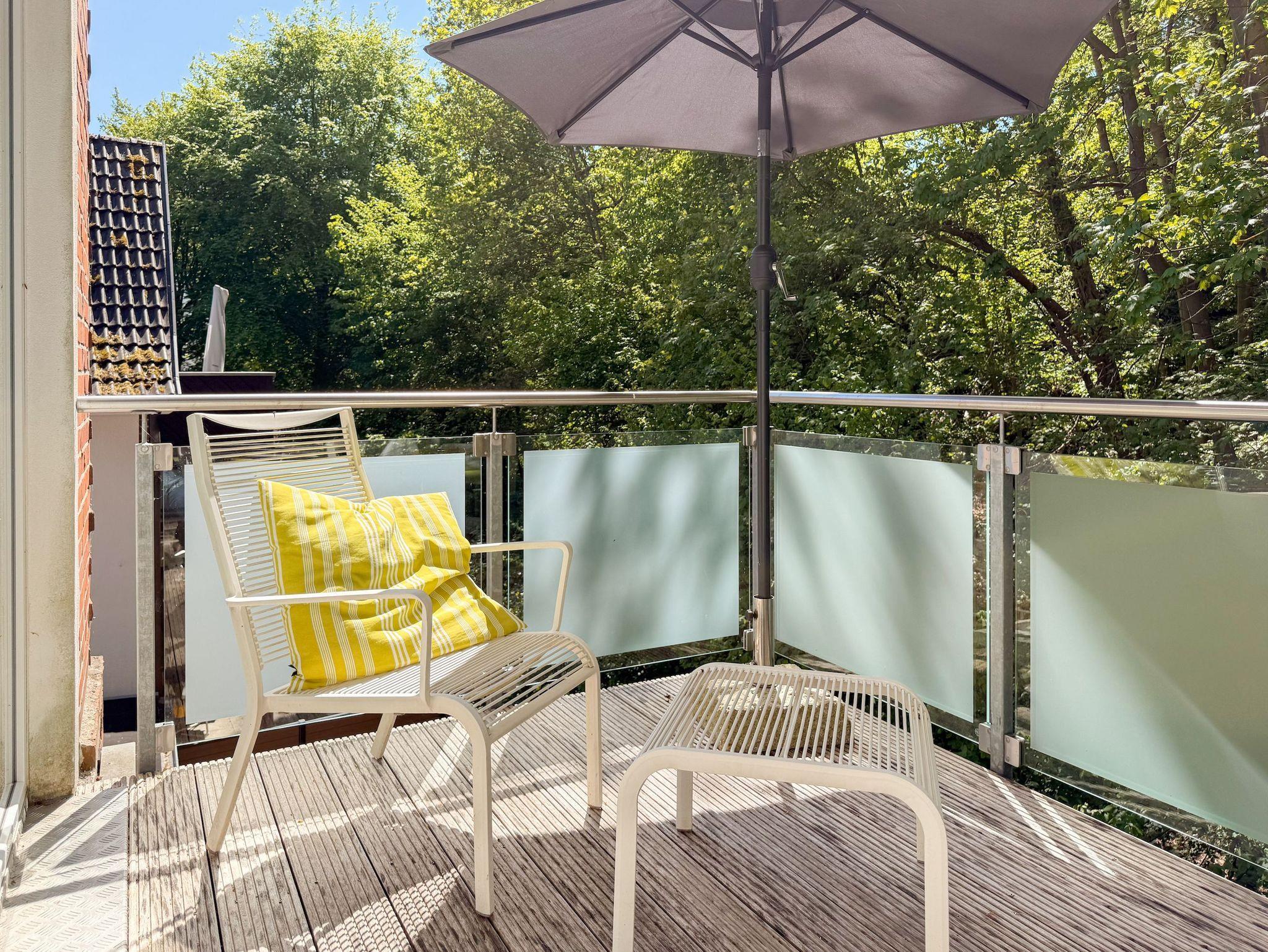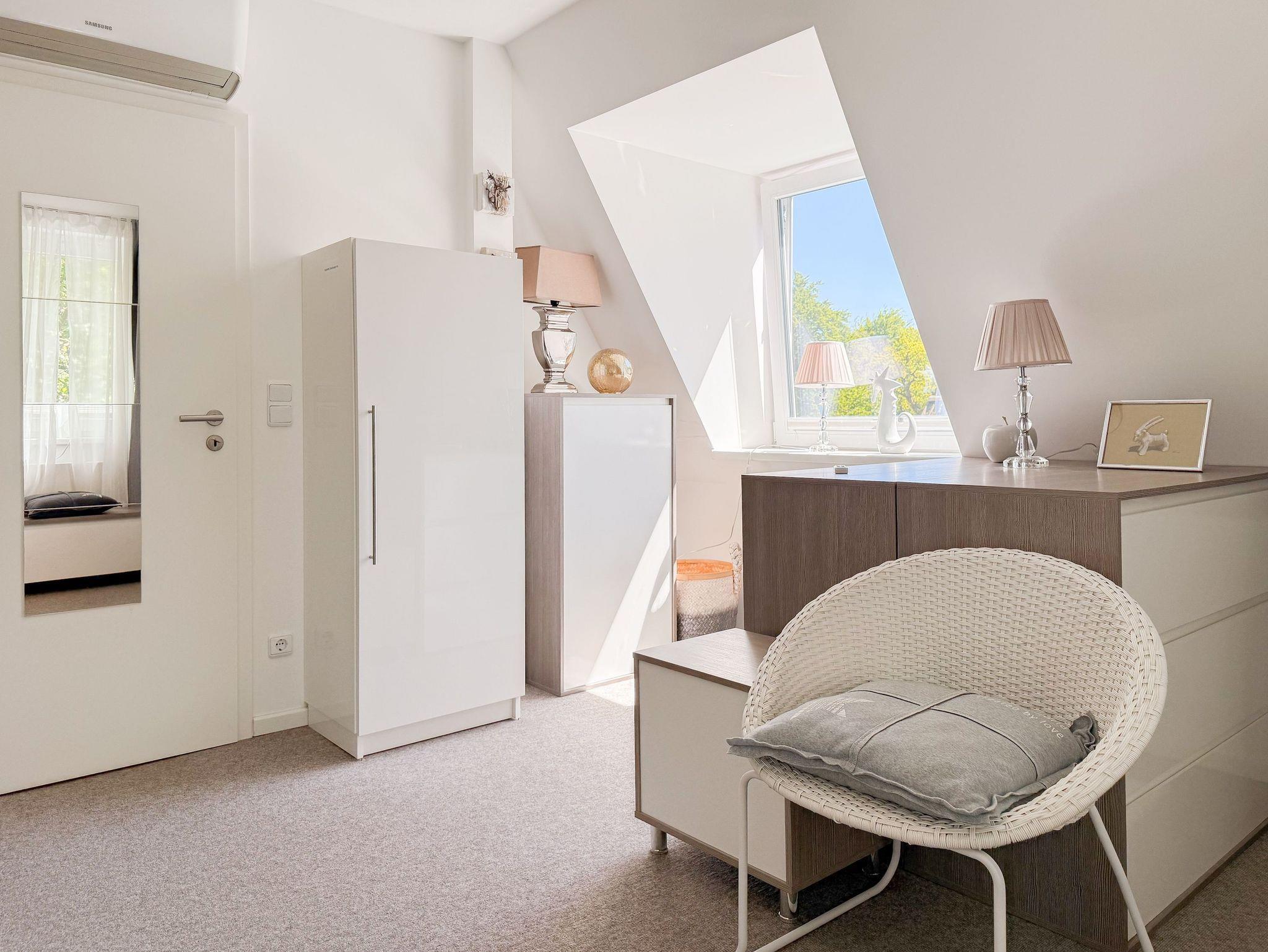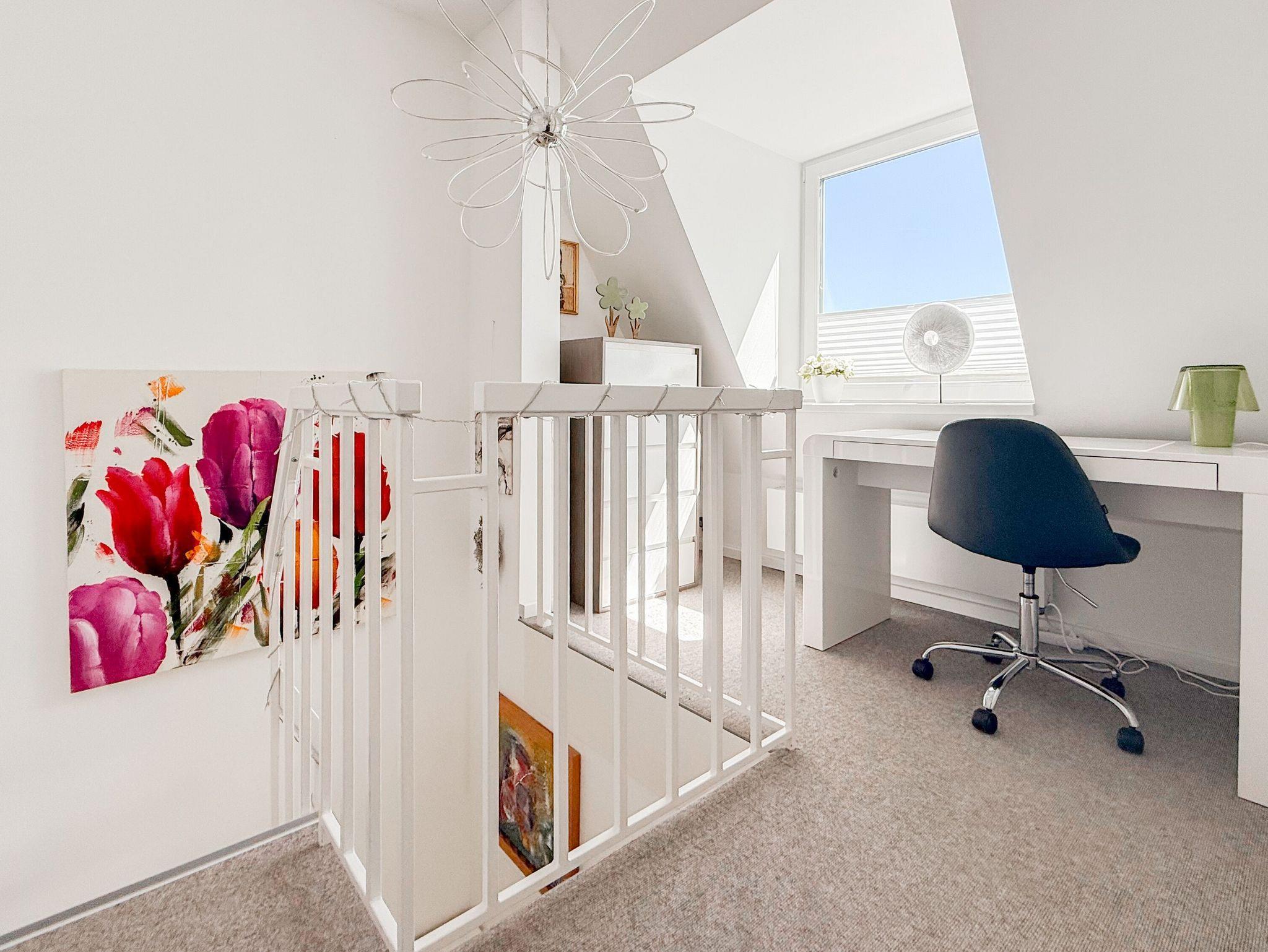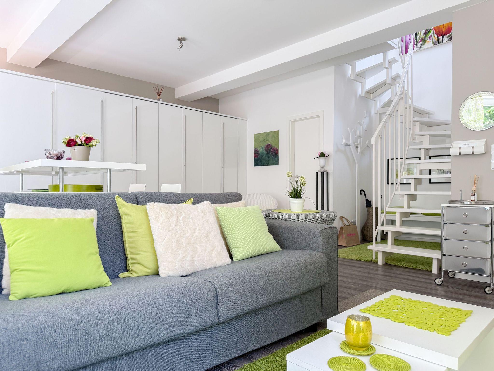 Diese Wohnung erstreckt sich über zwei Ebenen. Im unteren Bereich finden Sie einen gemütlichen Wohnbereich mit einem hochwertigen Schlafsofa, einen Essbereich sowie eine gut ausgestattete Küche. Durch eine praktische Schiebetür lässt sich der Bereich bei Bedarf verstecken. Der großzügige Balkon bietet absolute Privatsphäre und besticht durch einen herrlichen Blick ins Grüne perfekt für entspannte Stunden im Freien. Eine Garderobe und ein separates Gäste WC sind ebenfalls auf der unteren Wohnebene unterbracht. Das Dachgeschoss ist über eine Wendeltreppe zu erreichen. Dort gibt es eine kleine Galerie mit einem Schreibtisch perfekt für Workation oder kreative Pausen. Das großzügige Schlafzimmer ist mit einer Klimaanlage, einem zusätzlichen TV und Verdunkelungsvorhängen ausgestattet. Das exklusive Duschbad mit Tageslichtfenster sorgt für ein angenehmes und helles Ambiente.