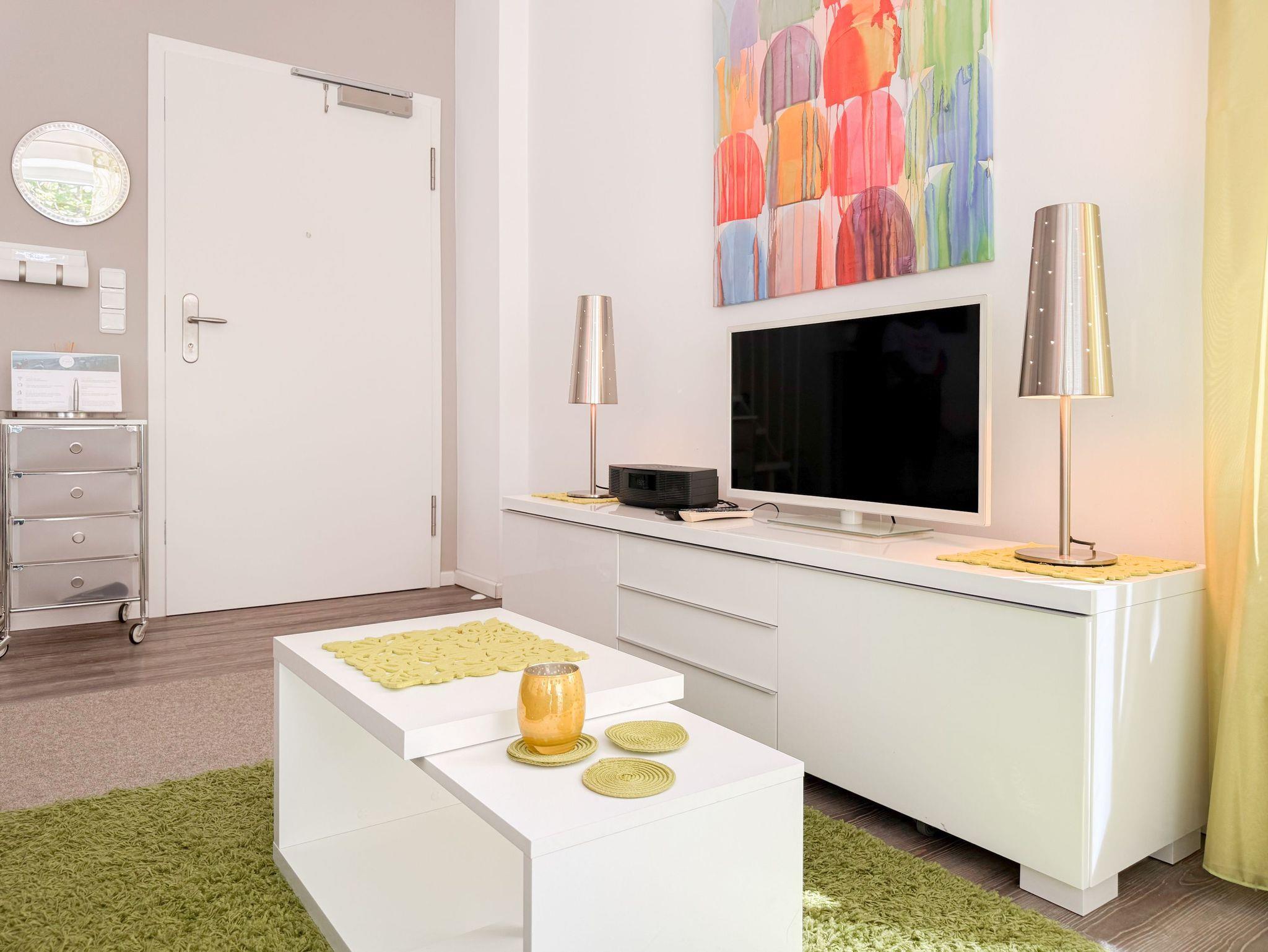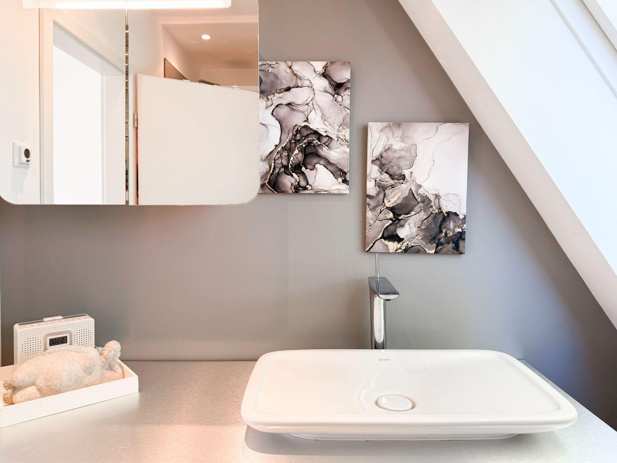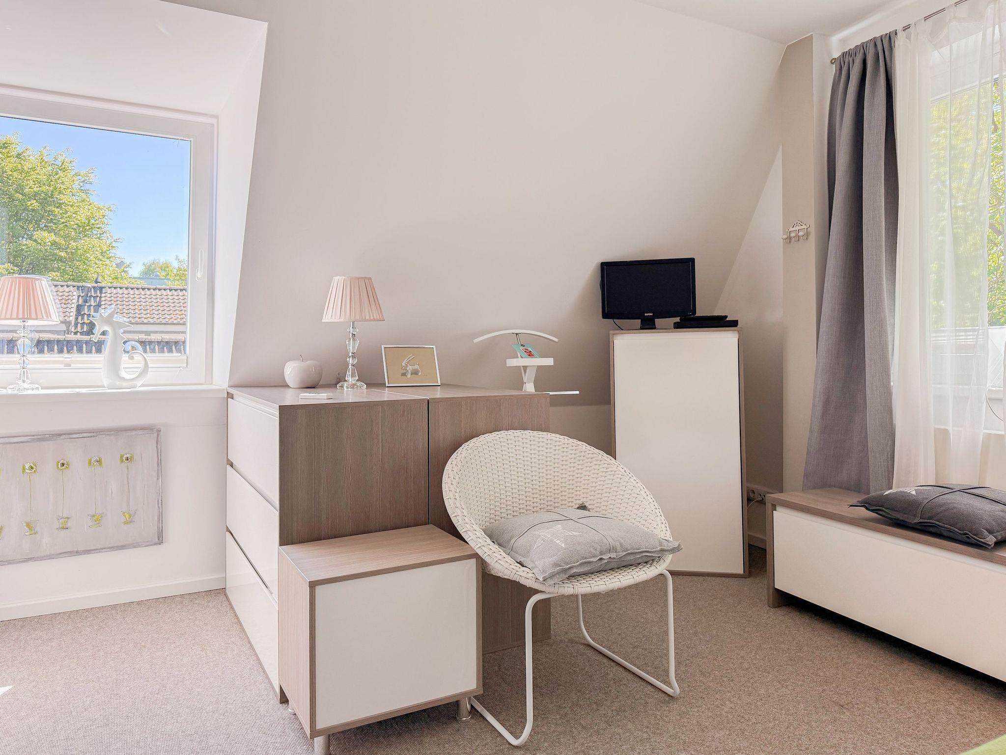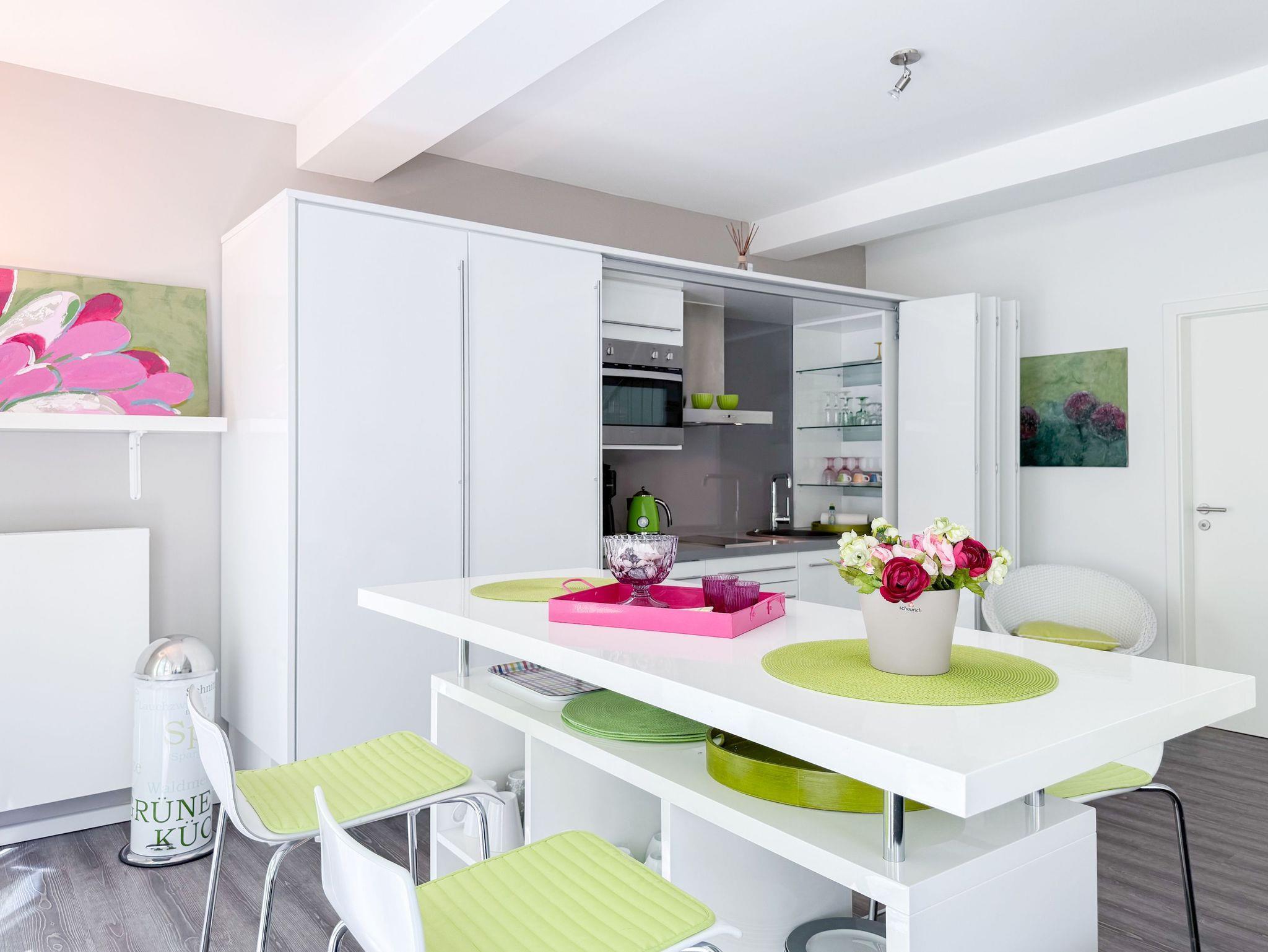 Diese Wohnung erstreckt sich über zwei Ebenen. Im unteren Bereich finden Sie einen gemütlichen Wohnbereich mit einem hochwertigen Schlafsofa, einen Essbereich sowie eine gut ausgestattete Küche. Durch eine praktische Schiebetür lässt sich der Bereich bei Bedarf verstecken. Der großzügige Balkon bietet absolute Privatsphäre und besticht durch einen herrlichen Blick ins Grüne perfekt für entspannte Stunden im Freien. Eine Garderobe und ein separates Gäste WC sind ebenfalls auf der unteren Wohnebene unterbracht. Das Dachgeschoss ist über eine Wendeltreppe zu erreichen. Dort gibt es eine kleine Galerie mit einem Schreibtisch perfekt für Workation oder kreative Pausen. Das großzügige Schlafzimmer ist mit einer Klimaanlage, einem zusätzlichen TV und Verdunkelungsvorhängen ausgestattet. Das exklusive Duschbad mit Tageslichtfenster sorgt für ein angenehmes und helles Ambiente.