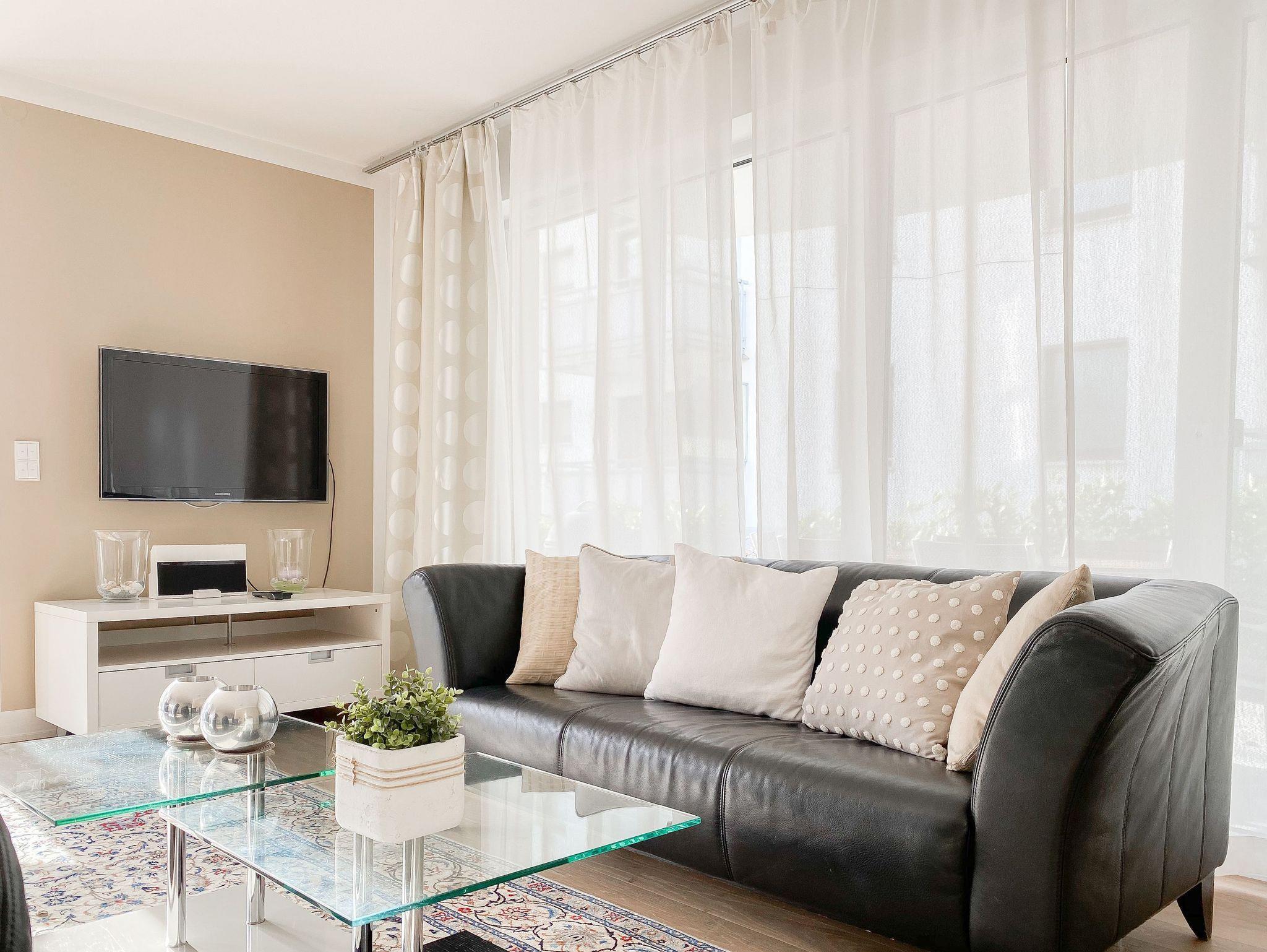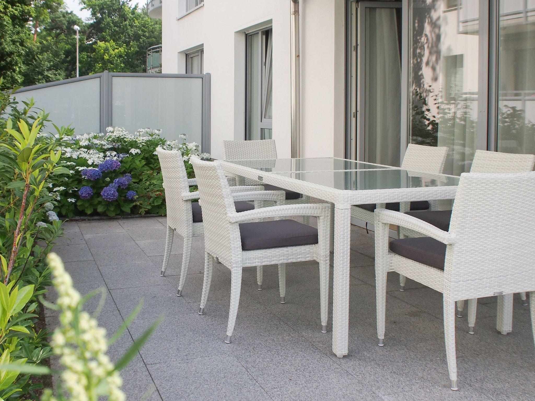 Die 60 qm großen Terrassen - mit Lounge Möbeln und Essgruppe für 6 Personen - sind nach Süden und Westen ausgerichtet, sodass Sie den ganzen Tag die Sonne genießen können. Die hochwertig eingerichtete Wohnung ist vollständig mit Echtholzparkett versehen und im Wohnzimmer mit einer Ledergarnitur und Bioethanol Kamin ausgestattet. TV und kostenfreier Internetzugang über WLAN stehen zur Verfügung. Bodentiefe Fensterelemente in der gesamten Wohnung ? alle mit elektrischen Außenjalousien versehen - sorgen für sonnige, helle Wohnräume. Die offene moderne Einbauküche ist voll ausgerüstet mit Induktionsherd, Backofen, Mikrowelle, Geschirrspüler und großzügigen Essbereich für 6 Personen. Die Wohnung verfügt über zwei separate Schlafzimmer (ein Doppelbett 180x200 und zwei Einzelbetten 80x200), wovon eines mit einem weiteren TV ausgestattet ist. In dem exklusiven Bad mit Fußbodenheizung ist eine private Sauna untergebracht. Eine weitere Gästetoilette steht zur Verfügung.