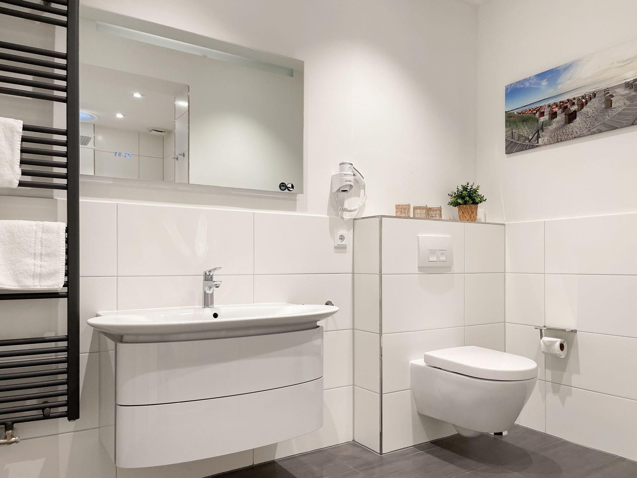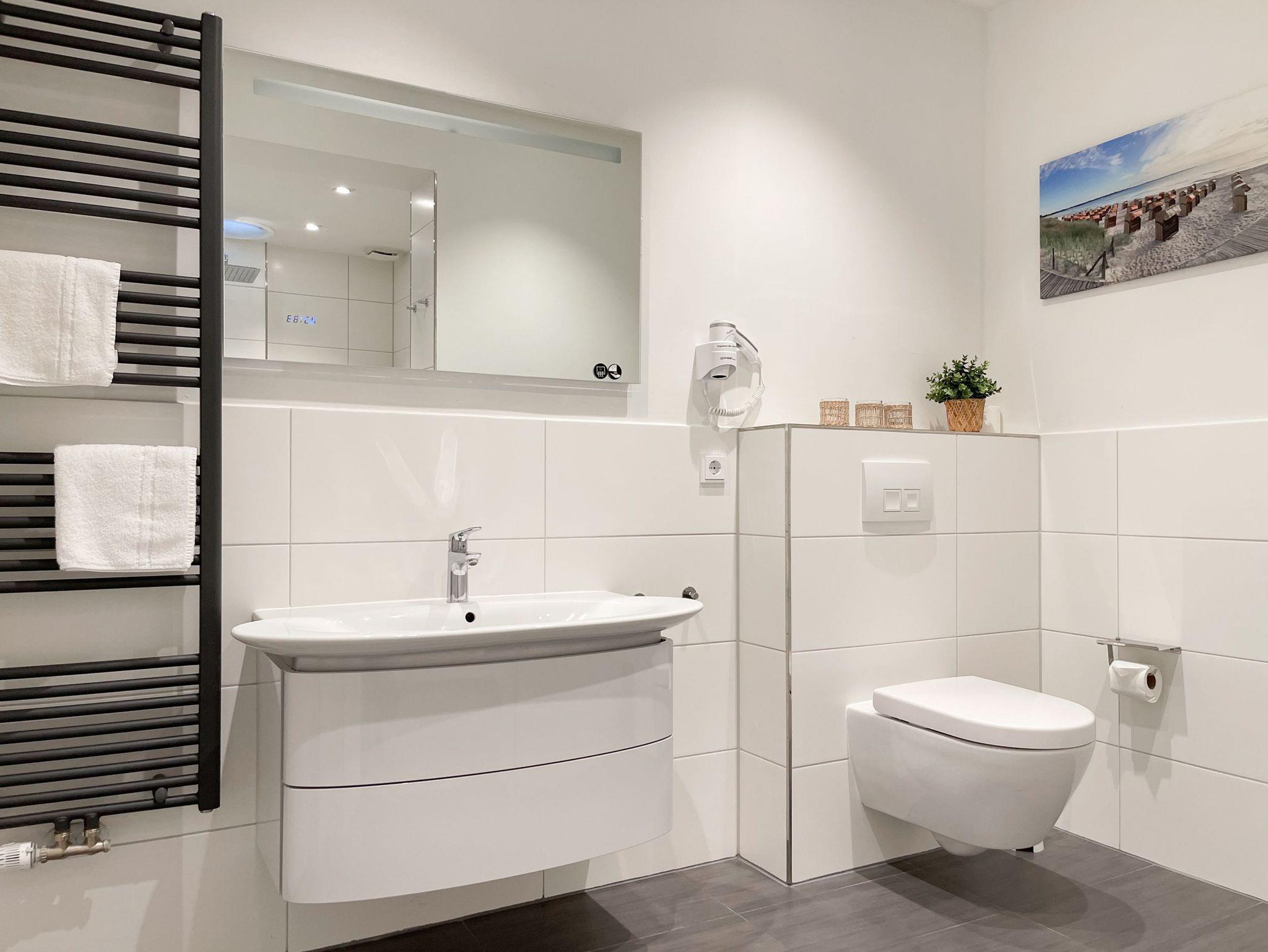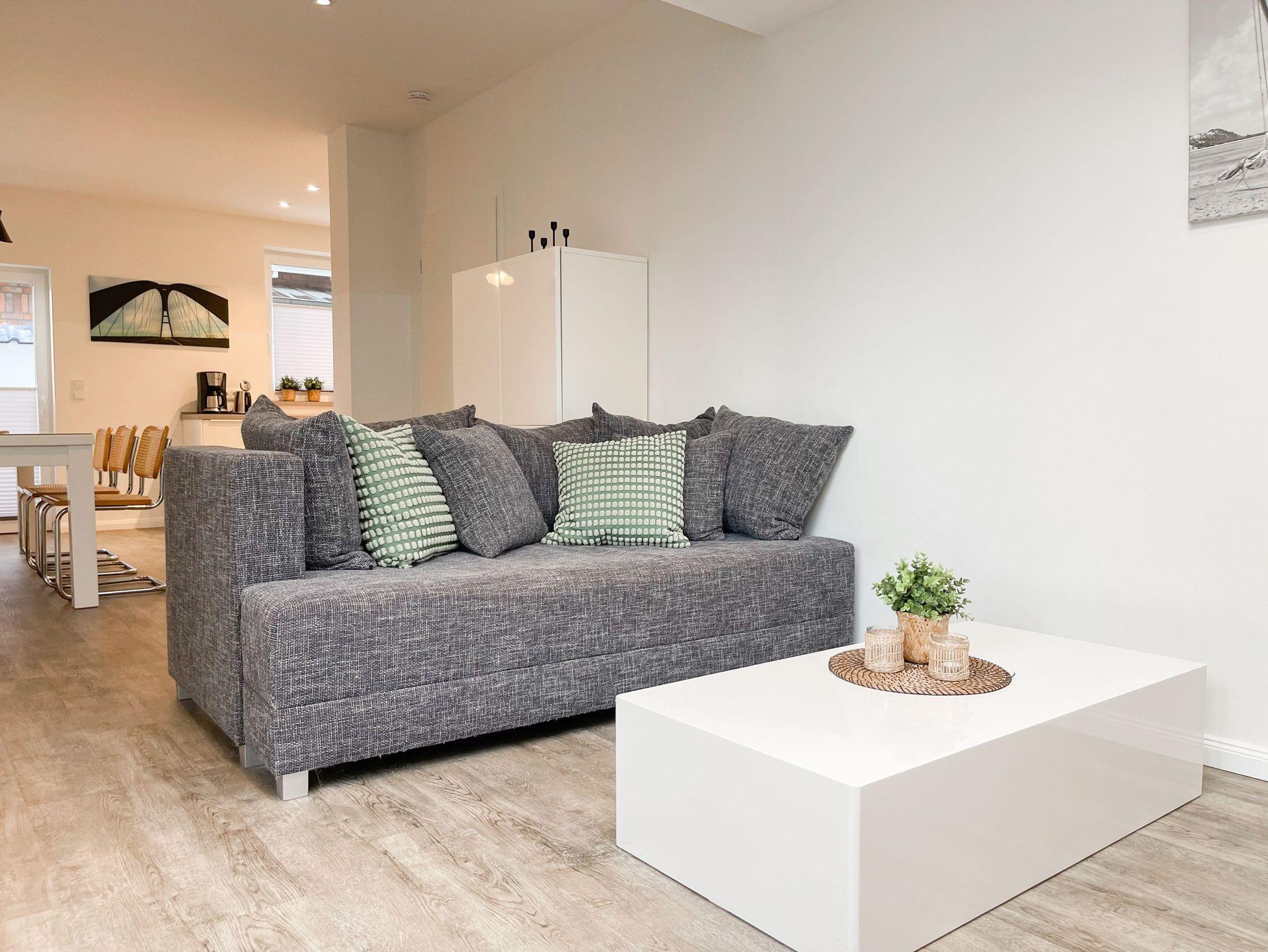 Die Ferienwohnung Waterkant #5 befindet sich im Erdgeschoss und bietet mit 2 Schlafzimmern auf 80 qm ausreichend Raum für 4 Personen, um einen entspannten Ostseeurlaub in Strandnähe zu verleben. Es erwartet Sie ein großzügiger Wohnbereich mit Sofa, ein Essbereich mit XL Esstisch mit viel Platz für gemeinsame Mahlzeiten und eine offene Einbauküche, gut ausgestattet mit Ceranfeld, Backofen, Geschirrspüler und Kühl- und Gefrierschrank. Der Terrassenbereich ist schmal und mit einer Mauer zum Nachbarn begrenzt. Das größere Schlafzimmer ist mit einem Doppelbett (180x200), Kleiderschrank und TV eingerichtet. Das kleine Schlafzimmer verfügt über ein Doppelbett (140x200), TV und einen kleinen Kleiderschrank. Die Fenster der Schlafzimmer sind mit Verdunkelungsplissees versehen. Das Bad ist mit einer XXL Walk In Dusche, Waschtisch, WC und Handtuchwärmer ausgestattet sowie einem Dachfenster für ausreichend Tageslicht.[nbsp] WLAN kann selbstverständlich kostenlos genutzt werden. Ein Außenstellplatz gehört zur Wohnung. Ein abschließbarer Fahrradraum kann gemeinschaftlich genutzt werden, ebenso Waschmaschine und Trockner, die im separaten Waschraum untergebracht sind.