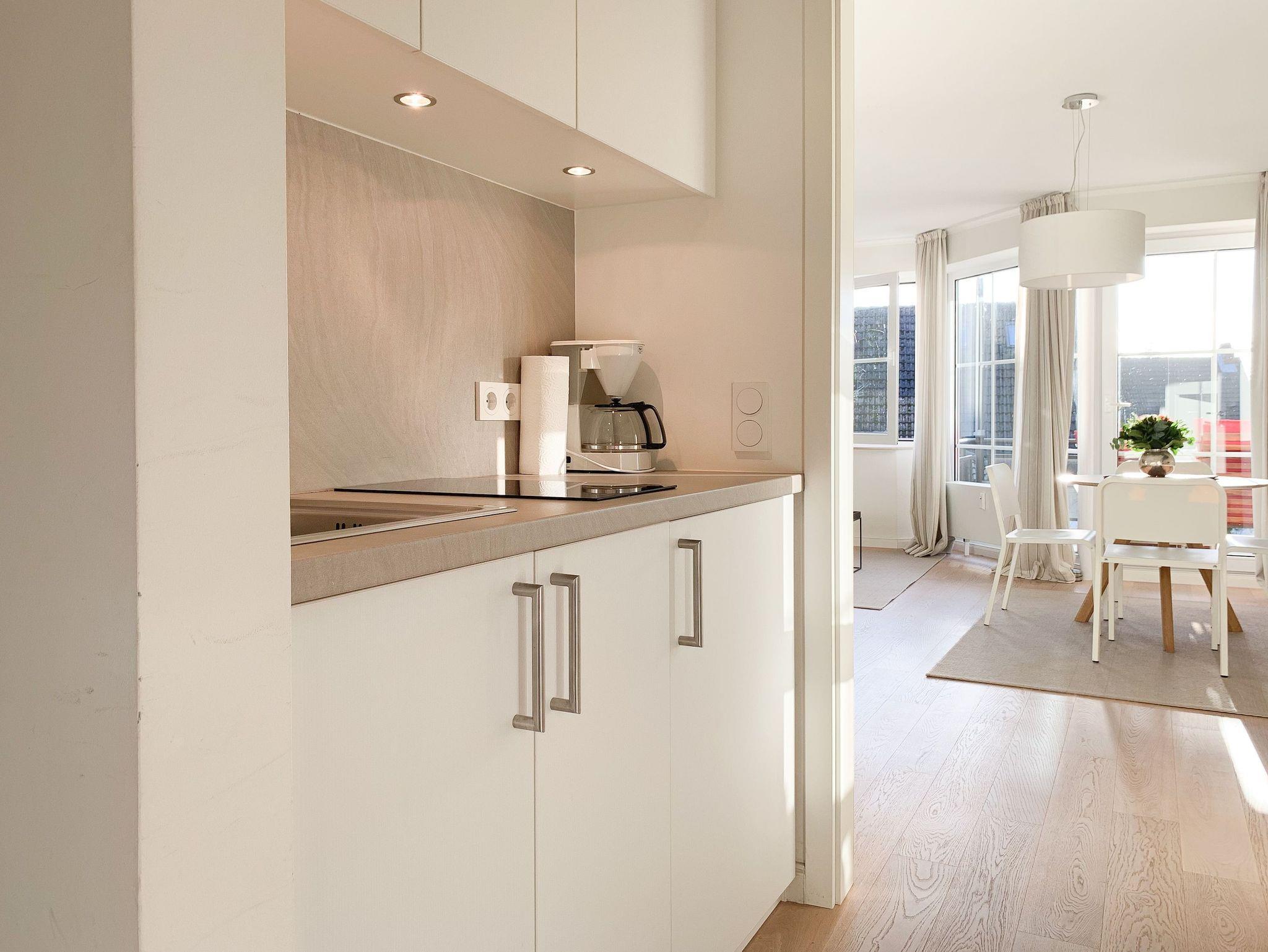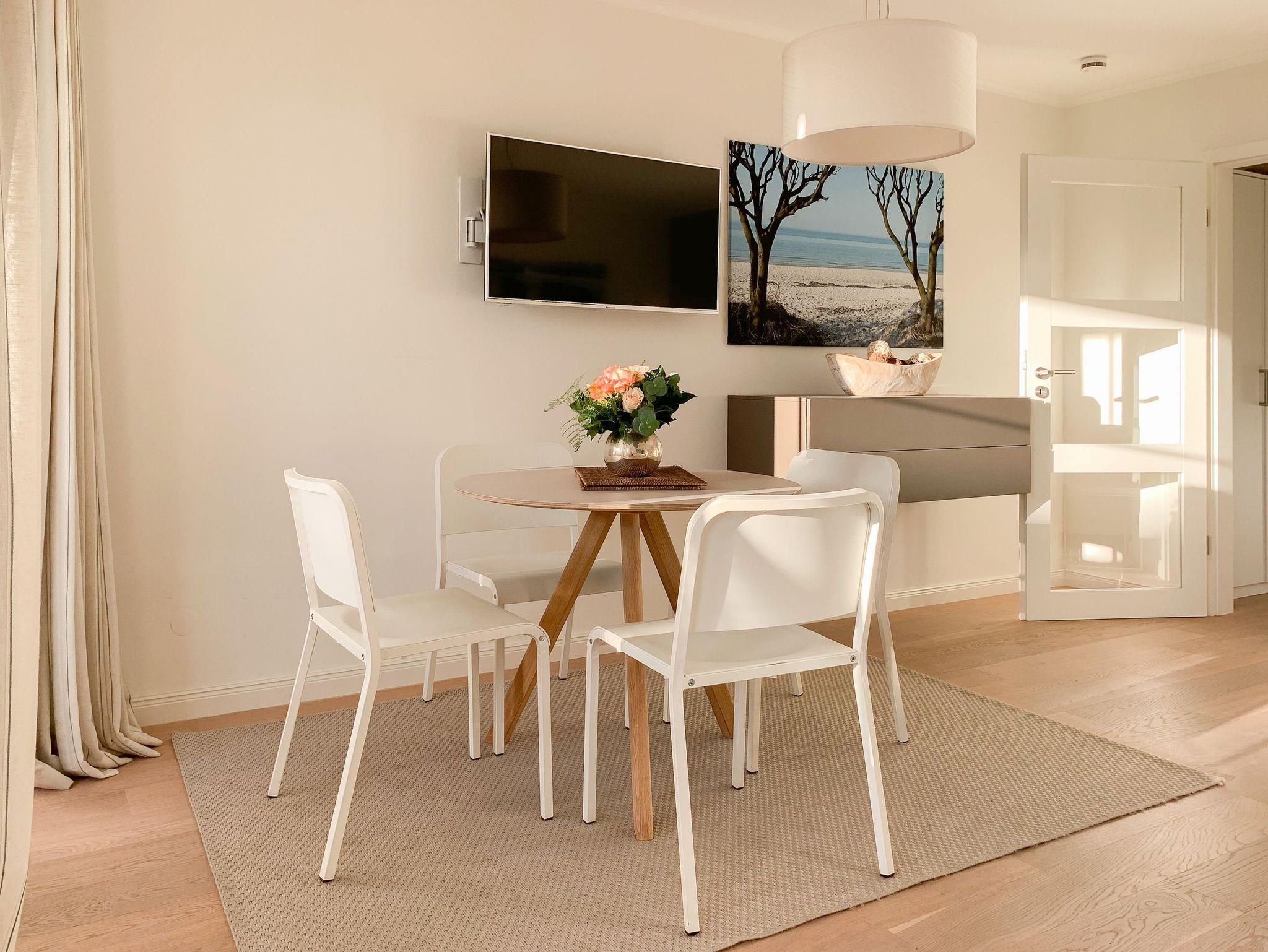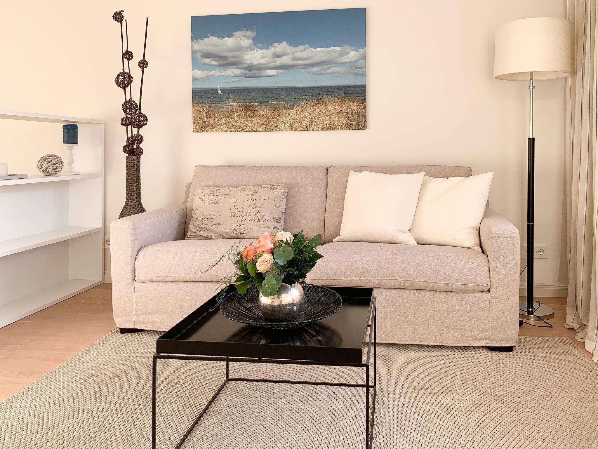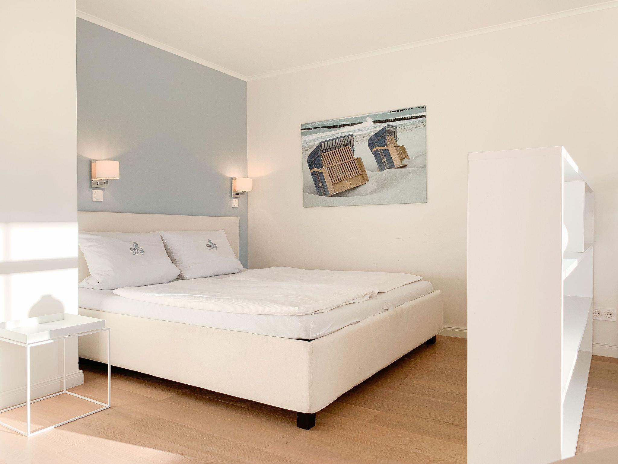 Bodentiefe Fensterelemente, Echtholzparkett und die hochwertige Einrichtung schaffen eine helle und freundliche Wohnatmosphäre. Die 42 qm wurden optimal genutzt und bieten ausreichend Platz für 2-3 Personen. Es steht ein geschmackvoll eingerichteter, großzügiger Wohn-/Schlafbereich mit einem hochwertigen Sofa mit Schlaffunktion, TV und ein Essbereich für 4 Personen zur Verfügung. Das Doppelbett (160x200) ist optisch durch einen Raumteiler vom Wohnbereich getrennt, die Fenster sind mit Verdunkelungsvorhängen versehen. Die moderne[nbsp] Küchenzeile ist im Flurbereich integriert. Das hochwertige Bad verfügt über eine[nbsp] Dusche, Waschtisch, WC, Handtuchwärmer und Fön. Kostenloser Internetzugang über WLAN steht selbstverständlich zur Verfügung.