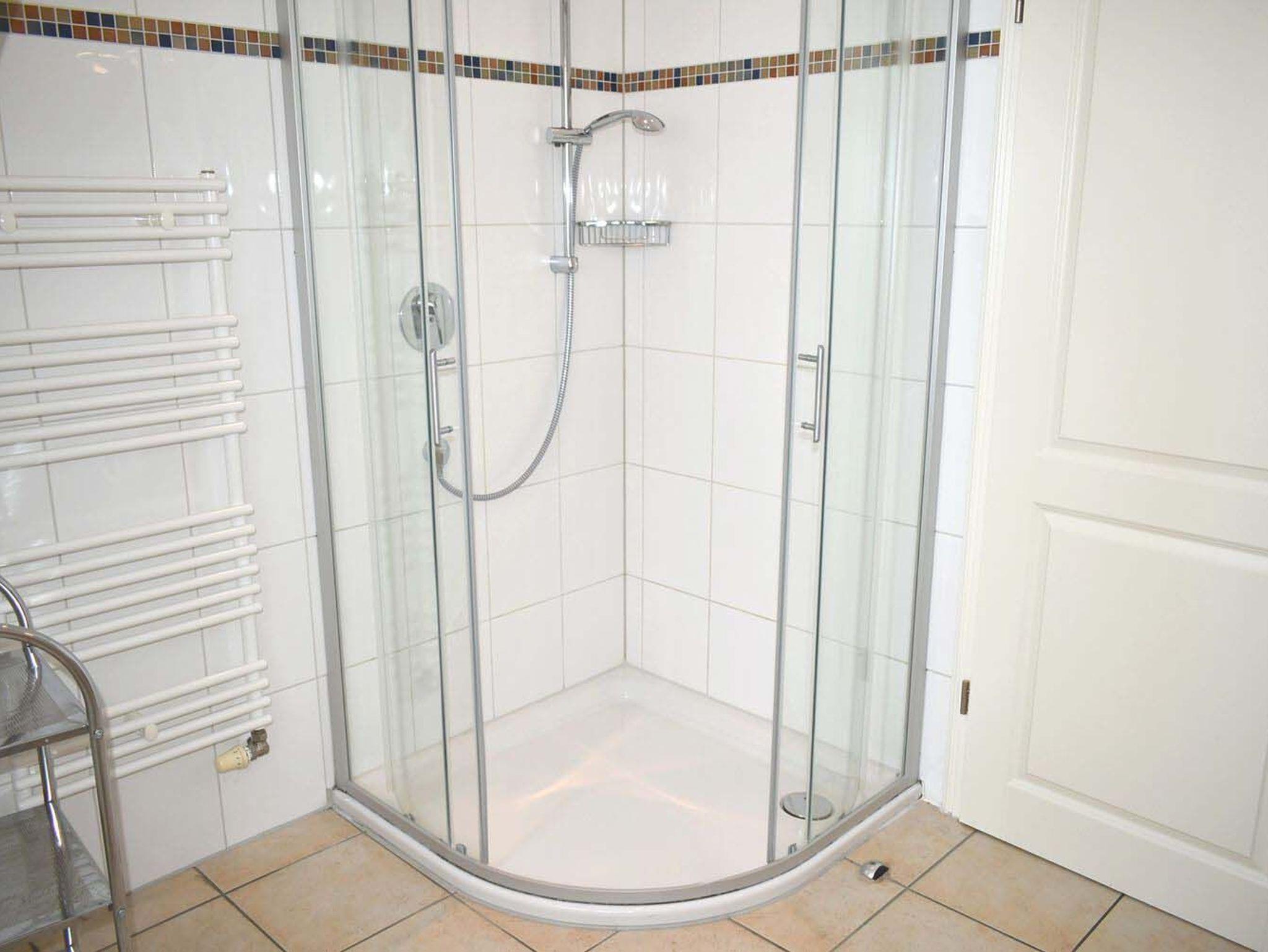 Bad 1: Dusche, Duschkabine, Fön, Hocker, Regal, Spiegelschrank, Waschtisch, WC