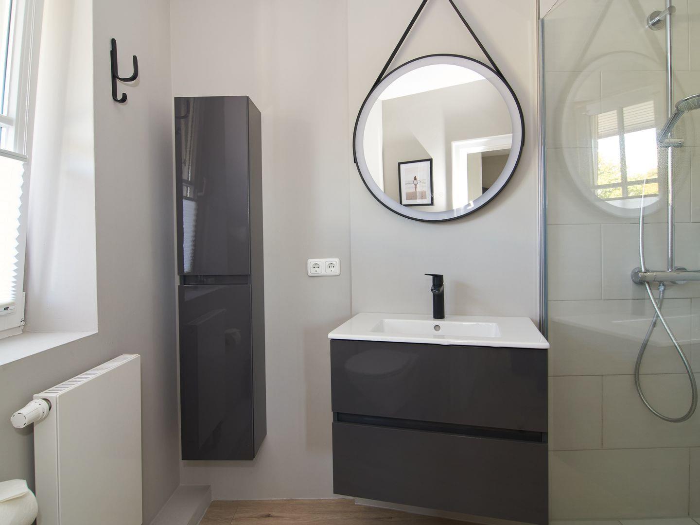 Das Apartment „Lieblingsbucht“ liegt in der ersten Etage und ist bequem mit dem Fahrstuhl erreichbar. Hochwertiges Interieur, warme Farben und eine geschmackvolle Einrichtung im modernen Beachhouse-Stil schaffen eine einladende Atmosphäre.