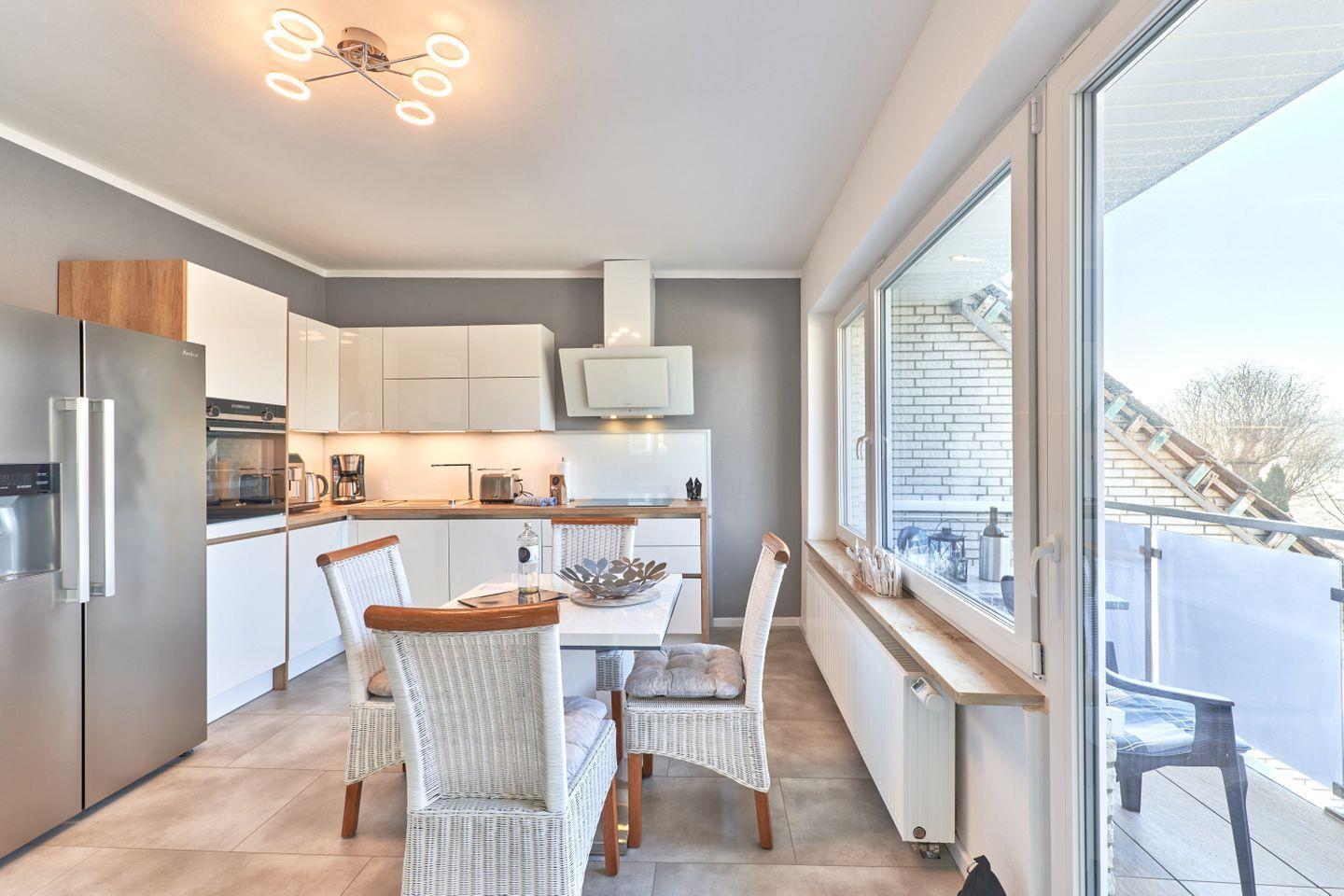 Die Küche ist mit einem Kaffeevollautomaten, einem Backofen mitCeranfeld sowie einem side by side Kühlschrank und einer Spülmaschine ausgestattet. Vom geräumigen Balkon aus, schaut der Feriengast ins Grüne und kann die Seele baumeln lassen.