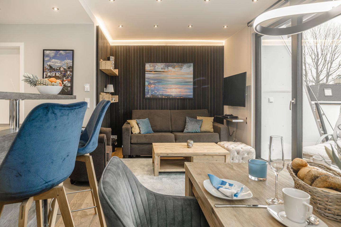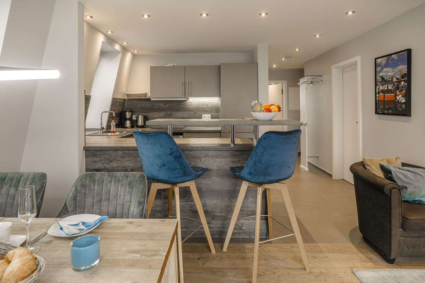 Die Ferienwohnungen Leuchtturm und Düne befinden sich im 2. Obergeschoss und entsprechen vom Schnitt, der Gestaltung und Ausstattung den Ferienwohnungen Strandblick und Strandkorb. Auch sie sind für bis zu vier Personen konzipiert, mit großen Fenstern und Echtholz-Parkettboden ausgestattet.