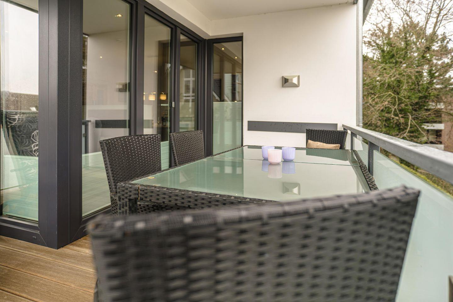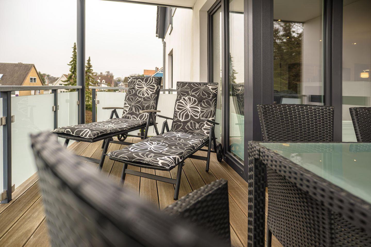 Statt eines Gartens verfügt die Ferienwohnung Möwe über einen schönen Balkon, der zum essen und relaxen einlädt. An schönen Sommerabenden, kann man auch zu fortgeschrittener Tageszeit noch die wärmende Abendsonne genießen.