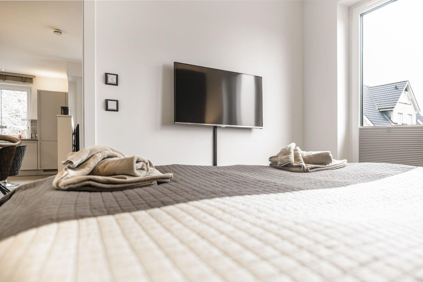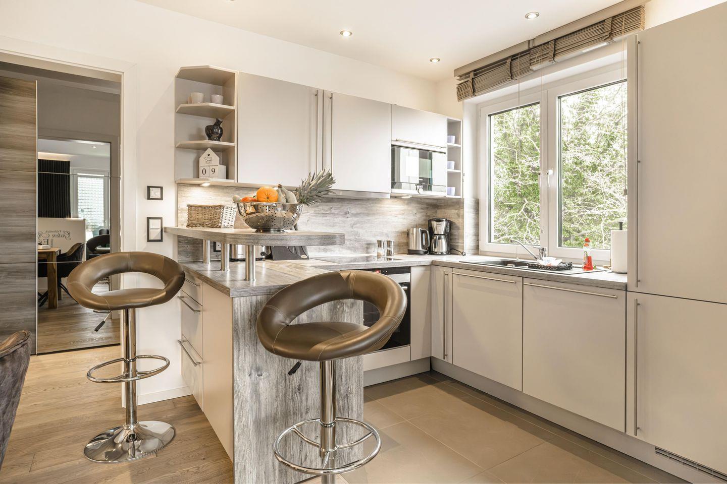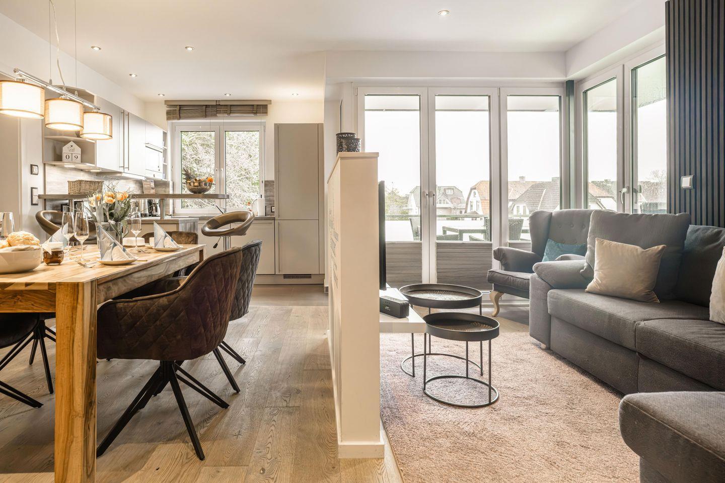 Die Ferienwohnungen Möwe und Sandburg befinden sich im 1. Obergeschoss und entsprechen von der Gestaltung und Ausstattung den Ferienwohnungen Welle und Muschel. Auch sie sind für bis zu sechs Personen konzipiert, mit Echtholz-Parkettboden und Fußbodenheizung ausgestattet und ebenso anspruchsvoll und hell gestaltet.