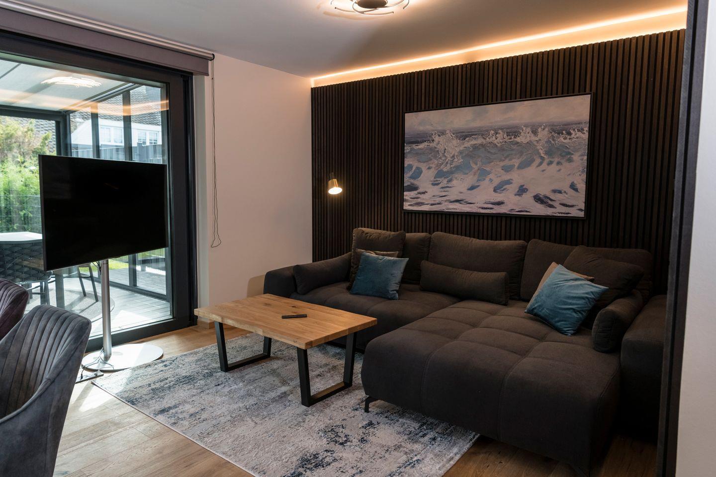 Verbringen Sie Ihren Urlaub in Ihrer eigenen Wohlfühl-Oase. Auf 157 exquisit eingerichteten Quadratmetern und einem eigenem Spa Bereich mit Sauna, Dampfdusche Fitnessgerät und Whirlpool haben Sie unterschiedlichste Entspannungsmöglichkeiten. Der Wohnbereich wird durch einen großzügigen Wintergarten erweitert und lädt mit einem rundum Blick auf den Garten dazu ein einfach mal die Seele baumeln zu lassen.