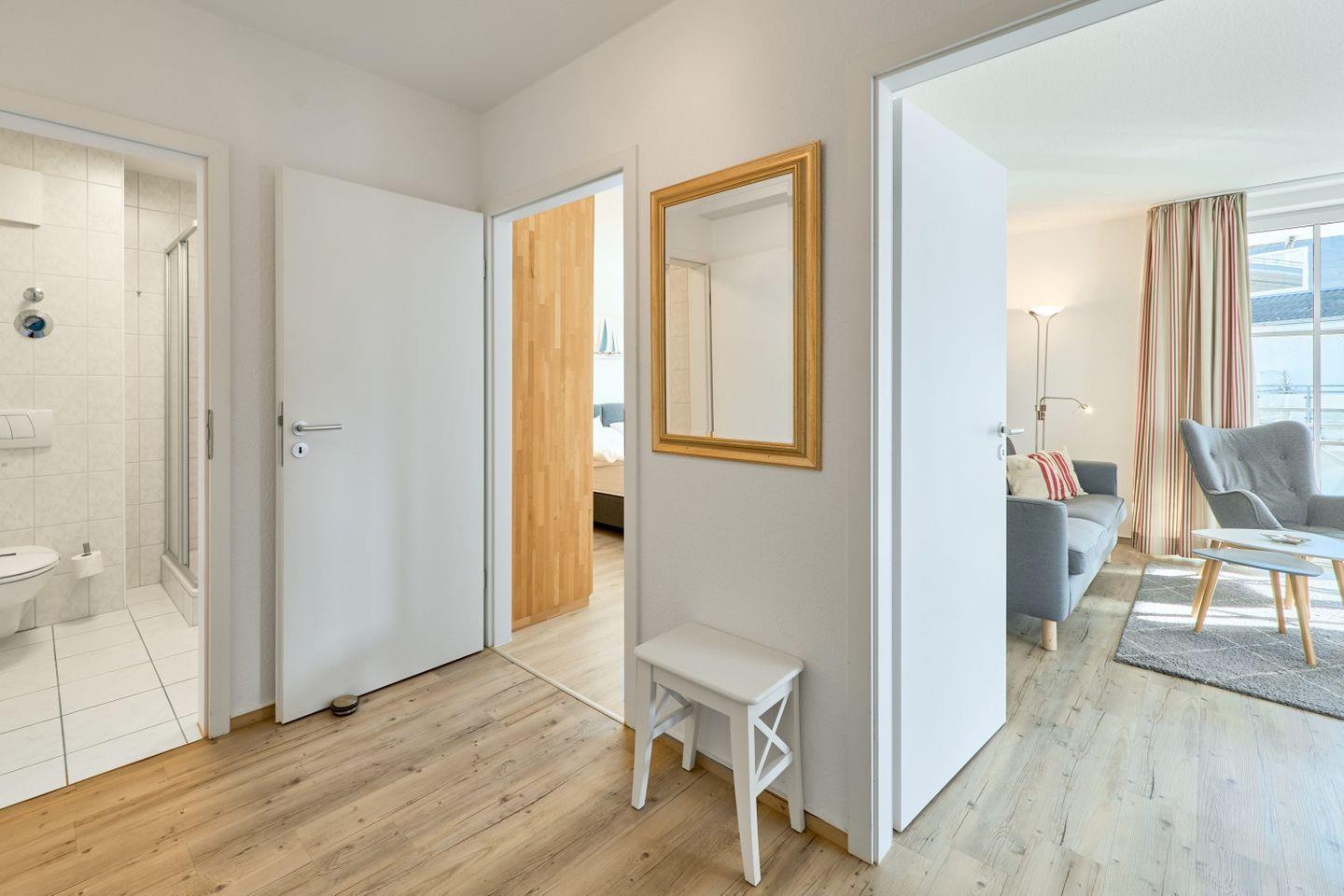 Über den geräumigen Flur gelangen Sie ins Schlafzimmer, das mit einem komfortablen Boxspringbett (2 x 90cm x 200 cm) ausgestattet ist. Das Badezimmer verfügt über eine Dusche, einen Handtuchtrockner und einen Fön. Im gesamten Appartement steht Ihnen kostenfreies WLAN zur Verfügung. Zudem gibt es im Gemeinschaftsraum im Keller eine Münzwaschmaschine und einen Trockner. Ihr Auto können Sie bequem auf dem für Sie reservierten Außenstellplatz am Haus abstellen. Bitte beachten Sie, dass es sich um ein Nichtraucher-Apartment handelt und Haustiere nicht erlaubt sind.
