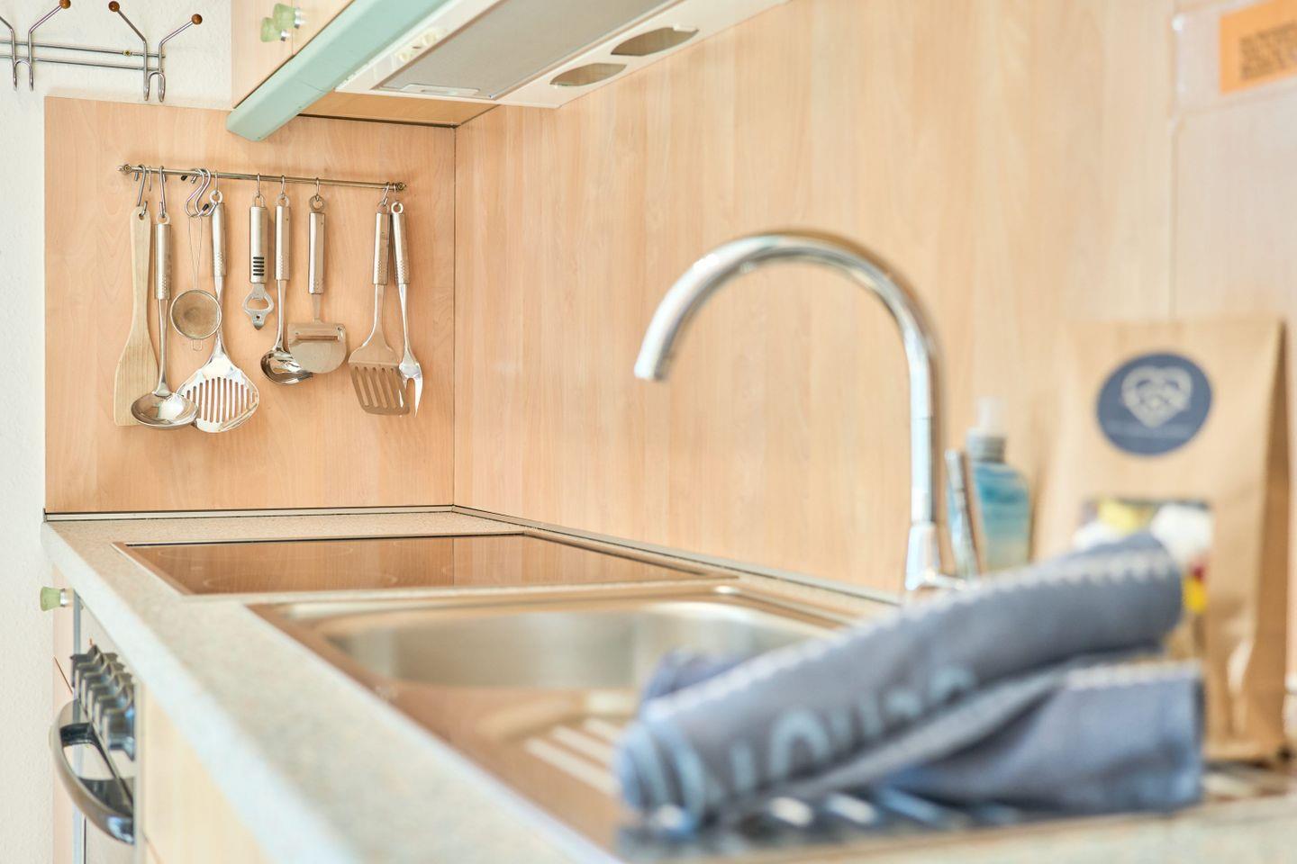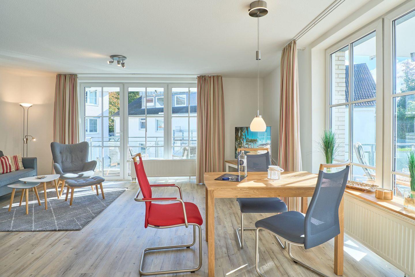 Das 60 m² große 2-Zimmer-Apartment in der ersten Etage bietet Platz für bis zu 2 Personen und ist modern und geschmackvoll eingerichtet. Der Wohnbereich verfügt über ein komfortables Sofa, einen bequemen Fernsehsessel mit Hocker für entspannte Fernsehabende, sowie einen Flatscreen-TV und eine gut ausgestattete Küche mit Essbereich.