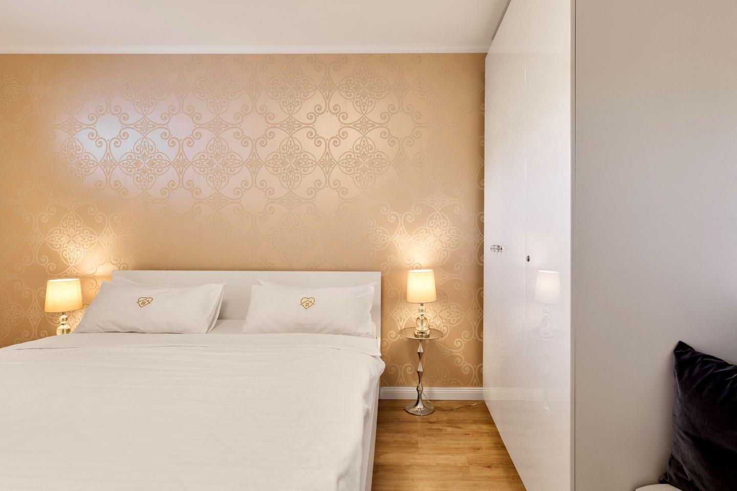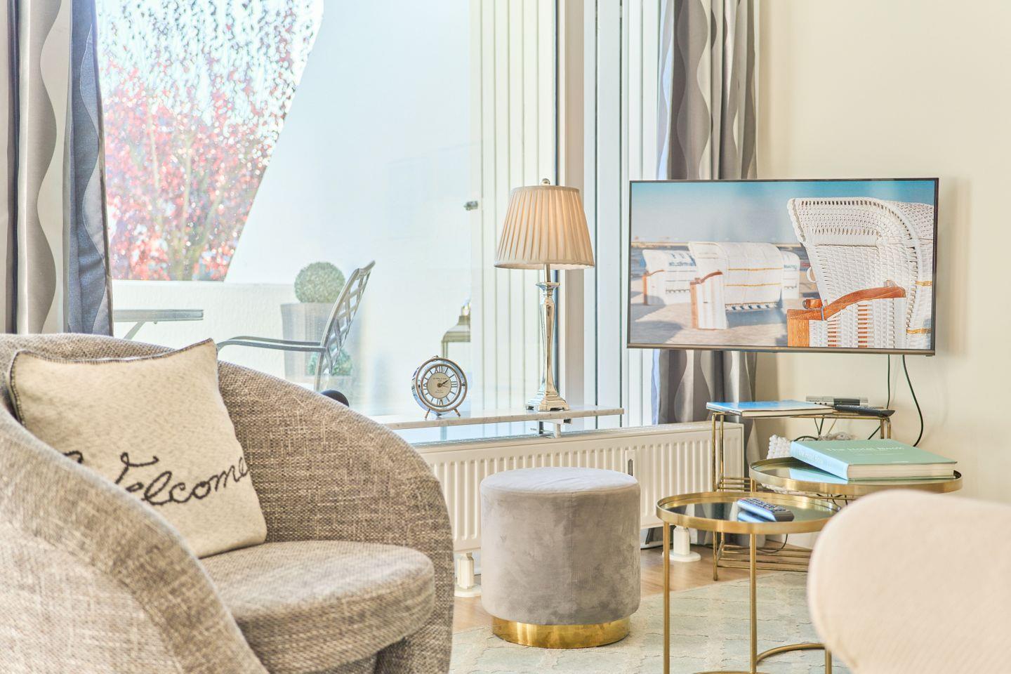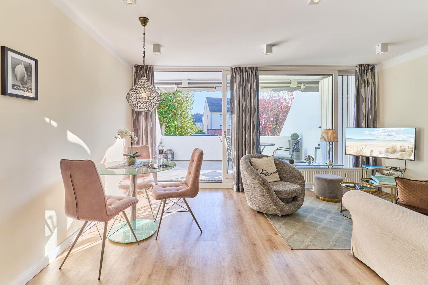 Beim Betreten des Apartments erwartet Sie eine elegante und gemütliche Atmosphäre. Ein Highlight der Wohnung ist der helle, offene Wohn-Essbereich, der einladend gestaltet und stilvoll möbliert ist. Hier können Sie gemeinsame Mahlzeiten genießen, entspannen oder einen gemütlichen Abend bei einem Film verbringen.