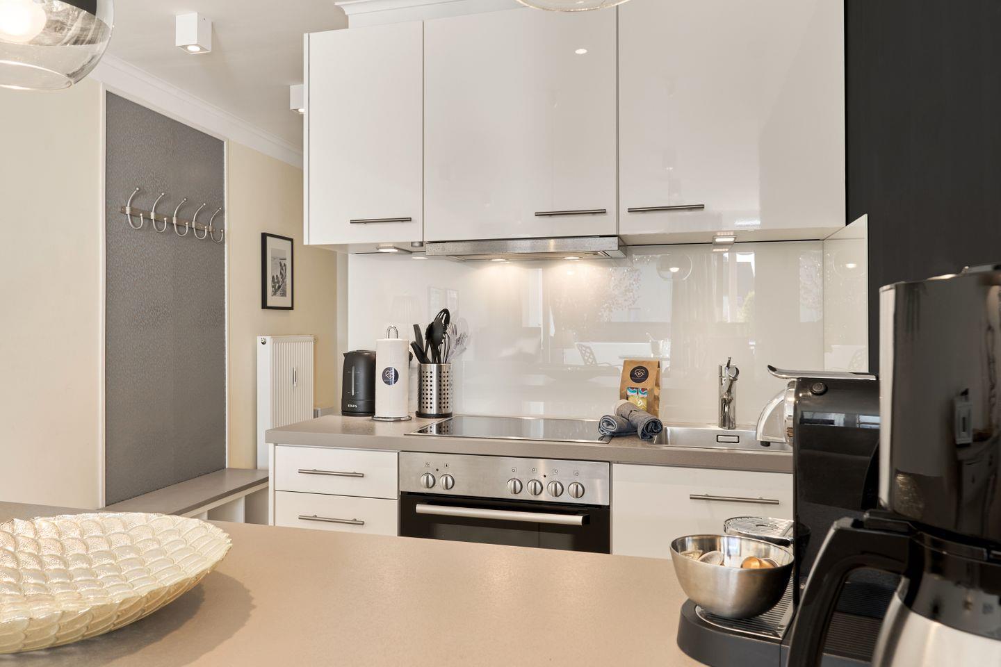 In der modernen, voll ausgestatteten Küche können Sie Ihre Lieblingsgerichte zubereiten. Sie verfügt über hochwertige Geräte wie eine Spülmaschine, Kaffeemaschine, Mikrowelle, einen Herd mit Cerankochfeld und eine Nespresso-Maschine für den perfekten Start in den Tag. Auch an Küchenutensilien, Geschirr und Besteck ist alles vorhanden, sodass Sie sich wie zuhause fühlen können.