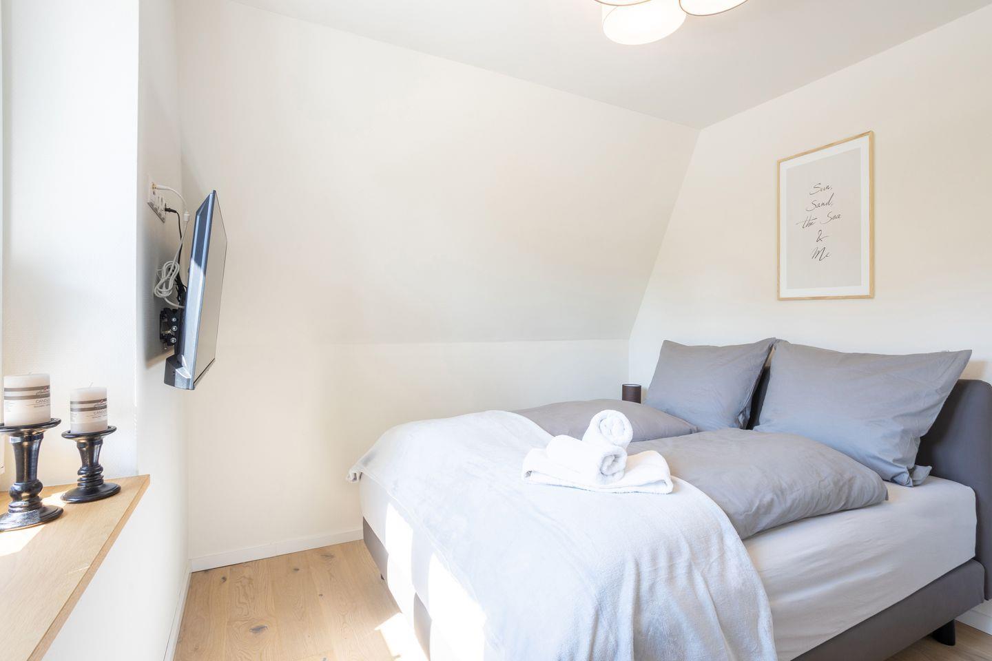 Zwei komfortable Schlafzimmer mit hochwertigen Boxspringbetten, Verdunkelungsplissees und jeweils eigenem Fernseher sorgen für erholsame Nächte. Die Ausstattung ist modern und hochwertig – perfekt zum Ausschlafen und Zurückziehen.
