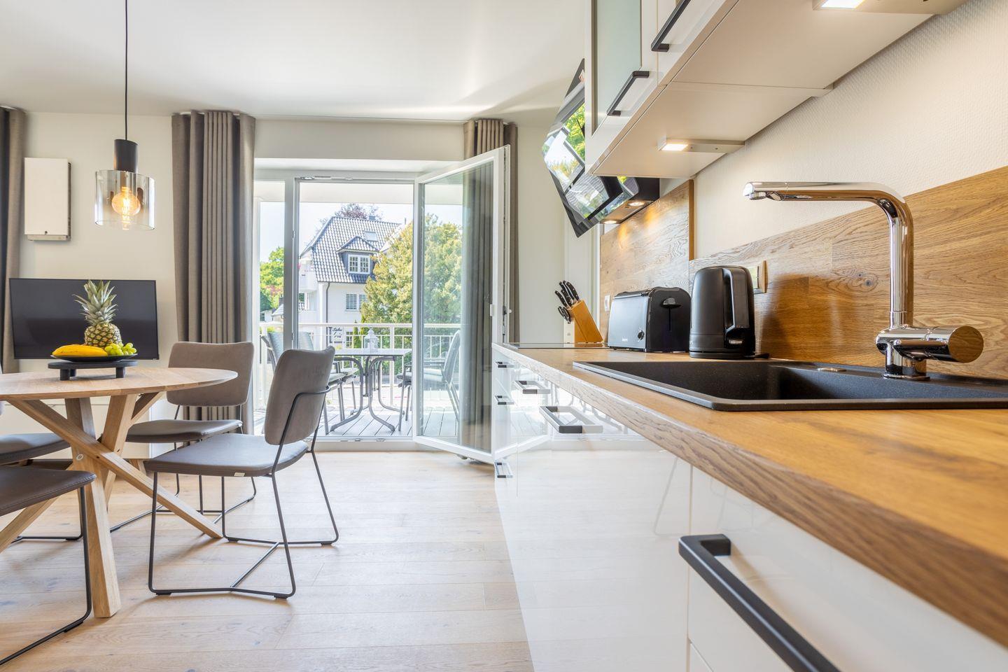 Der helle Wohnbereich mit gemütlicher Sofaecke, großem TV und bodentiefen Fenstern lädt zum Verweilen ein. Die offene Küche ist bestens ausgestattet – ob Frühstück, Mittagessen oder gemeinsames Abendessen, hier wird Kochen zum Vergnügen. Auf dem Südwest-Balkon genießt du die Sonne bis in den Abend.