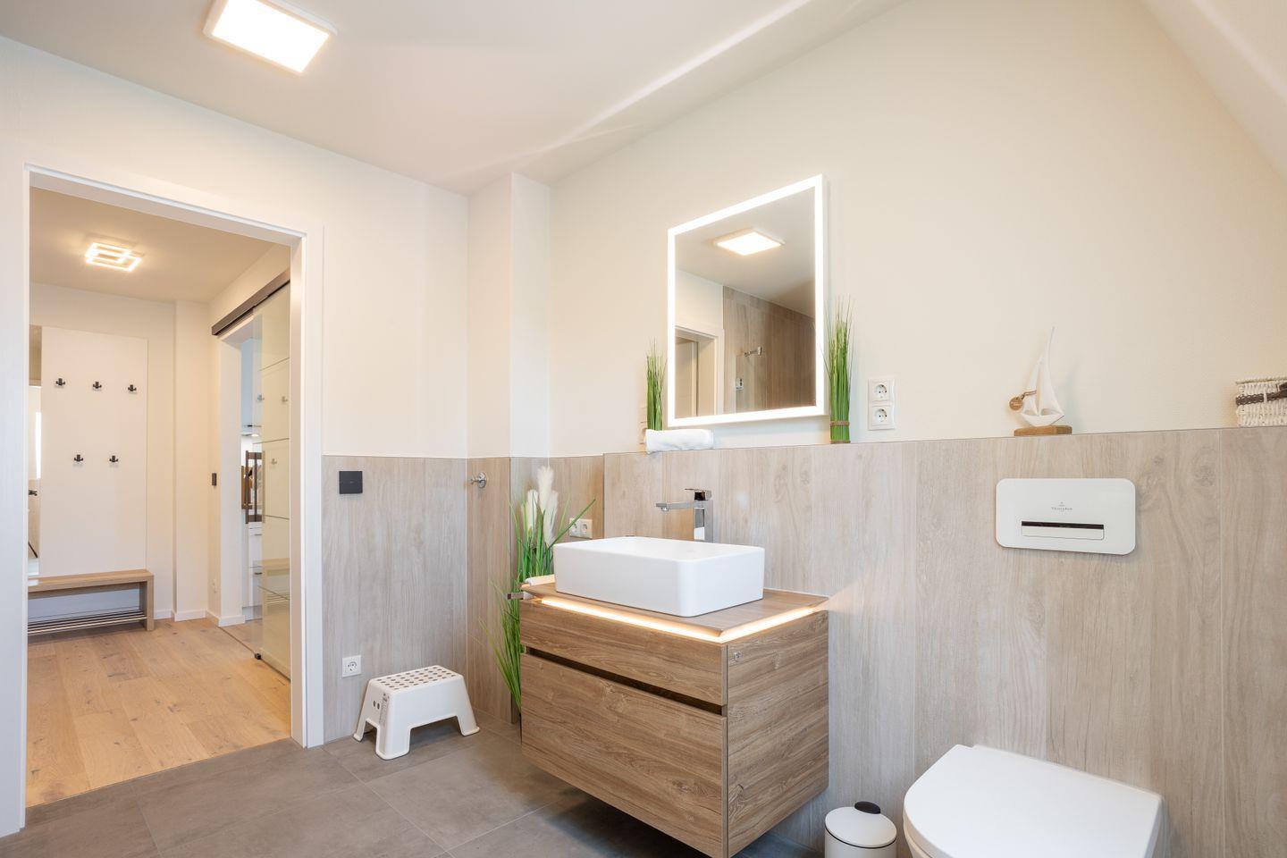 Im eleganten Bad mit bodentiefer Rainshower-Dusche erwartet dich deine private Sauna – für besondere Wohlfühlmomente zu jeder Jahreszeit. Hochwertige Materialien und ein durchdachtes Lichtkonzept runden das Wellnesserlebnis ab.