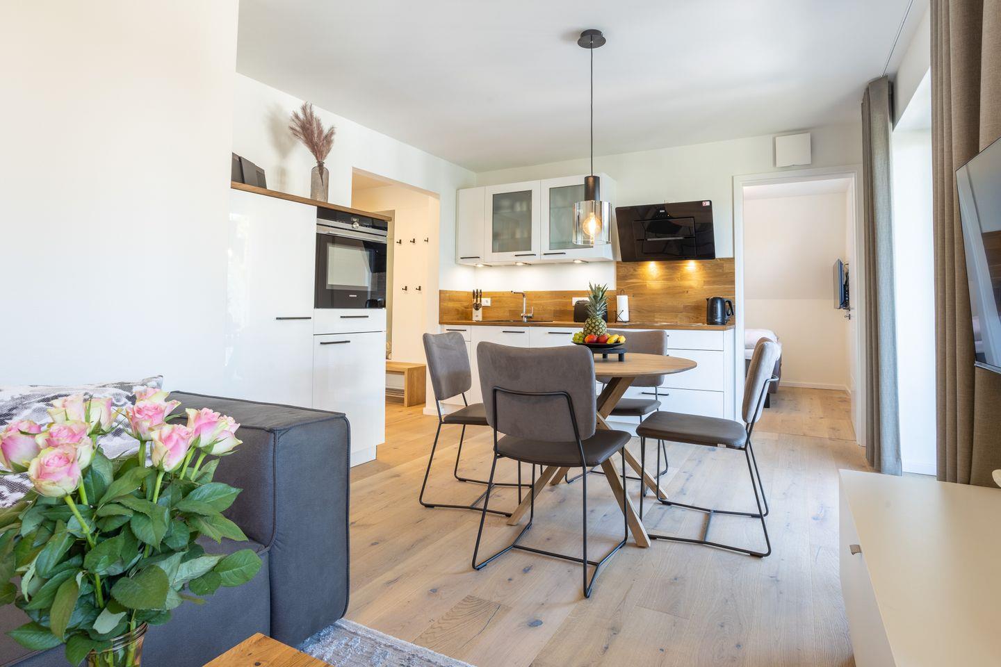 Der offene Wohnbereich lädt mit gemütlichem Sofa, Smart-TV und großen Fenstern zum Entspannen ein. Die moderne Küche ist bestens ausgestattet und bietet alles für das gemeinsame Kochen. Auf dem nordostseitigen Balkon genießt du frische Luft und ein Frühstück in der Morgensonne.