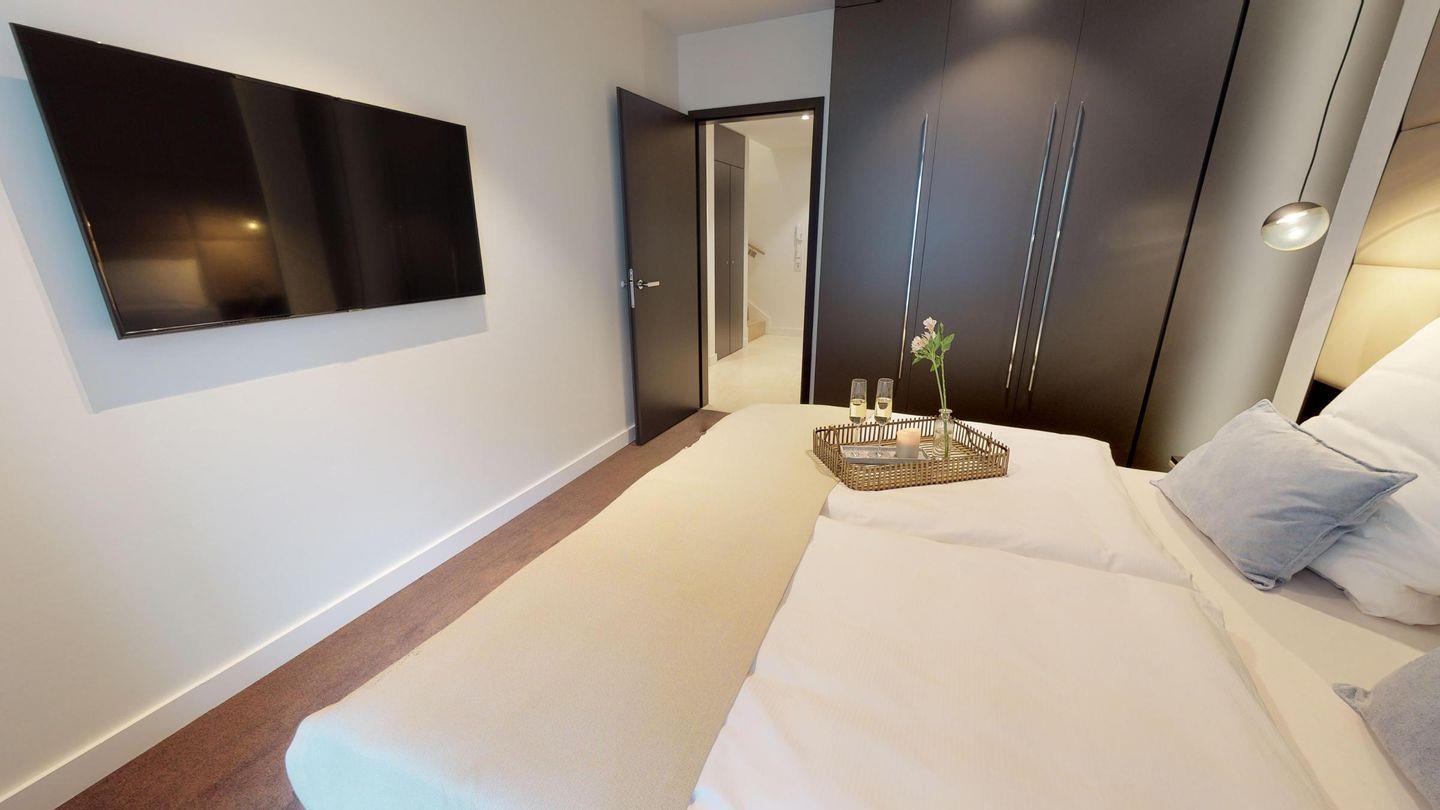 Im Untergeschoss befinden sich zwei Schlafzimmer mit Boxspring-Doppelbetten, wobei eines der Schlafzimmer ein eigenes Bad mit Dusche hat. Beide Schlafzimmer haben Zugang zur großen, möblierten Terrasse. Zusätzlich gibt es im Untergeschoss ein separates Badezimmer mit Dusche sowie eine eigene Sauna (2,37m × 1,19m).