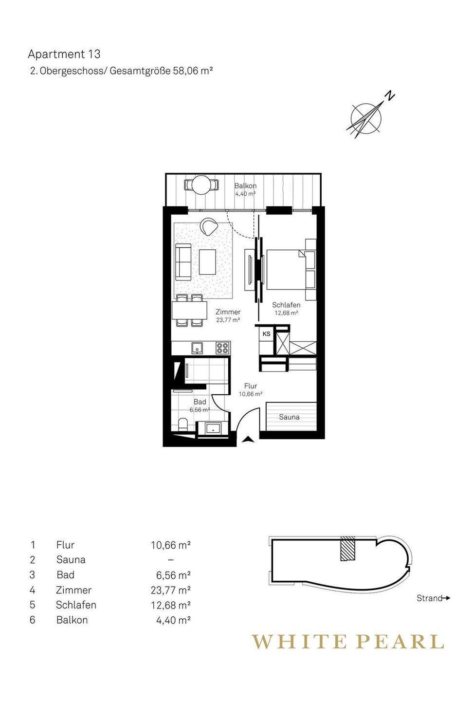 Nur wenige Gehminuten vom Strand entfernt befindet sich das Luxusapartment 2.13 im 2. Obergeschoss des "White Pearl" und bietet Platz für 2 Personen auf 58 m².