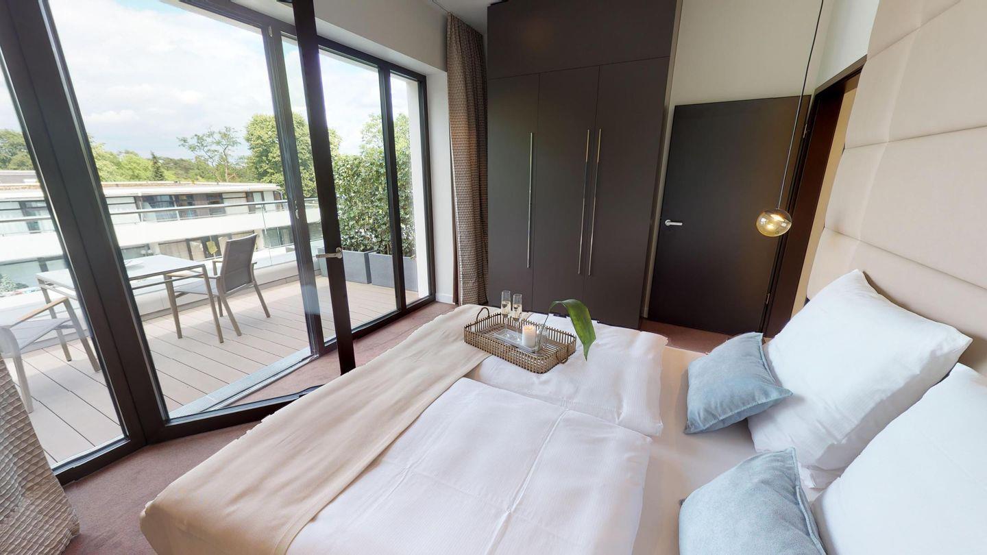 Das großzügige Penthouse verfügt über zwei separate Schlafzimmer, jeweils mit einem Boxspring-Doppelbett ausgestattet und Zugang zu einer eigenen, kleinen Terrasse. Eines der Schlafzimmer verfügt zusätzlich über ein eigenes Bad mit Dusche. Weiterhin gibt es einen lichtdurchfluteten Wohnbereich, der an die offene, voll ausgestattete Küchenzeile sowie an den schönen Essbereich angrenzt. Ein weiteres luxuriöses Badezimmer mit Dusche rundet das Penthouse ab.