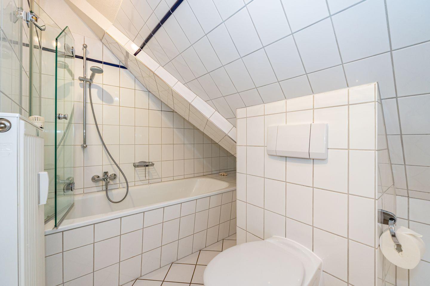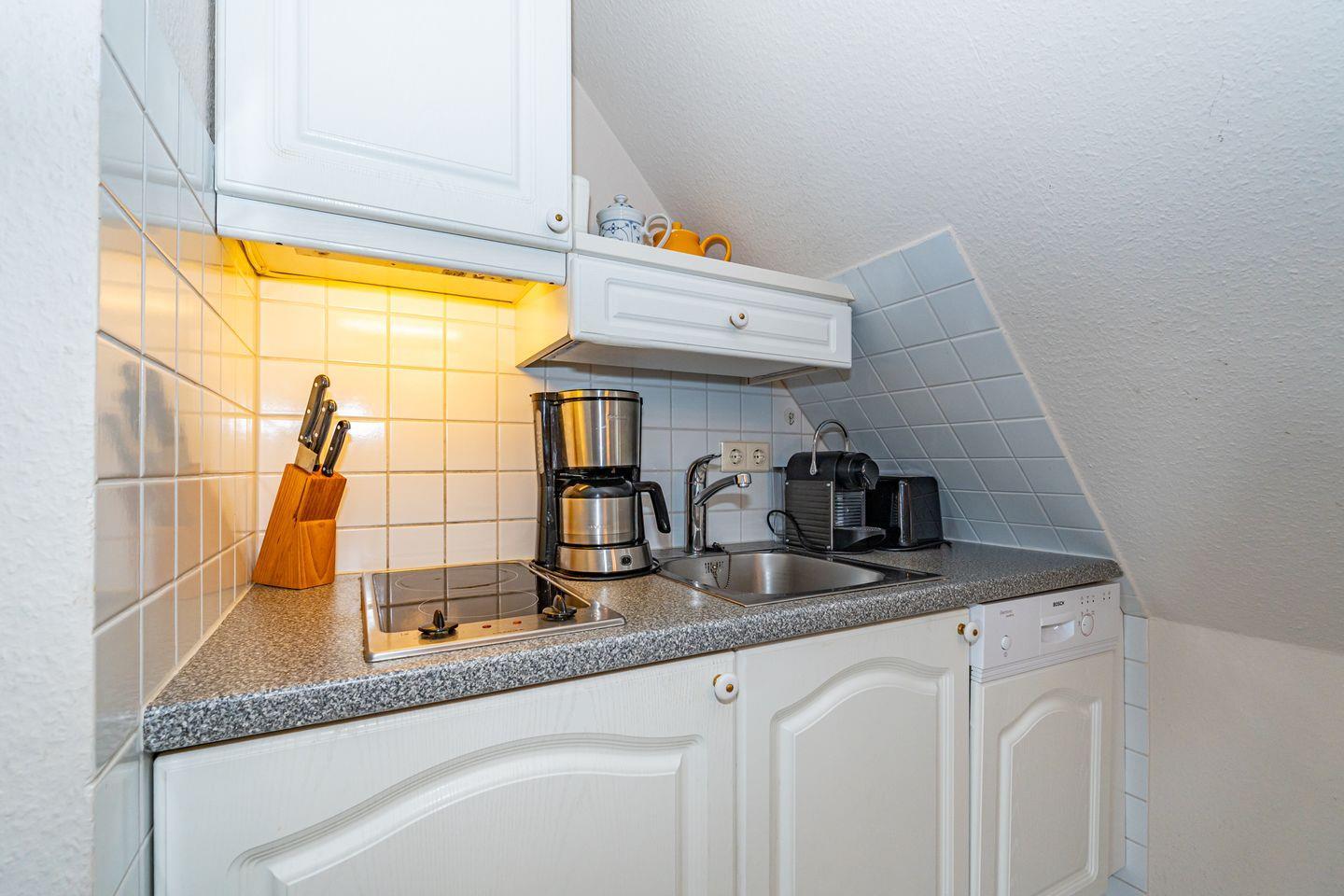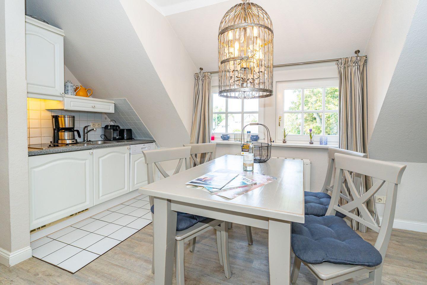 Diese 2-Zimmer-Ferienwohnung Roseneck (ca. 45 qm, im 1. OG) befindet sich im schönen Alt-Westerland und bietet Platz für bis zu zwei Personen. Durch ihre Dachschrägen hat sie einen ganz besonderen Charme. Die offen gestaltete, kleine Pantryküche (Nespresso, Cerankochfeld, Spülmaschine, Filterkaffeemaschine) grenzt an den Esstisch mit Stühlen. Das helle Wohnzimmer verfügt über ein Sofa und TV. Das Bad (ebenfalls mit Schrägen) verfügt über eine Wannen-Dusch-Kombination. Im kleinen Schlafzimmer sind ein Doppelbett (160 x 200 cm) und weiße Einbauschränke vorhanden. Zu dieser Ferienwohnung gehören eine Sonnenkuhle und ein Pkw-Stellplatz, direkt hinter dem Haus. Bitte beachten Sie, dass dies eine Nichtraucherwohnung ist und es kein WLAN gibt.
