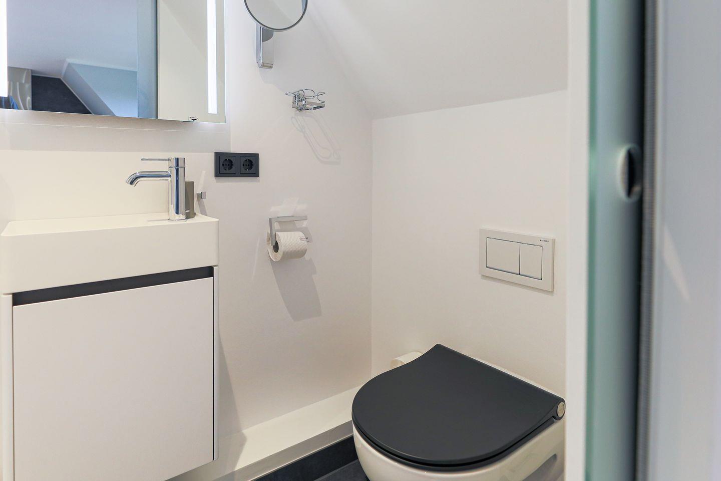 Das Duschbad ist durch eine platzsparende Schiebetür abgetrennt und ganz in Weiß mit grauen Akzenten gehalten.