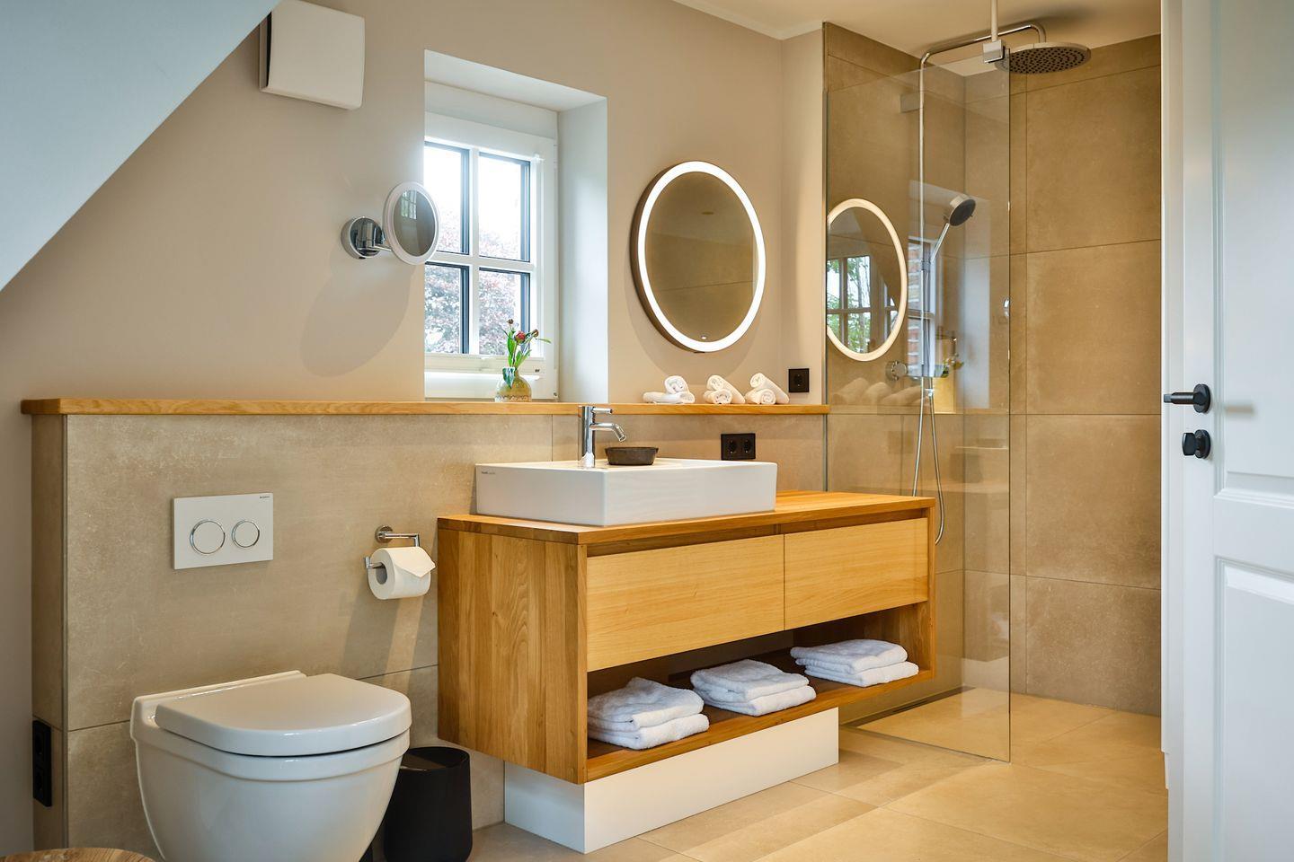 Das "Salzwiesen Hüs" besticht mit zwei modernen Tageslichtbädern, mit ebenerdiger Dusche, freistehender Badewanne und einer komfortablen KLAF Sauna für bis zu 4 Personen. Ihnen steht eine Waschmaschine sowie ein Trockner für die individuelle Nutzung zur Verfügung. Ein Gartenteil mit Friesenwall, Strandroggen und eigenem Parkplatz vor der Haustür darf nicht fehlen.
