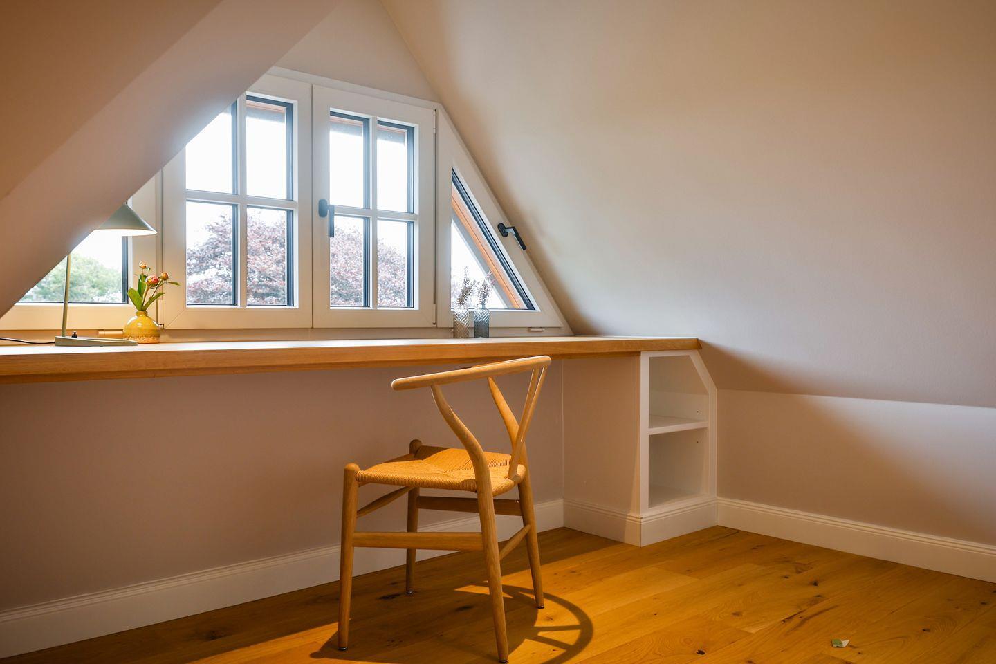 Der ausgebaute Spitzboden des Hauses bietet eine gemütliche "Liegewiese" (140x200?cm) sowie einen großzügigen Schreibtisch mit Blick über die Salzwiesen und das Rantumer Becken.