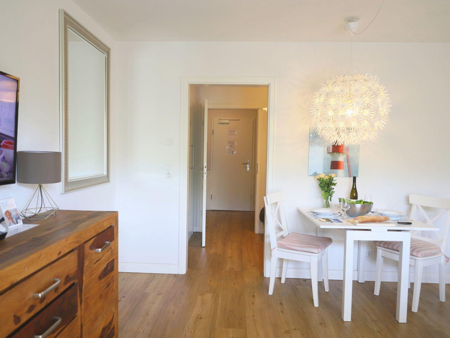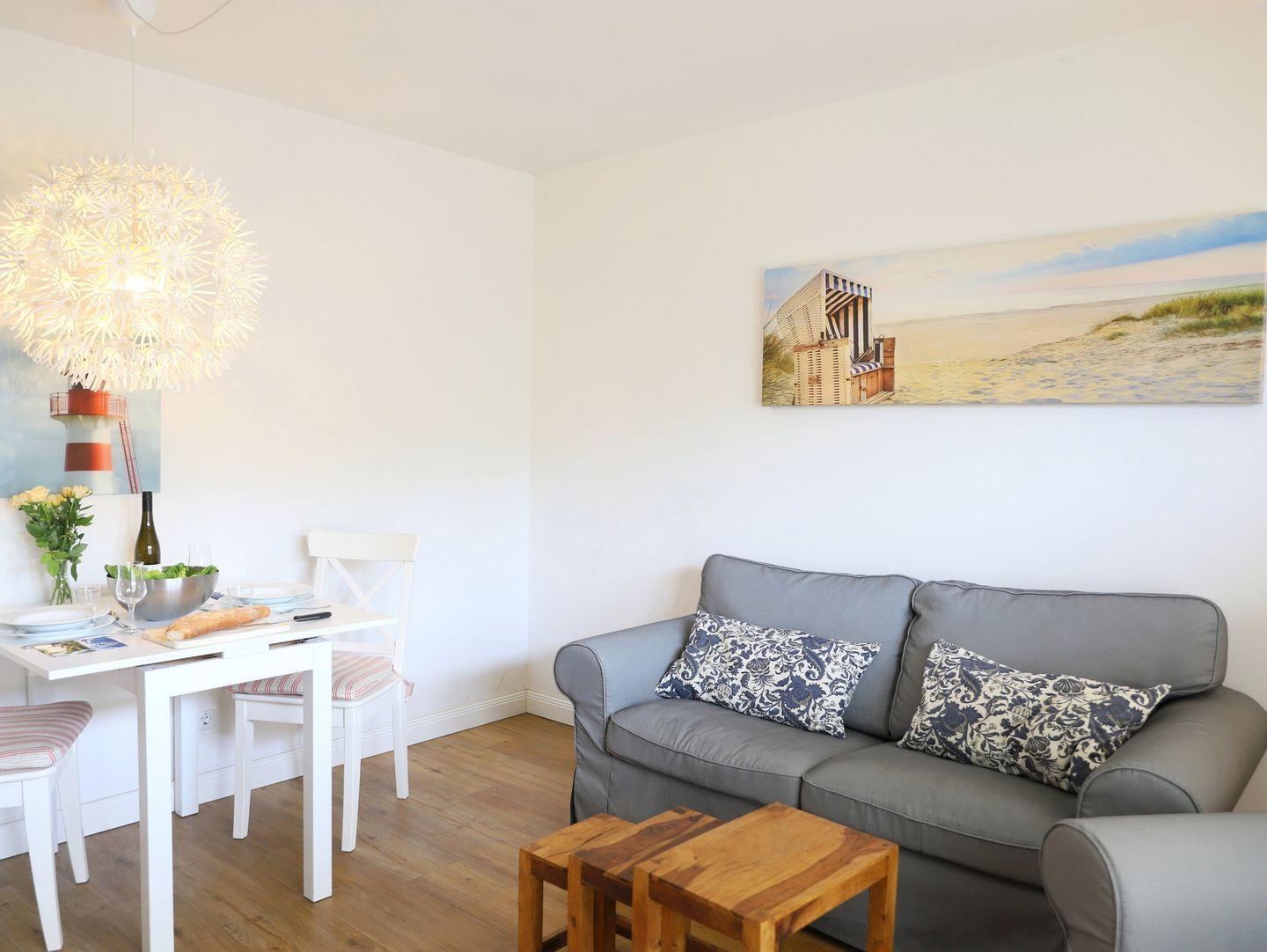 Diese stilvolle 32 m² große Ferienwohnung in Tinnum bietet Platz für 2 Personen und überzeugt durch ihre moderne Einrichtung und zentrale Lage. Der Wohn-/Essbereich verfügt über eine Küchenzeile und direkten Zugang zur sonnigen Süd-Terrasse mit Gartentisch und Stühlen. Der Schlafbereich ist mit einem komfortablen Doppelbett (160 x 200 cm) ausgestattet. Das Bad bietet eine Dusche und WC. Im Keller stehen Waschmaschine und Trockner zur Verfügung. Einkaufsmöglichkeiten sind nur 2 Minuten entfernt, und ein kostenfreier Stellplatz gehört zur Wohnung. Haustiere sind herzlich willkommen.