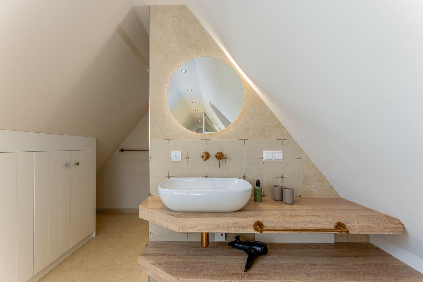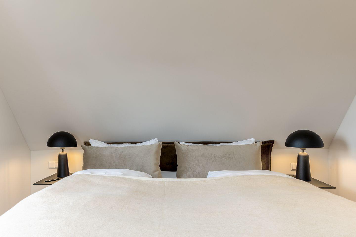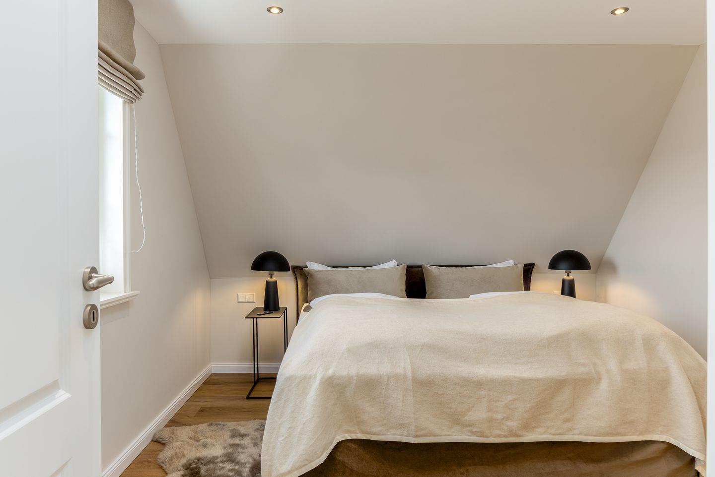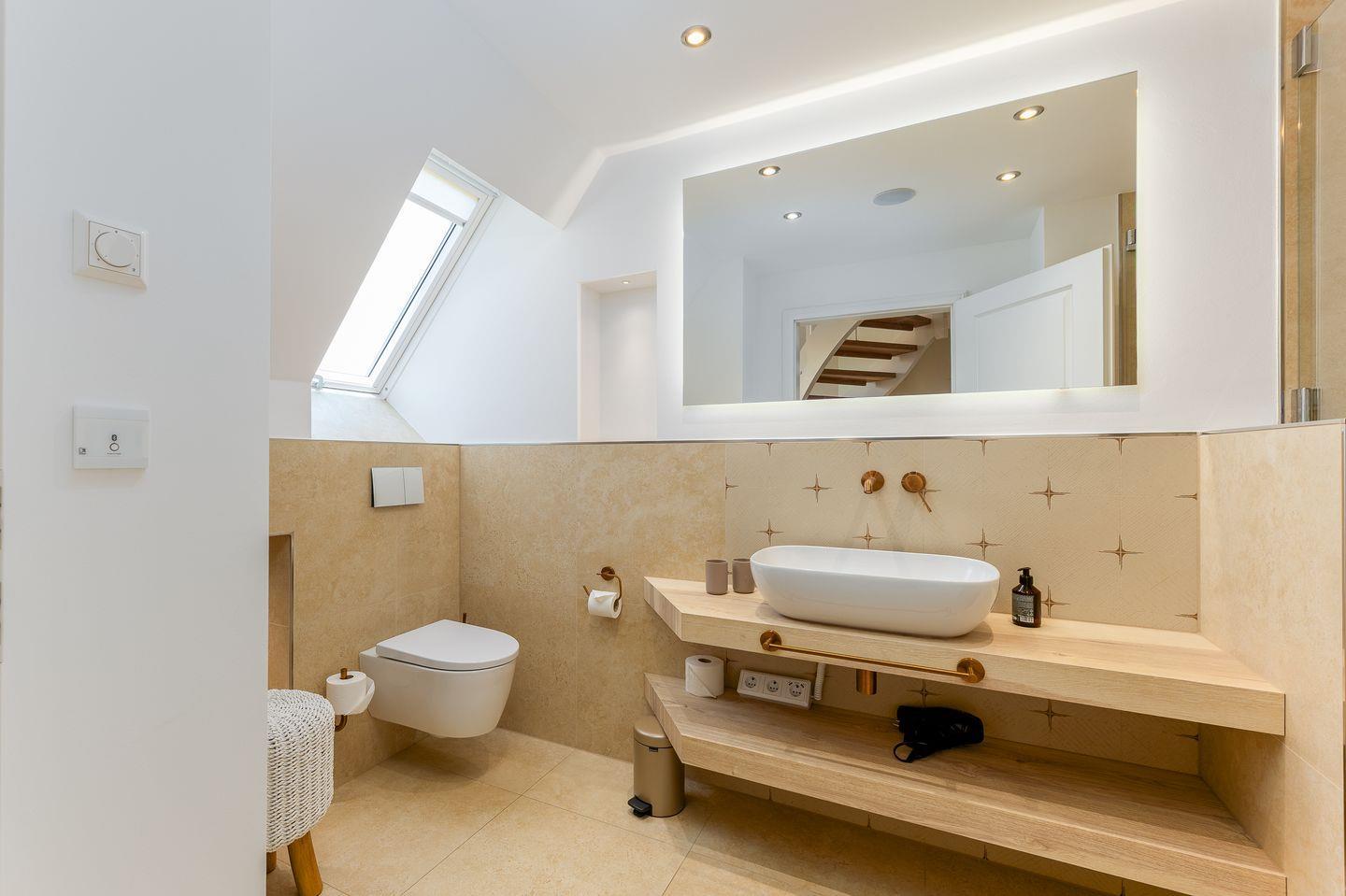 Ebenfalls im Obergeschoss befindet sich auch eins der beiden Schlafzimmer. Hier ist alles auf schöne Träume ausgerichtet: verantwortlich dafür sind das hochwertige und kuschelige Boxspringbett, harmonische Farben sowie ein kluges Lichtkonzept. Das Badezimmer auf dieser Etage trumpft nicht nur durch seine große Walk-in-Dusche, sondern auch durch einen stillvollen Holzwaschtisch und Armaturen sowie Accessoires in Messing auf.