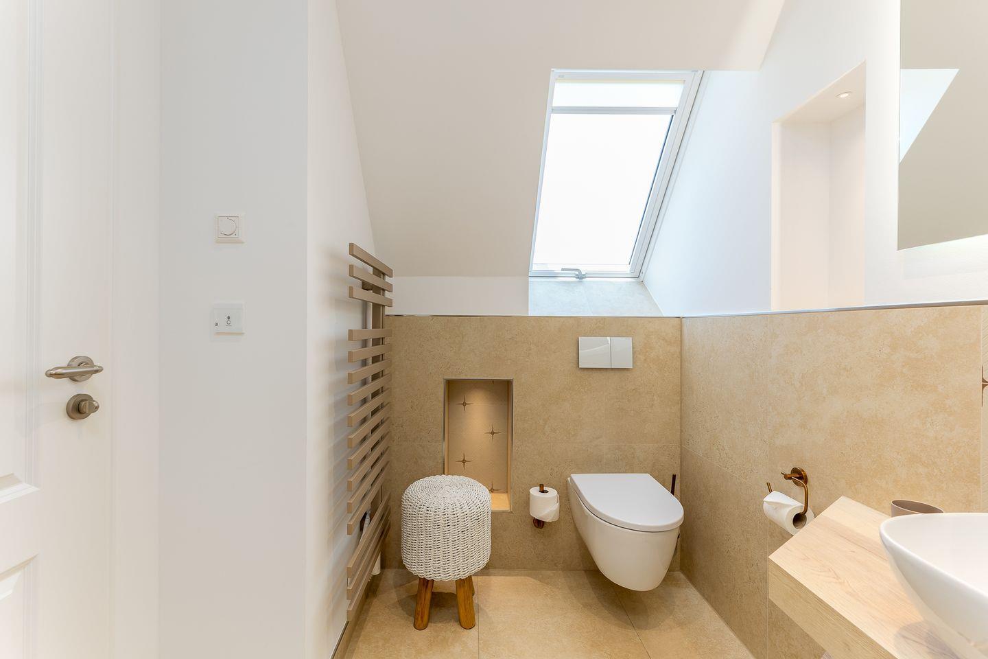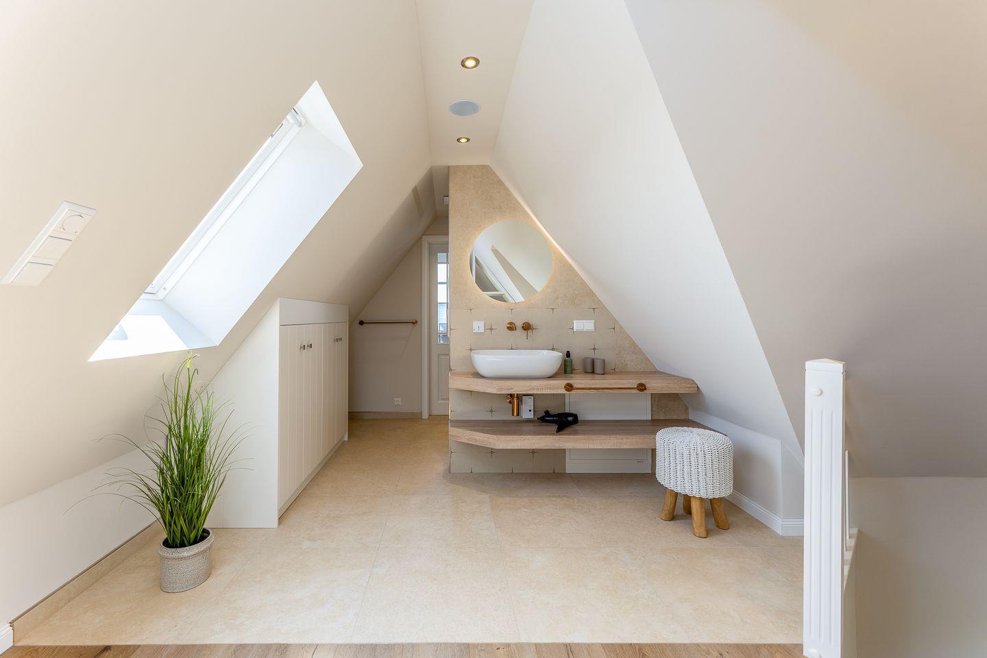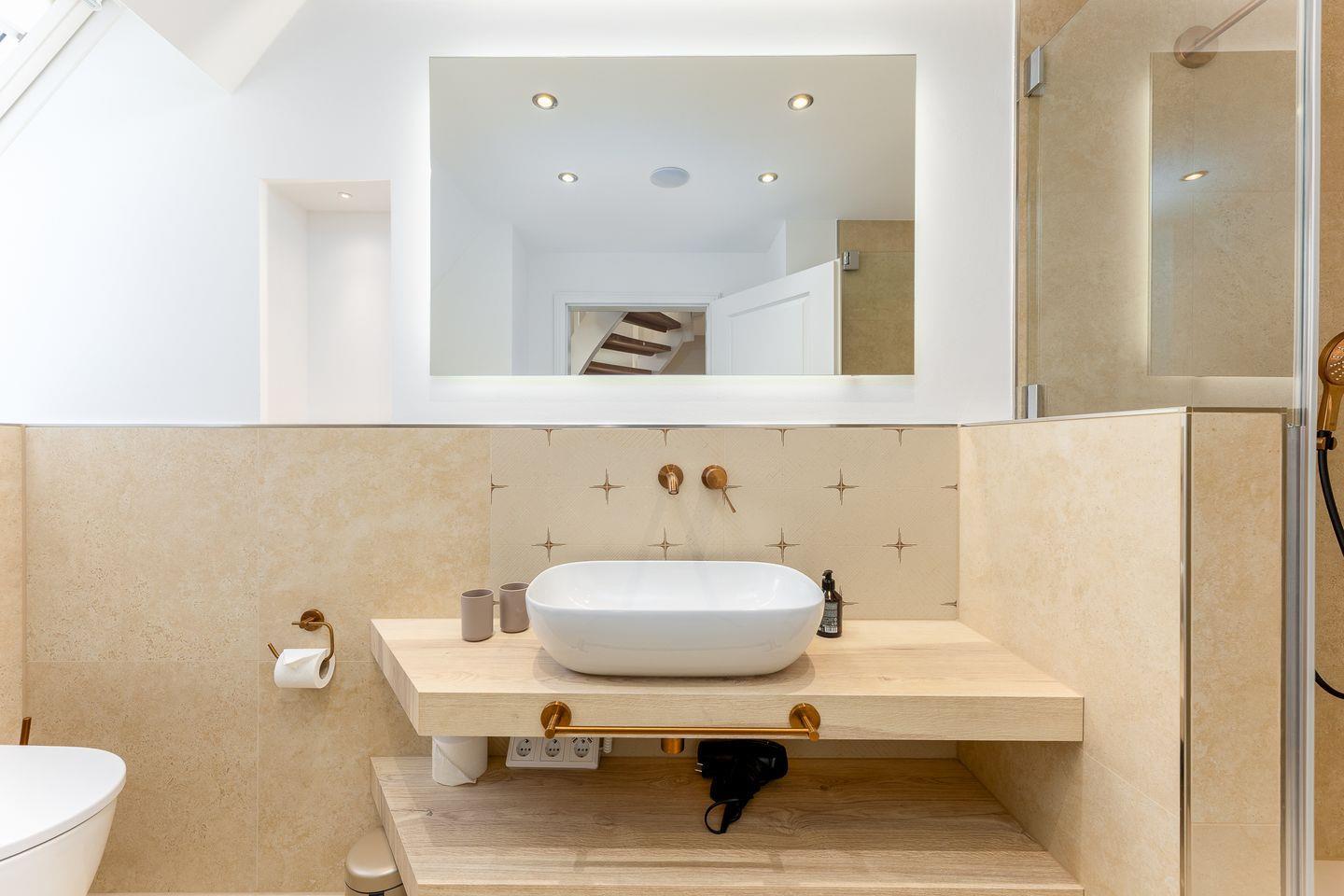 Ebenfalls im Obergeschoss befindet sich auch eins der beiden Schlafzimmer. Hier ist alles auf schöne Träume ausgerichtet: verantwortlich dafür sind das hochwertige und kuschelige Boxspringbett, harmonische Farben sowie ein kluges Lichtkonzept. Das Badezimmer auf dieser Etage trumpft nicht nur durch seine große Walk-in-Dusche, sondern auch durch einen stillvollen Holzwaschtisch und Armaturen sowie Accessoires in Messing auf.