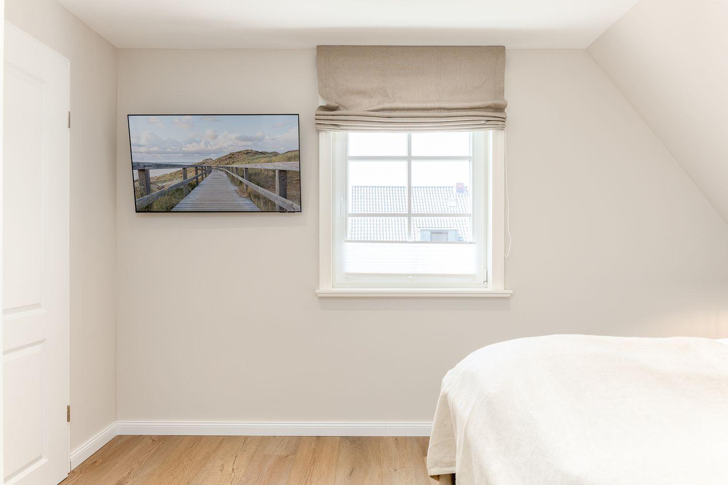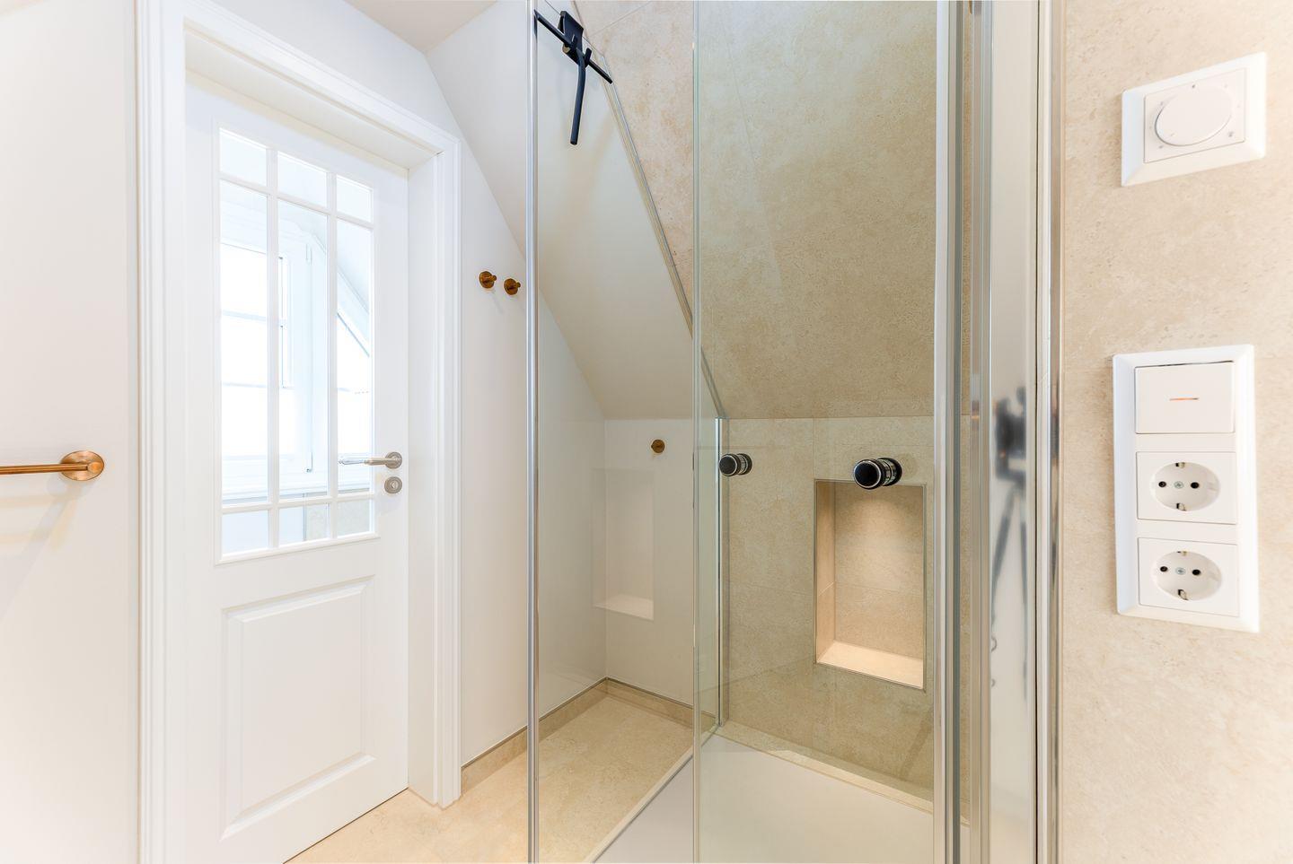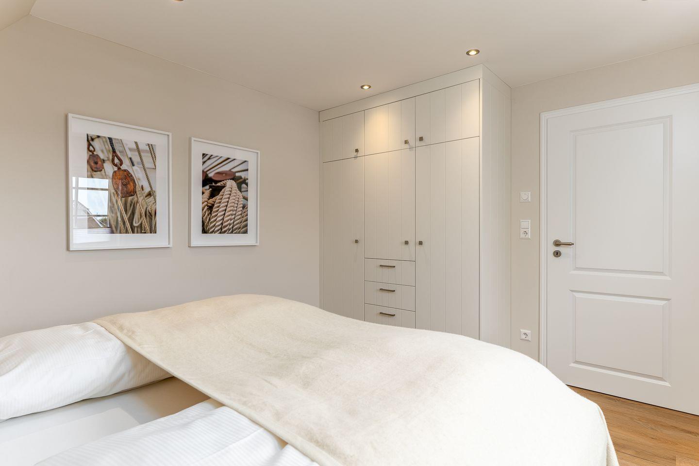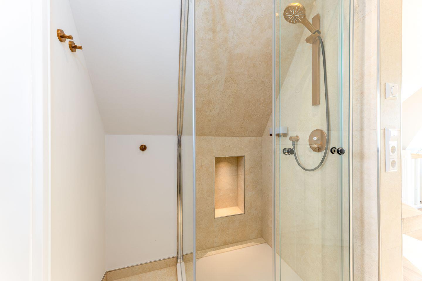 Ebenfalls im Obergeschoss befindet sich auch eins der beiden Schlafzimmer. Hier ist alles auf schöne Träume ausgerichtet: verantwortlich dafür sind das hochwertige und kuschelige Boxspringbett, harmonische Farben sowie ein kluges Lichtkonzept. Das Badezimmer auf dieser Etage trumpft nicht nur durch seine große Walk-in-Dusche, sondern auch durch einen stillvollen Holzwaschtisch und Armaturen sowie Accessoires in Messing auf.