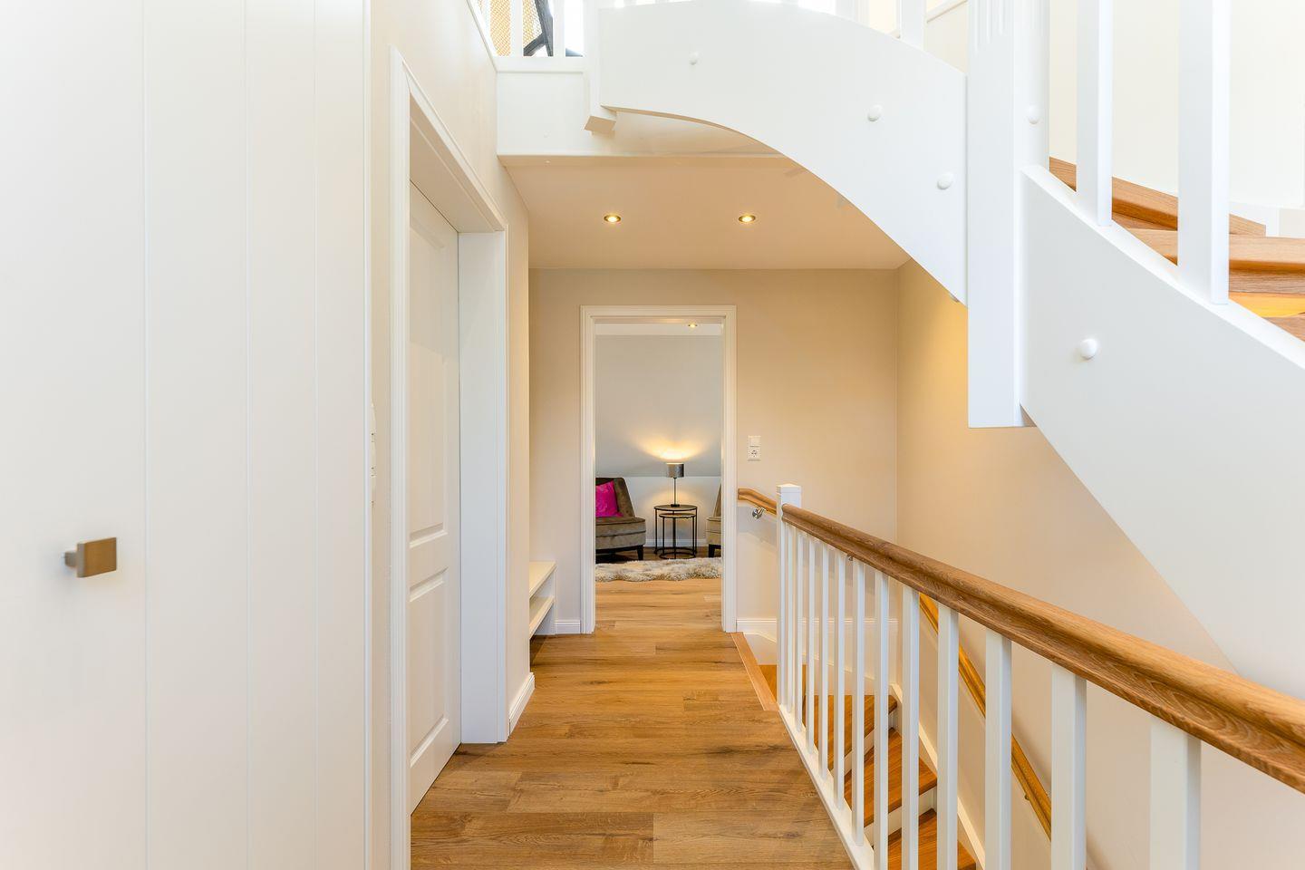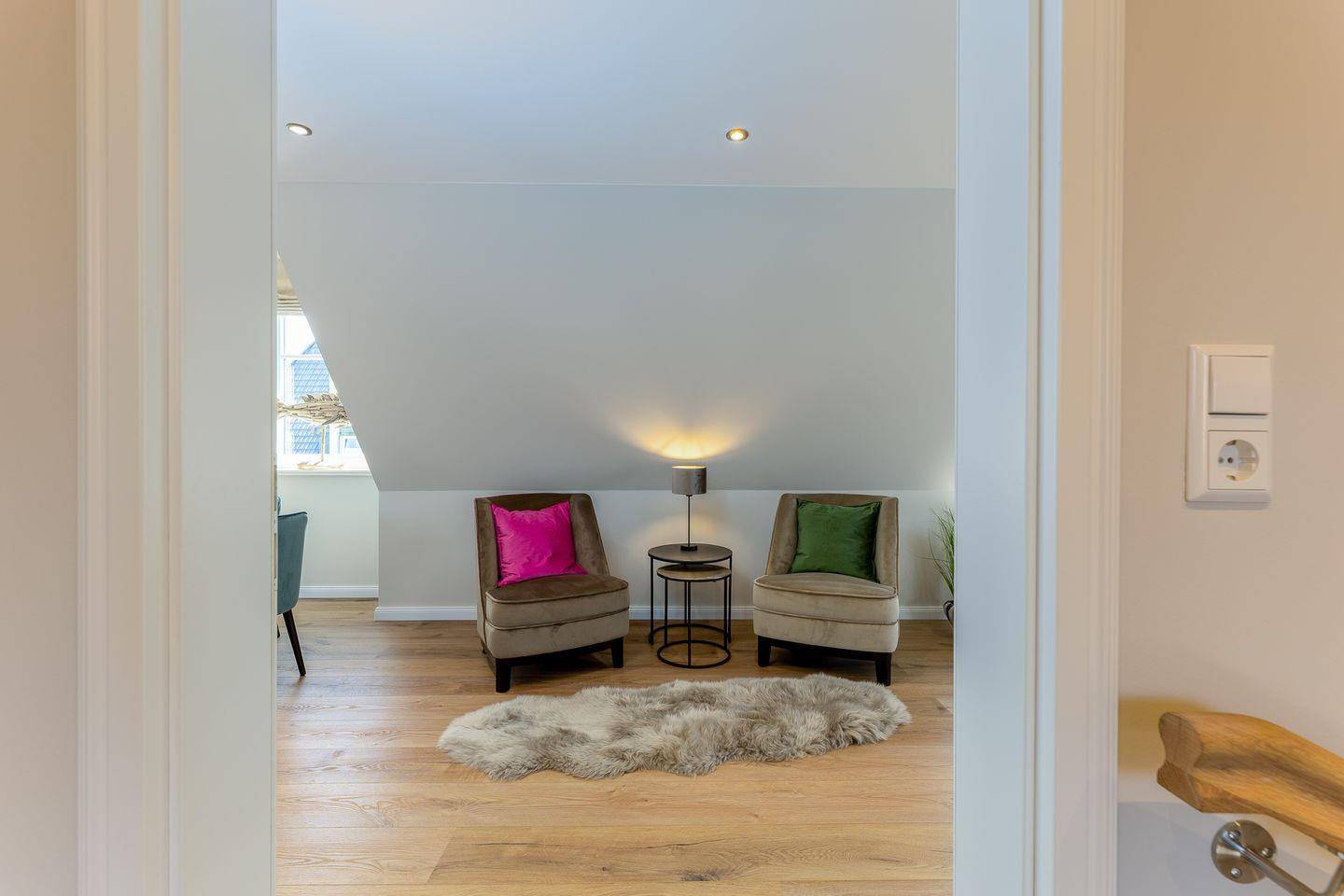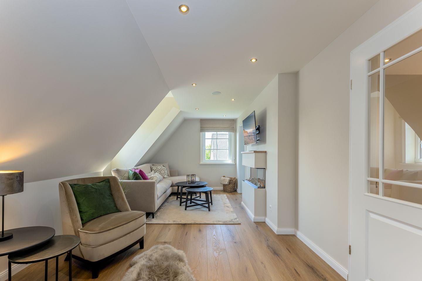 Ein Urlaubszuhause wie ein ruhiger Hafen: Die Einbauten und das Interieur sind durchweg in hellen, erdigen Tönen gehalten, einzig ein paar Möbel und Accessoires setzen farbige Akzente. Der Wohnbereich im ersten Obergeschoss ist ein toller Stilmix aus coolen Stücken und Scandi-Muckeligkeit in dem ein E-Kamin rundum pure Behaglichkeit schafft. Hier findet jeder seinen Lieblingsplatz, sei es auf der gemütlichen Couch oder den beiden Loungesesseln. Gleich um die Ecke befindet sich die offene Küche nebst Weinschrank. Was dort gezaubert wird, kann anschließend gemeinsam am großen Esstisch genossen werden.