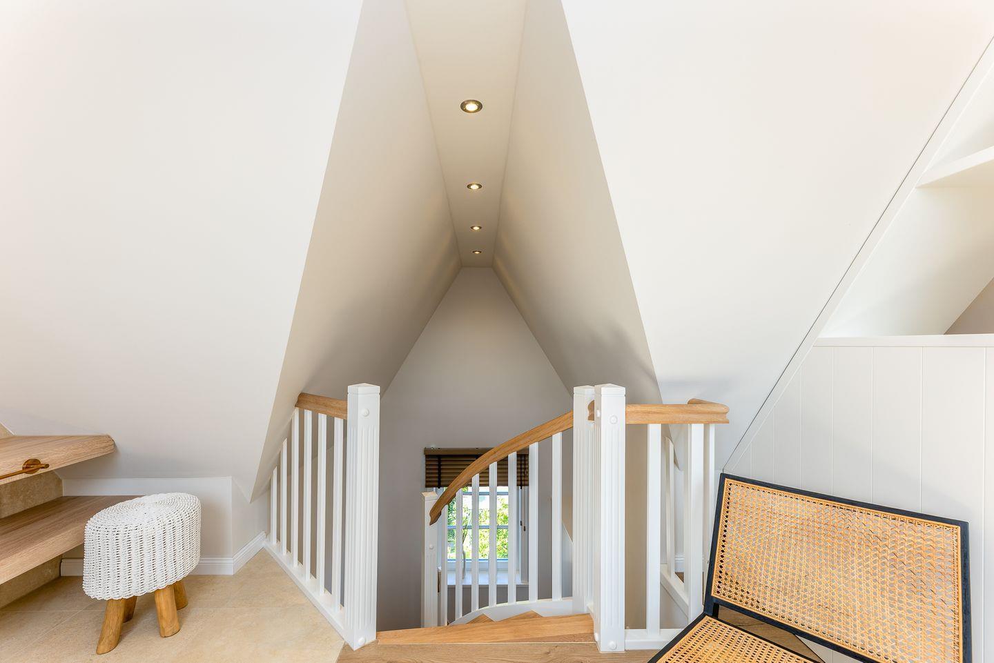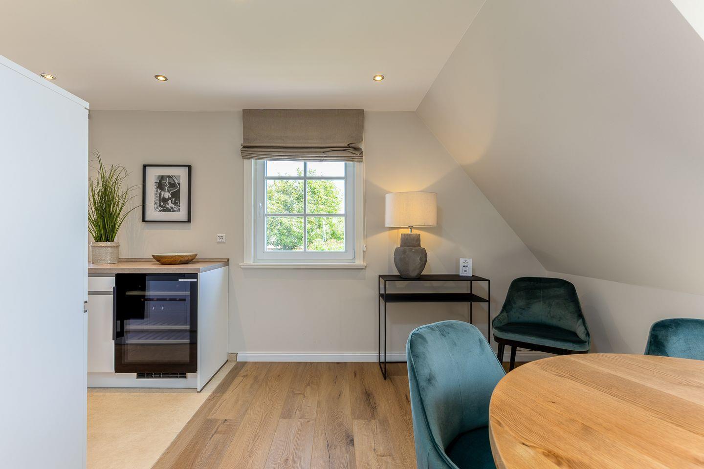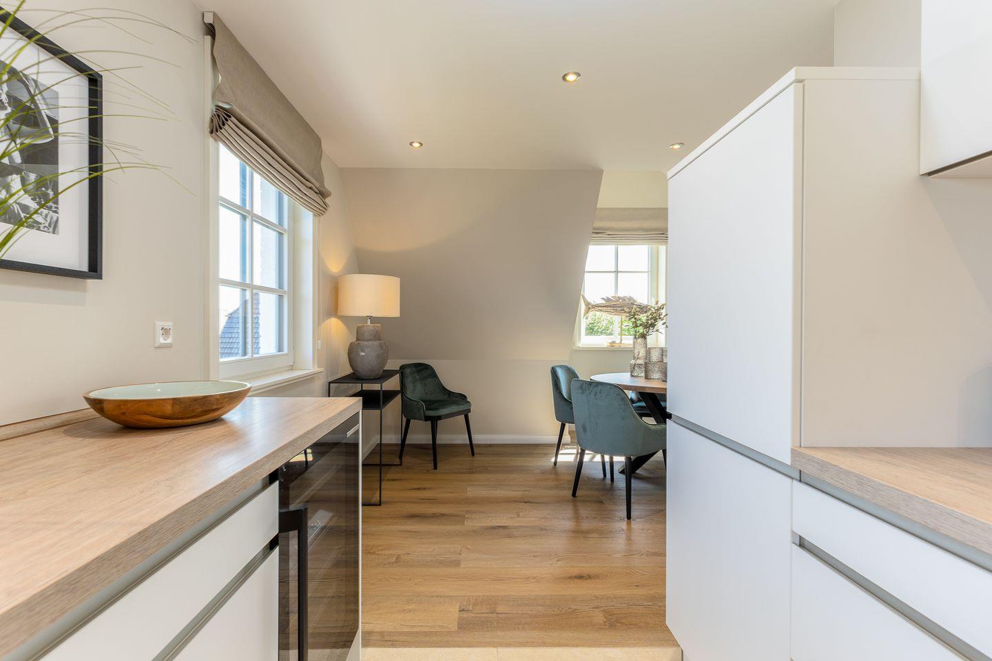 Ein Urlaubszuhause wie ein ruhiger Hafen: Die Einbauten und das Interieur sind durchweg in hellen, erdigen Tönen gehalten, einzig ein paar Möbel und Accessoires setzen farbige Akzente. Der Wohnbereich im ersten Obergeschoss ist ein toller Stilmix aus coolen Stücken und Scandi-Muckeligkeit in dem ein E-Kamin rundum pure Behaglichkeit schafft. Hier findet jeder seinen Lieblingsplatz, sei es auf der gemütlichen Couch oder den beiden Loungesesseln. Gleich um die Ecke befindet sich die offene Küche nebst Weinschrank. Was dort gezaubert wird, kann anschließend gemeinsam am großen Esstisch genossen werden.