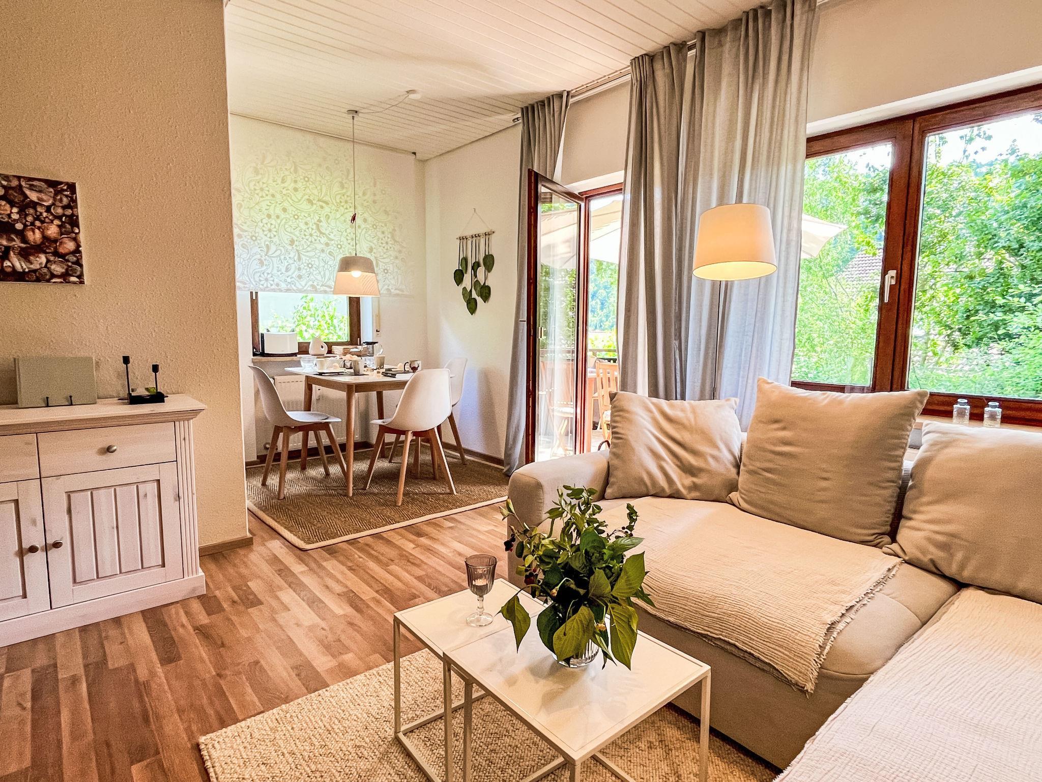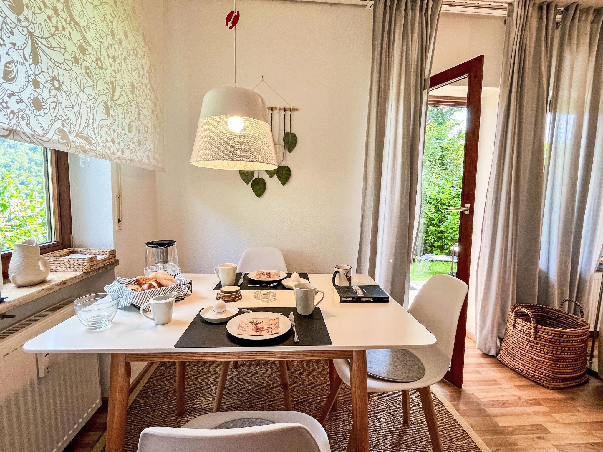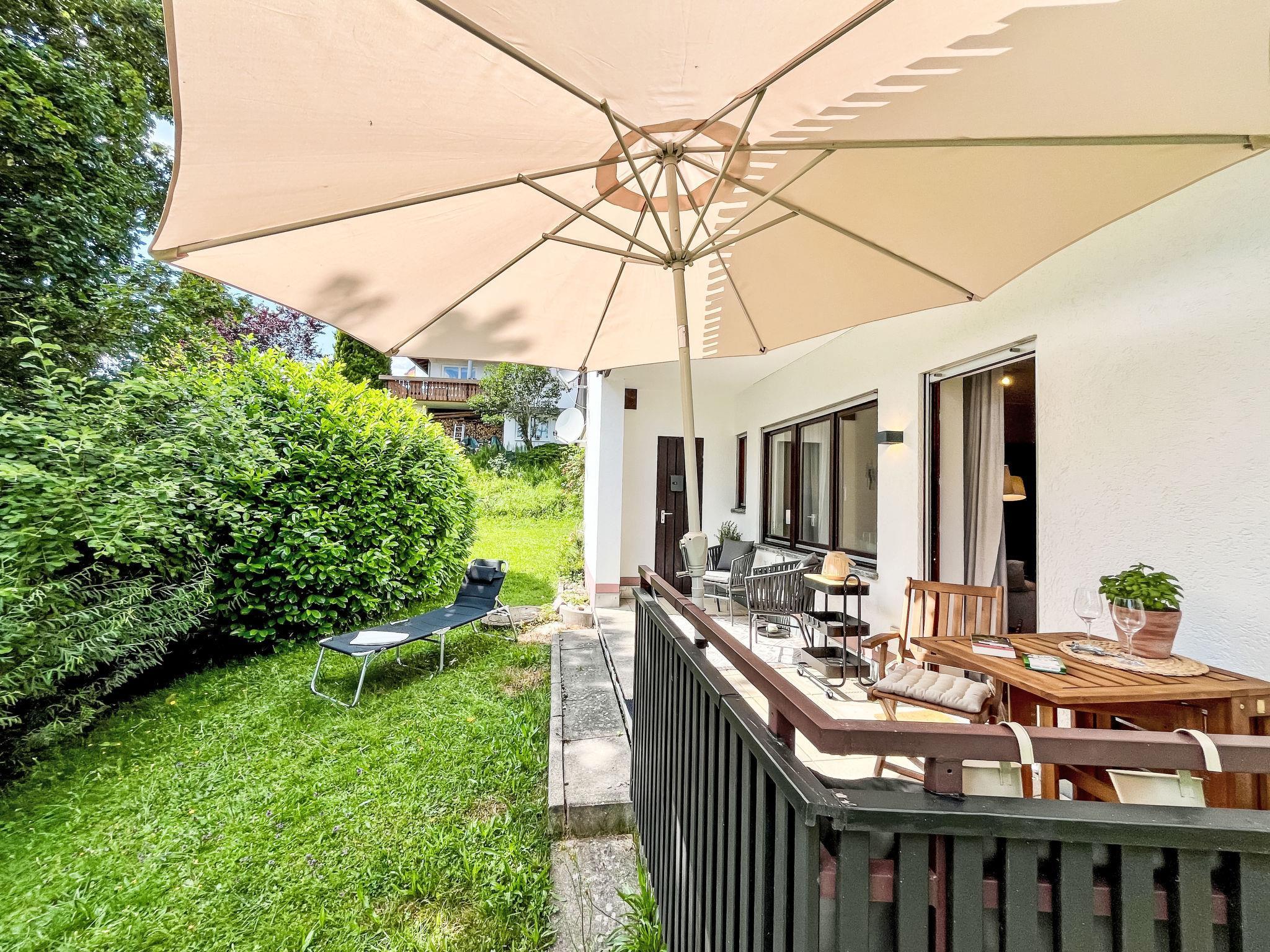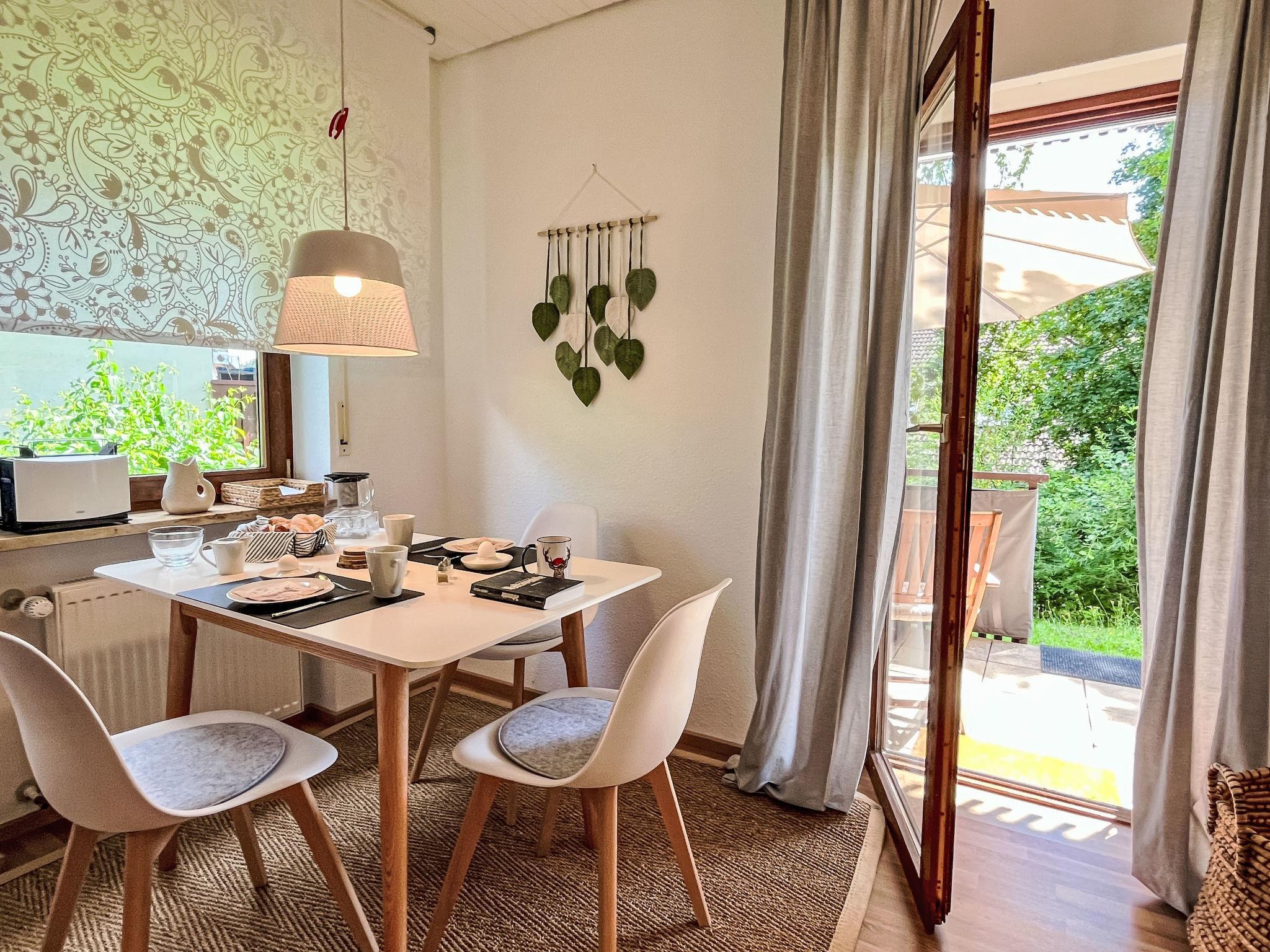 "Bergsonne", 2-room apartment 48 m2, lower ground floor. Spacious and bright, beautiful and tasteful furnishings: entrance hall. Living/dining room with satellite TV (flat screen). Exit to the terrace. 1 large room with 1 double bed (2 x 90 cm, length 200 cm). Small, open kitchen (oven, dishwasher, 3 ceramic glass hob hotplates, toaster, kettle, microwave, electric coffee machine). Shower/WC. Oil heating. Terrace 16 m2. Terrace furniture, electric barbecue (portable), deck chairs (2). Beautiful view of the garden. Facilities: Internet (WiFi, free). Parking at the house. Please note: non-smokers only. Smoke alarm, fire extinguisher, no lift. Bed layout is flexible. There are more sleeping options available than the maximum number of people allowed which may, however, not be exceeded.