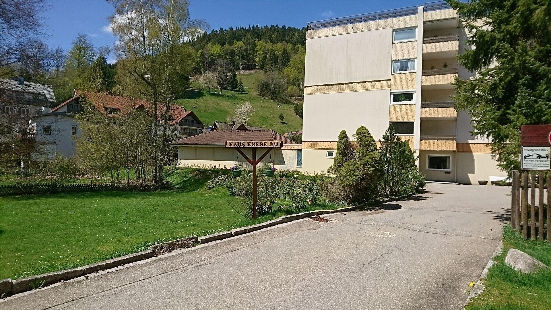 Der Außenbereich bietet genügend Parkmöglichkeiten. Jede Wohnung hat einen fest zugewiesenen Parkplatz. Eine große Liege- und Spielwiese schließt sich ans Hallenbad an. Auch ein Bach fließt am Haus und an der Spielwiese vorbei.