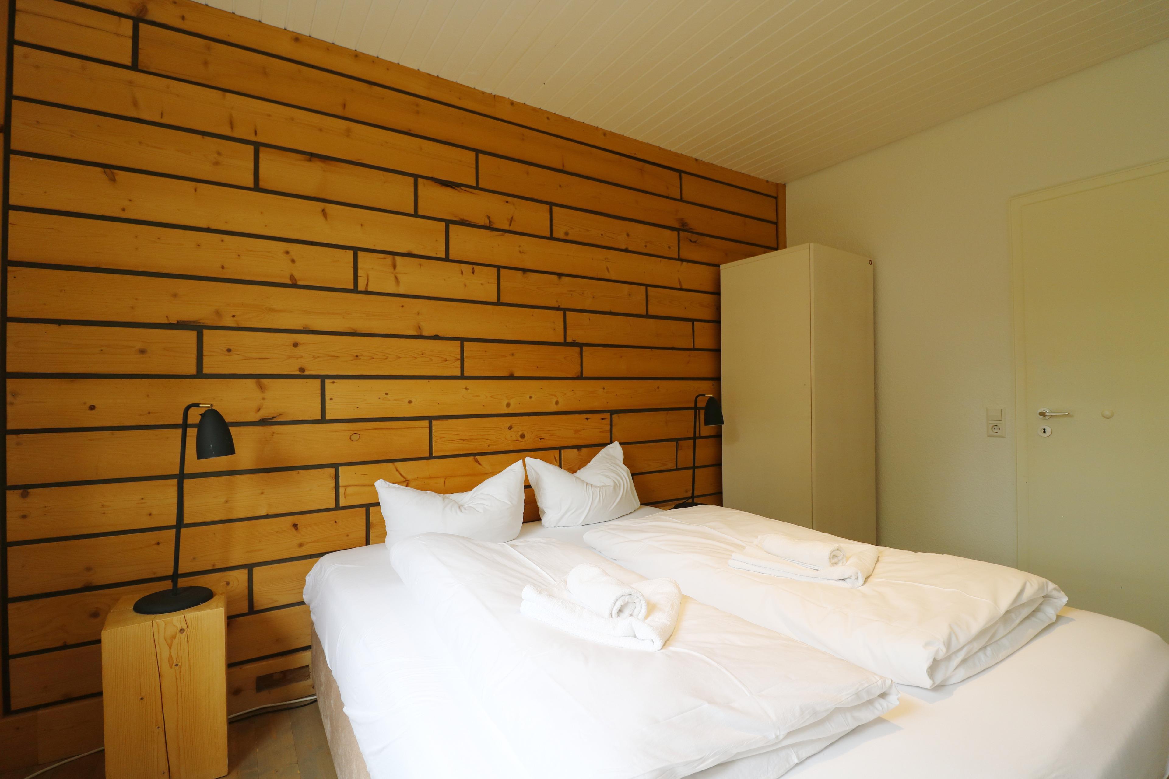 The design apartment impresses with a lovingly designed interior with partly wood or stone-paneled walls, tree stumps as bedside tables and a furniture line specially designed for the Upper Black Forest.