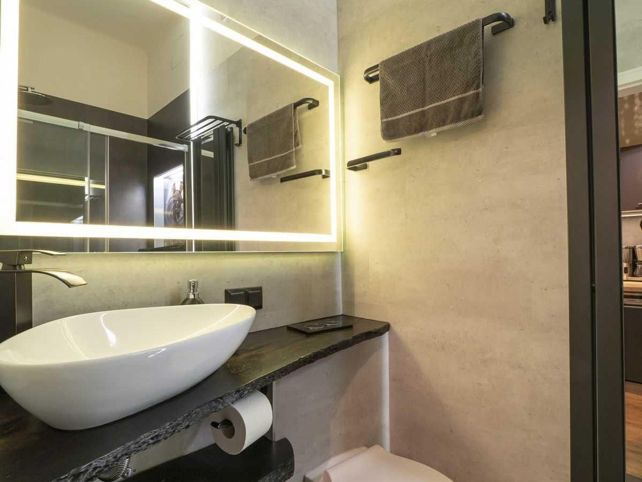 Das, mit liebevollen Details gestaltete Bad, beinhaltet eine großzügige, ebenerdige Dusche mit Thermostat u. Regendusche und einem „besonderen“ Blick auf den Wendelstein des Schlosses. Die Waschtischplatte mit einem Designwaschbecken, sowie die Ablagen sind handgefertigt aus mehrere tausend Jahre altem Mooreichenholz aus der Elbe. Ein Haarfön, Handseife, Handdesinfektion und Handtücher stehen natürlich ebenfalls zur Verfügung.
