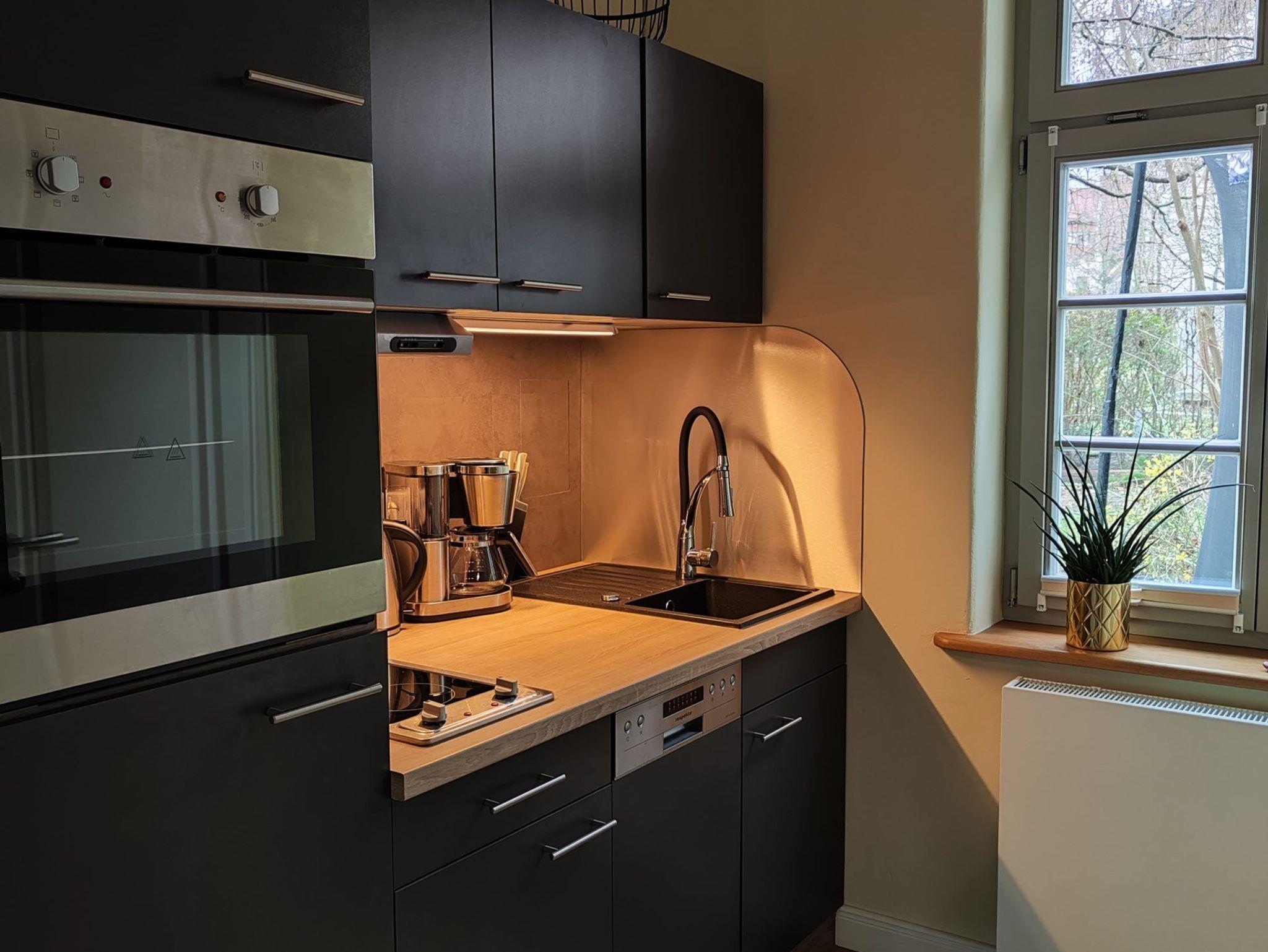 Die Ferienwohnung wurde Anfang 2022 fertiggestellt. Dabei wurde mit den verwendeten Materialien, wie Kalkputzen oder Holzfaserdämmung besonderer Wert auf ein gesundes Wohnklima gelegt. Die freigelegten historischen Fachwerkwände harmonieren mit der stilvollen Einrichtung aus Echtholzmöbeln und Leder. Besondere Akzente setzen handgefertigte Details aus schwarzem, mehrere tausend Jahre altem, Mooreichenholz aus der Elbe.
