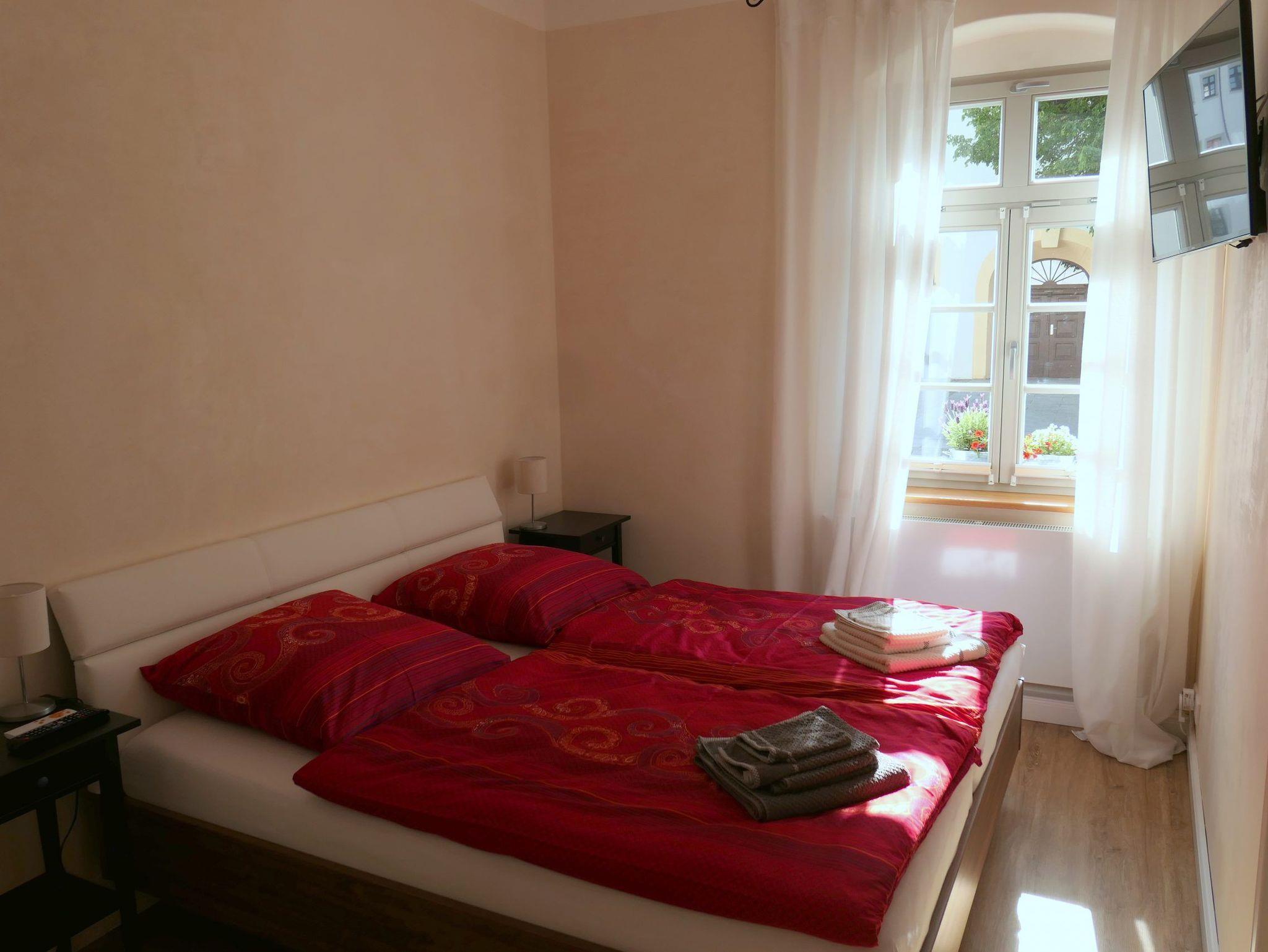 Die 40 m² große Ferienwohnung SchlossGarten, befindet sich im Erdgeschoss eines neu sanierten, mehr als 200 Jahre alten, als Einzeldenkmal geschützten Hauses unmittelbar vor dem Haupteingang von Schloss Hartenfels. Sie bietet einen großzügigen Wohnraum mit Kamin, ein Schlafzimmer mit Doppelbett, eine voll ausgestattete Küche und ein Badezimmer mit Du/WC.