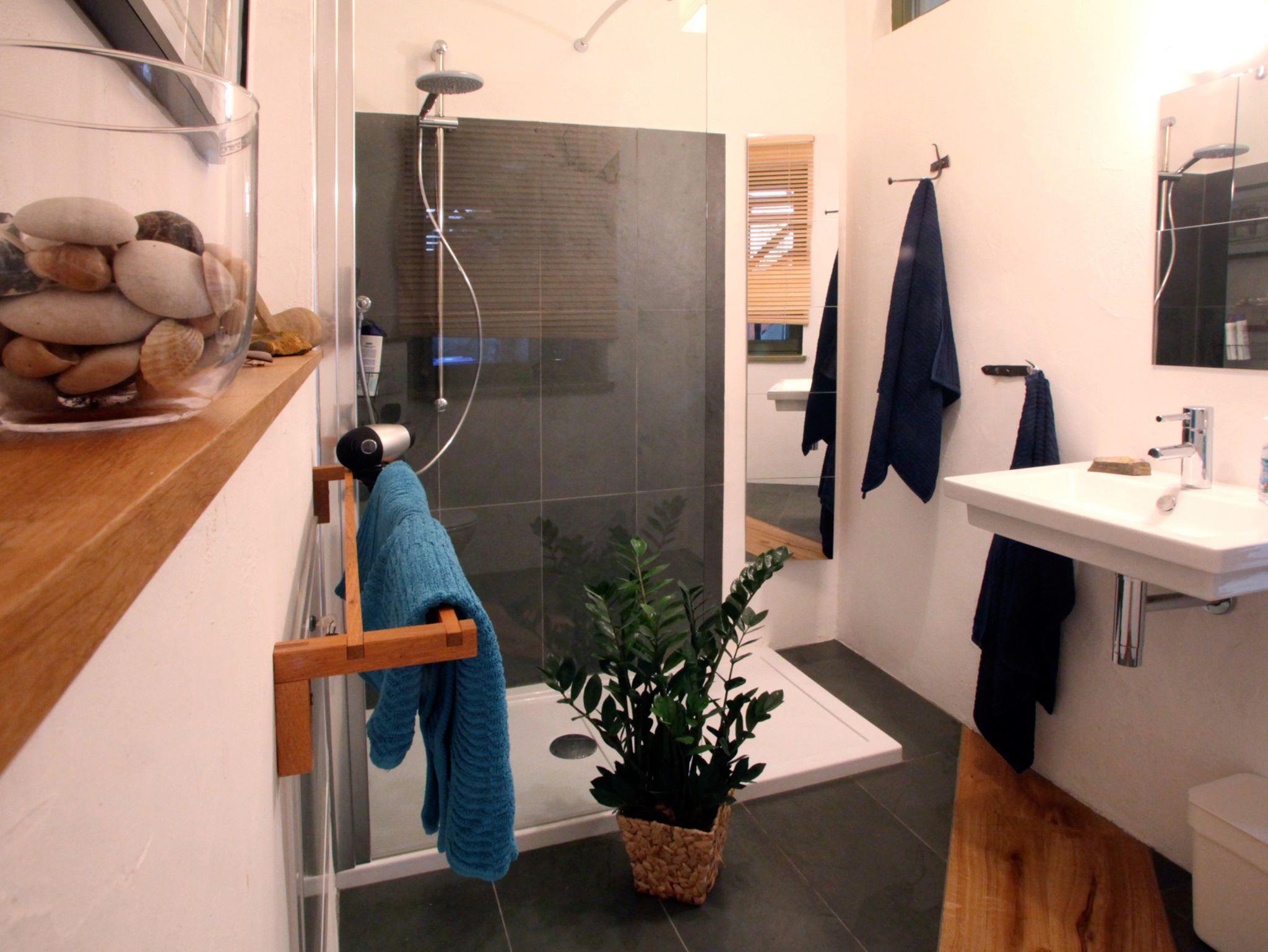 Das Bad ist mit Schiefer und Holz gestaltet. Hier finden sich besonders originelle Details,