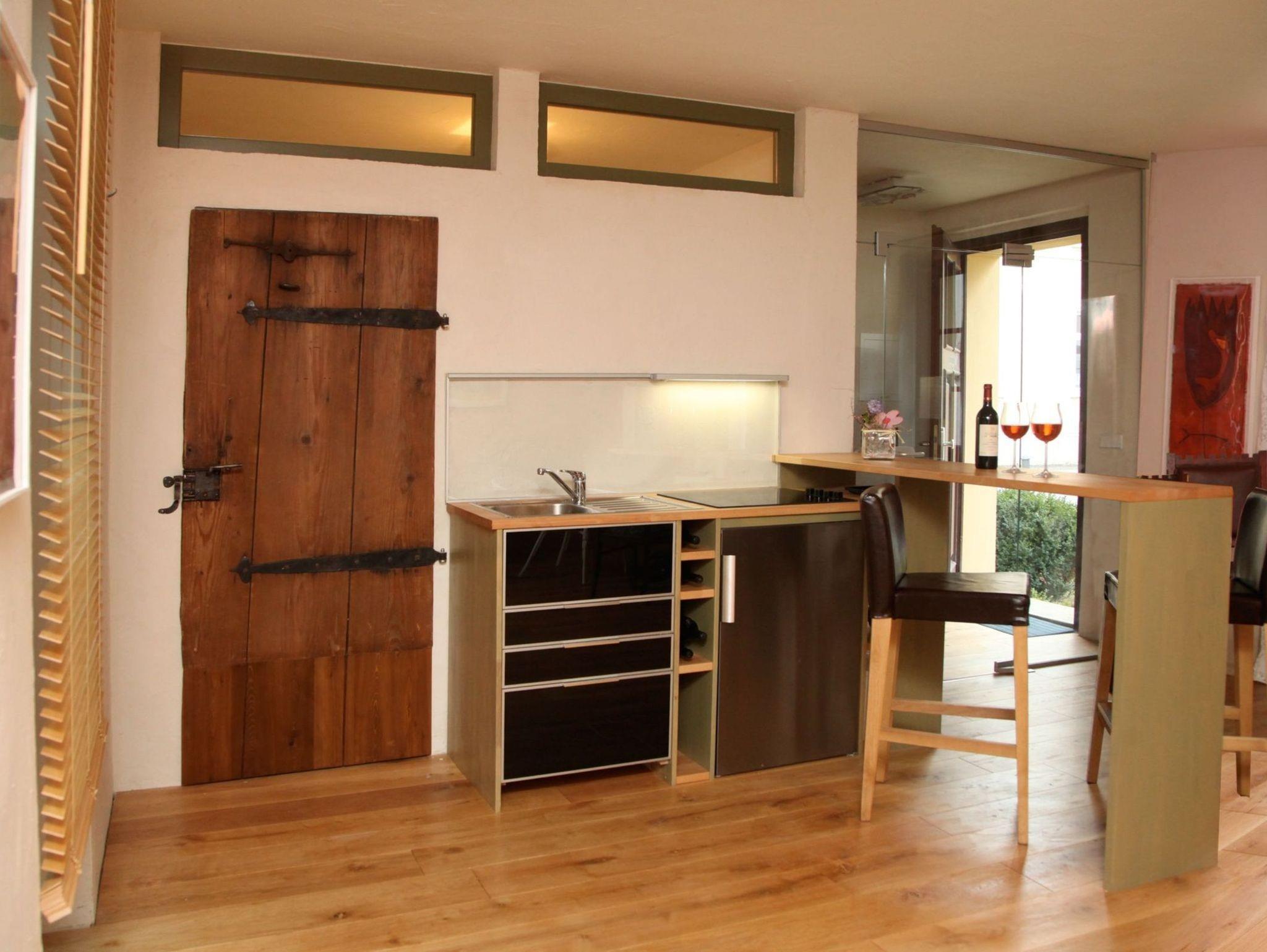 Der Wohnraum ist mit antiquaren und modernen Möbeln eingerichtet. Ein besonderes Schmuckstück ist die urige 300 Jahre alte Tür zum Bad mit historischen Beschlägen. Im Wohnraum befindet sich eine Küche mit Bartresen und zwei Barhockern. Ausgestattet ist diese mit 3 Herdplatten, Minibackofen, einem Kühlschrank mit Gefrierfach, Spülbecken, Koch- und Essgeschirr, Wasserkocher, Toaster, Kaffeemaschine, French- Press Kaffeekanne und Espressokocher.