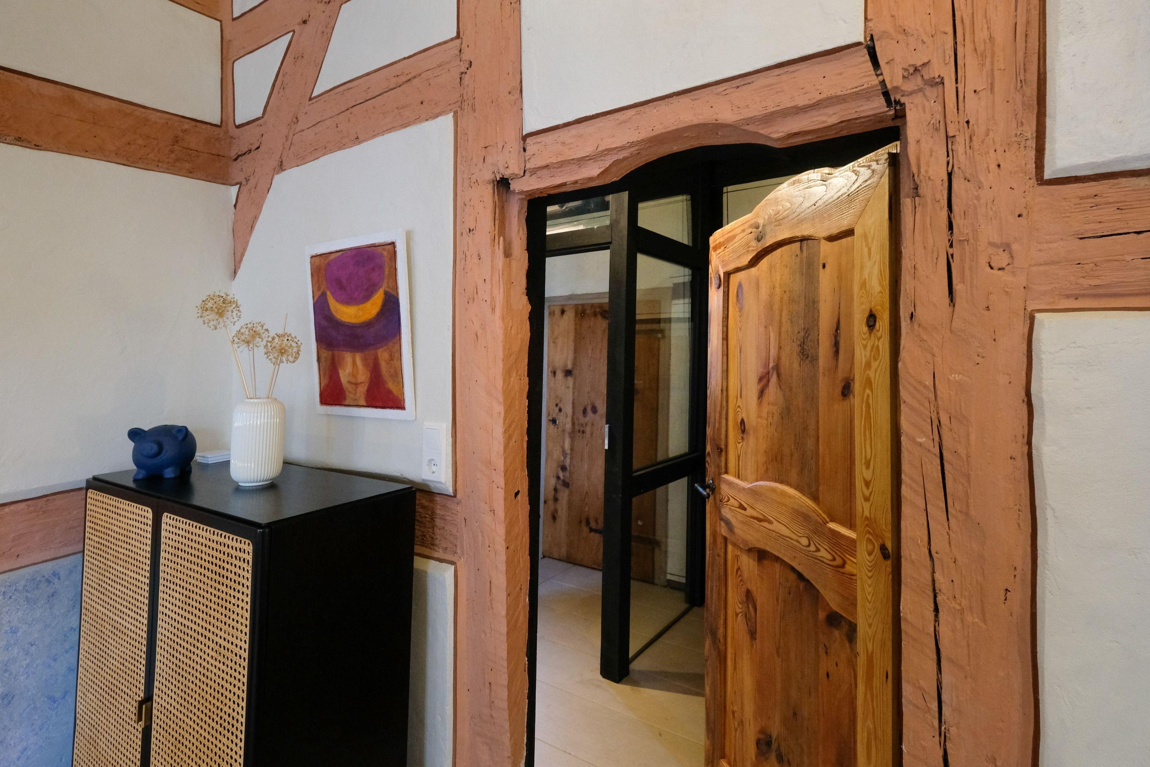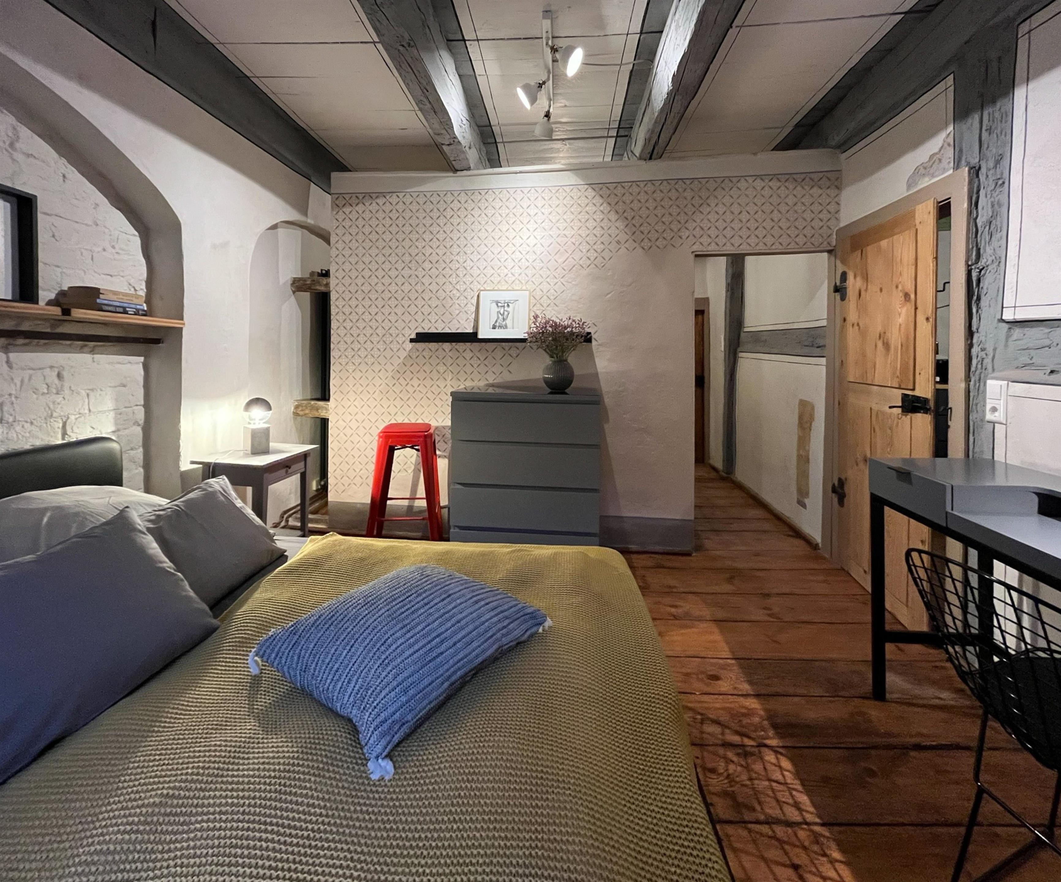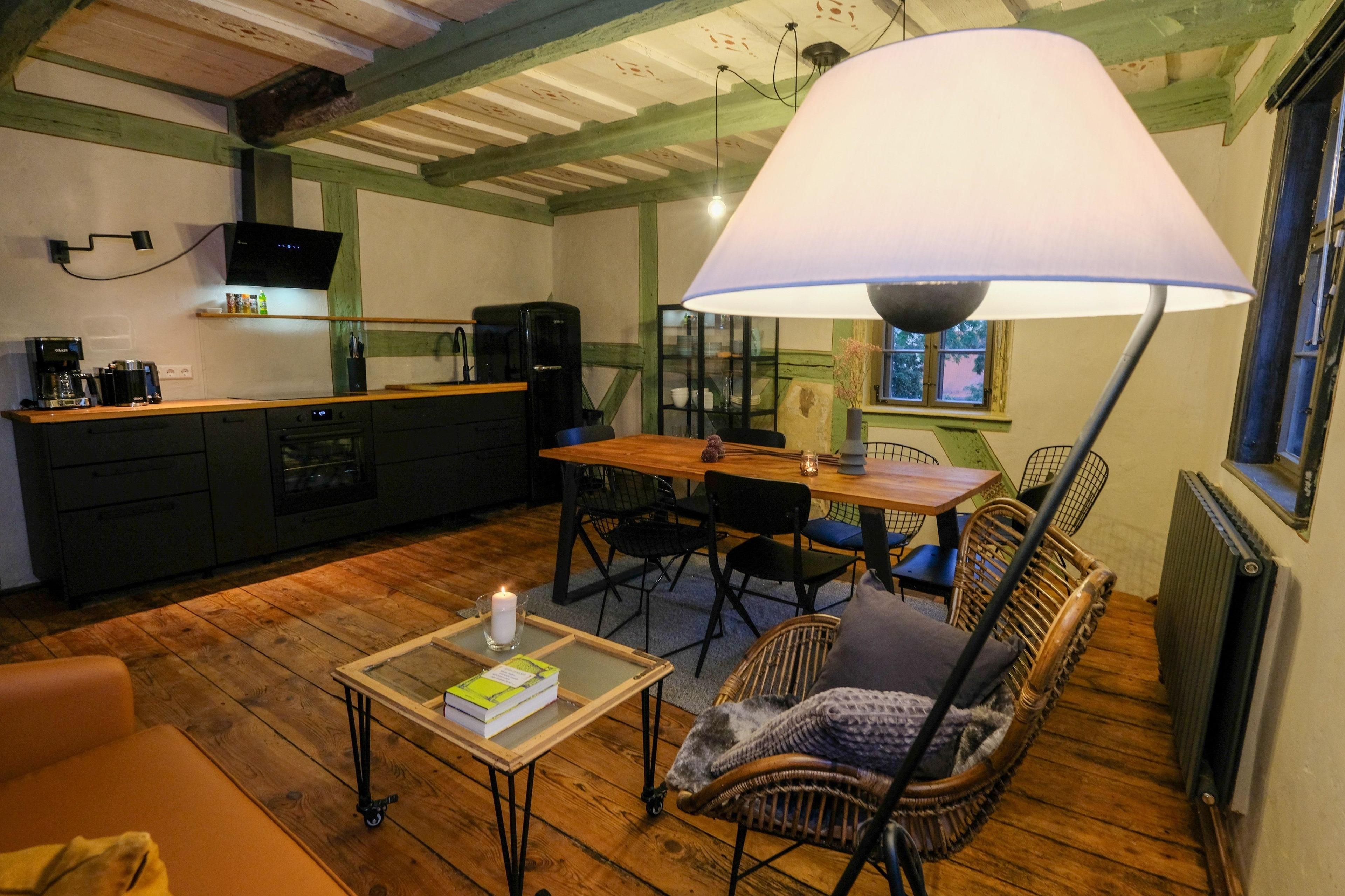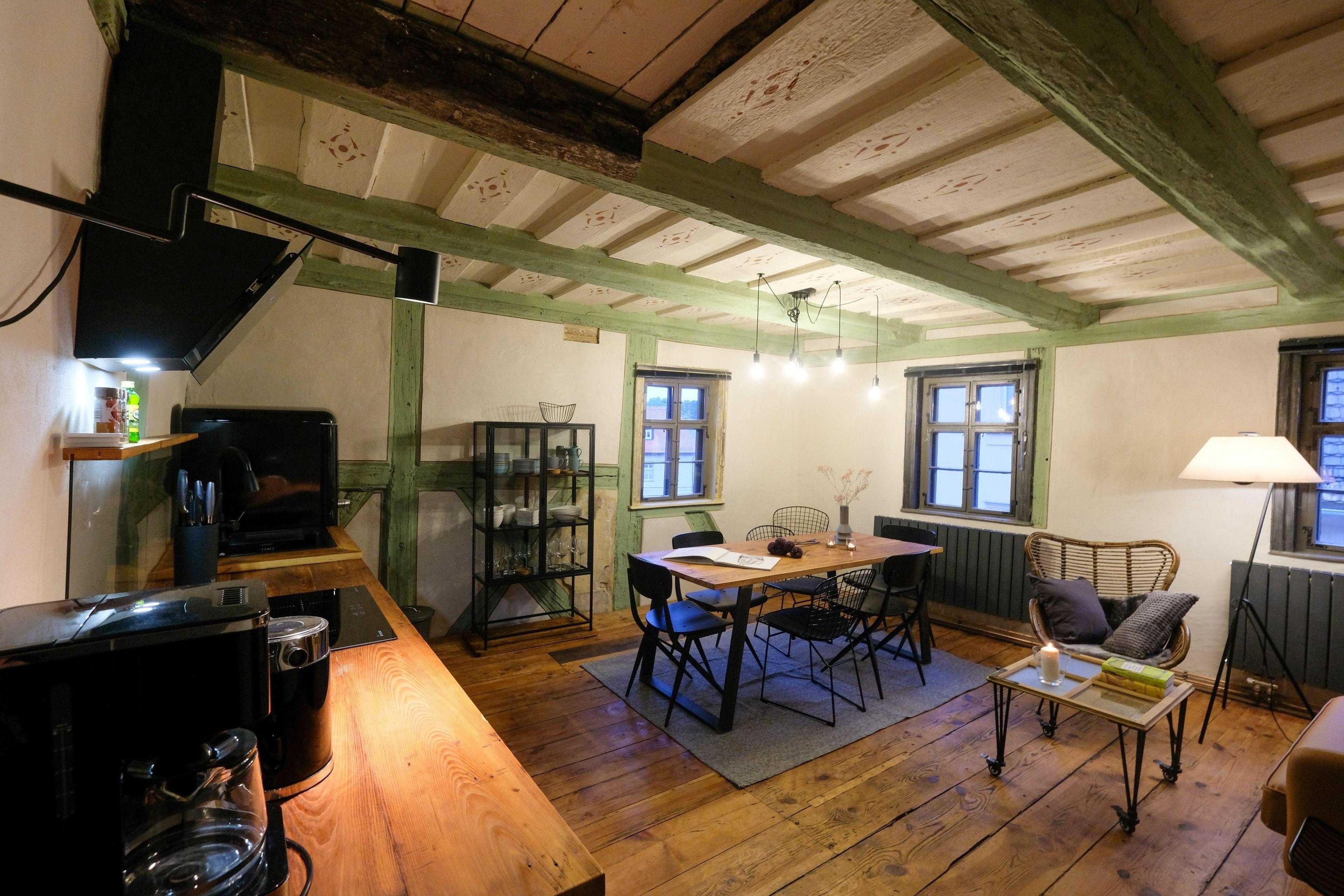 Am Anfang des 16. Jahrhunderts lies der letzte Abt von Doberlugk das Haus bauen. Großzügig über 150m2 vom Erdgeschoss über zwei Etagen ist ein Urlaubsraum für bis zu 7 Personen entstanden. Die historische Bausubstanz mit dem innenliegenden Fachwerk und den Bemalungen an Decke und Wand, die uralten Dielenböden und die in hunderten von Stunden in Handarbeit aufwendig erhaltenen alten Fenster, zeigen die Spuren der Zeit. Hier ist allein die Geschichte Architekt. Durch die sich harmonisch einfügenden, teils auch durch bewusst Kontraste setzende moderne Einrichtungselemente ist ein Ferienhaus voller Individualität entstanden, dass die Spuren seiner Vergangenheit bewusst bewahrt, erzählt und mit modernem Wohnkomfort von heute verbindet.