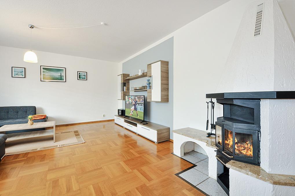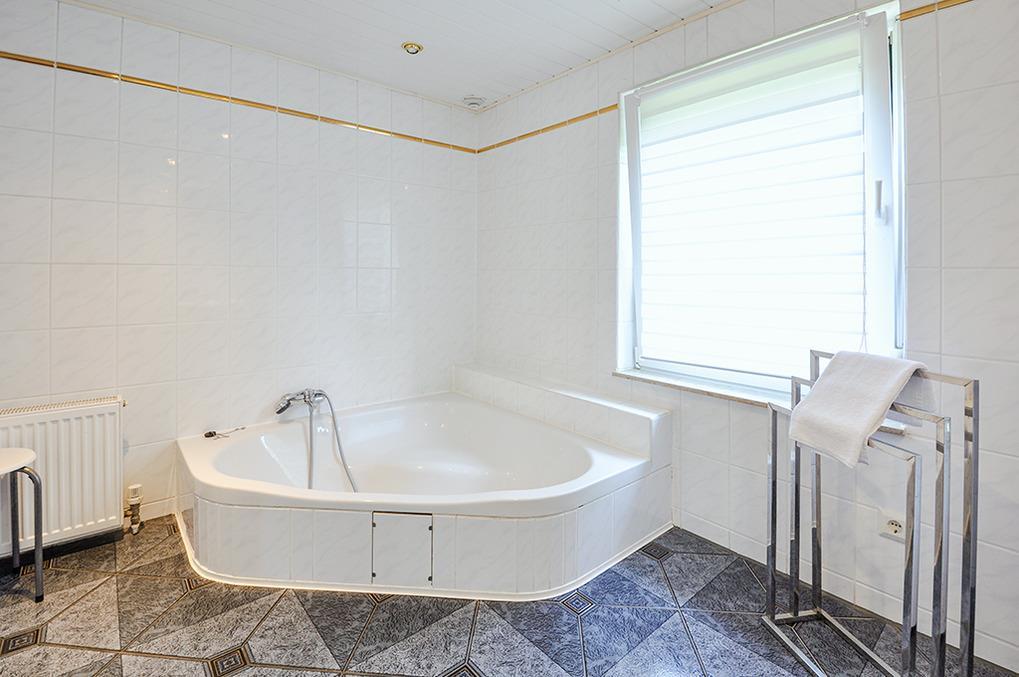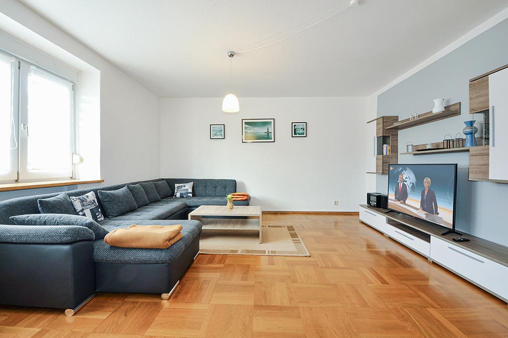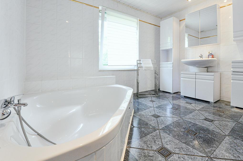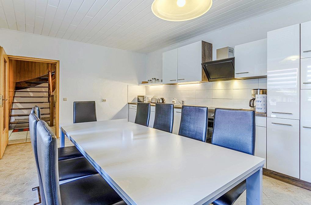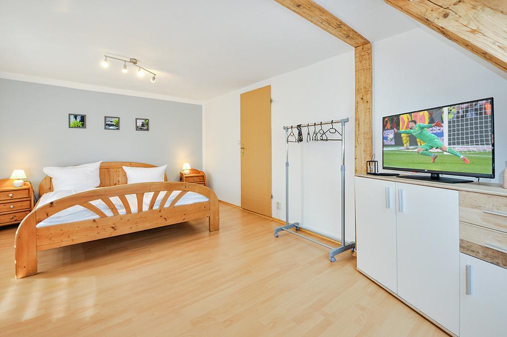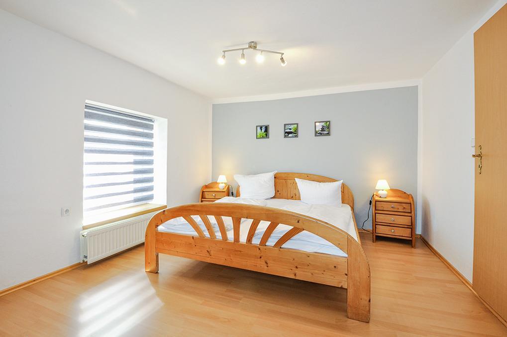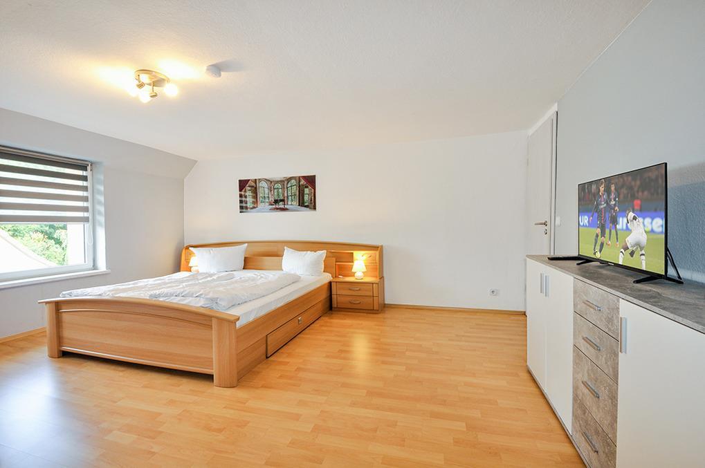 D 46.193 Ferienhaus 4-10 Pers.: 5 1/2-Zimmerhaus mit 140 qm Wohnfläche über 2 Etagen. Parterre: Flur mit Garderobe. Großzügiger Wohnraum mit Couchgarnitur (Schlafsofa 2 Pers.), Kaminofen, Sat-TV, Sitzecke. Küchen-/Essraum mit großem Esstisch, moderner Küchenzeile (Backofen, Mikrowelle, Gefrierschrank, Spülmaschine). Bad: Eck-Badewanne, Wb, WC. 1. Etage (leichte Schrägen): 1-Bettzimmer. 2 schöne Doppelzimmer mit TV. Großes 4-Bettzimmer mit Doppelbett, Schlafsofa (2 Pers.), TV. Bad: Dusche, Wb, WC. Überdachter Balkon mit schönem Blick ins Grüne.